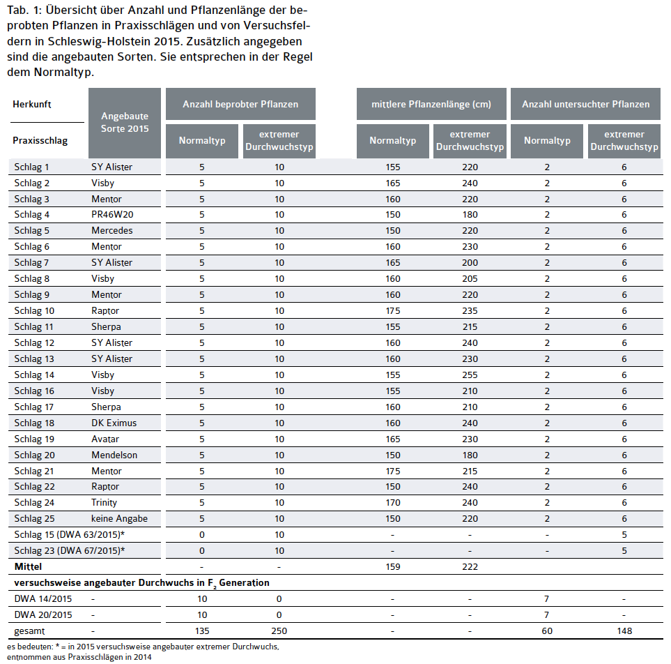 Die Frage der Abstammung der extremen Durchwuchspflanzen wurde an Pflanzenmaterial bearbeitet, welches im Frühjahr 2015 aus Praxisschlägen gewonnen wurde. Dazu wurden auf 23 Schlägen gegen Ende der Blüte Blattproben sowohl von extremen Durchwuchspflanzen wie auch von Pflanzen, die einen normalen Phänotyp hatten, entnommen. Je Schlag wurden 10 phänotypisch stark abweichende Durchwuchspflanzen und 5 phänotypisch normale Pflanzen beprobt. Die normalen Pflanzen können dabei aus der angebauten Sorte oder aus normalwüchsigem Durchwuchs stammen. Aus zwei Schlägen waren bereits 2014 extreme Durchwuchspflanzen geerntet und deren Nachkommenschaft 2015 in Beobachtungsparzellen angebaut worden. Aus ihnen wurden je 10 Pflanzen beprobt. Zum Vergleich sind auch Pflanzen aus „definiertem“ Durchwuchs aus zwei F2-en beprobt worden. Die Untersuchungen sind arbeits- und kostenintensiv, so dass nicht alle beprobten Pflanzen bearbeitet werden konnten. Aus den Praxisschlägen wurden je 2 Normal und je 6 extreme Durchwuchstypen untersucht. In Tabelle 1 sind die Rapsschläge mit den angebauten Sorten, die Anzahl der beprobten und untersuchten Pflanzen sowie die mittlere Pflanzenlänge der beprobten Pflanzen dargestellt. Die stark abweichenden Durchwuchspflanzen waren im Mittel rund 60 cm länger als die normalen Pflanzen.