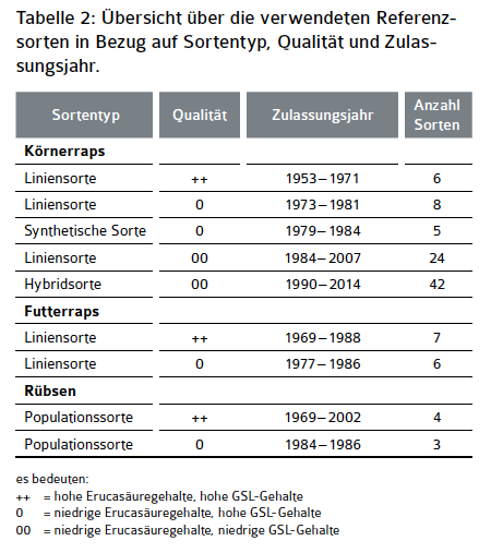 Als Referenzsorten wurden 98 Winterrapssorten, bei denen es sich im Wesentlichen um Körnerrapse, aber auch um Futterrapse gehandelt hat, im Gewächshaus angezogen und ebenfalls über Blattmuster beprobt. Das Saatgut dieser Sorten wurde über die Genbank des IPK Gatersleben oder direkt von den Züchterhäusern bereitgestellt. Es handelt sich um Sorten, die seit Anfang der 1970er Jahre in Schleswig-Holstein angebaut wurden. Darin enthalten sind die bis 1974 im Anbau befindlichen ++-Körnerrapssorten, die hohe Erucasäuregehalte und hohe GSL-Gehalte im Samen hatten. Es folgen zahlreiche 0-Sorten, und darauf die später angebauten 00-Sorten, darunter sowohl Liniensorten als auch Hybridsorten. Ähnlich sieht es bei den Futterrapssorten aus. Eine Übersicht über die Anzahl der verwendeten Referenzsorten mit Angaben zum Sortentyp, zu ihrer Qualität und zu den Zulassungsjahren gibt die Tabelle 2. Bei allen Sorten handelt es sich um Winterformen. Es ist jedoch darauf hinzuweisen, dass von rund 100 weiteren Sorten, die infrage gekommen sind und angefragt wurden, kein Saatgut mehr verfügbar war.