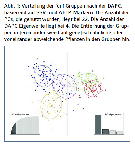 Die Verteilung der Pflanzen in Gruppen ist in Abbildung 1 dargestellt. Die Grafik in der linken unteren Ecke der Abbildung zeigt die Anzahl der PCs (Principal Components), die für die DAPC (Discriminant Analysis of Principal Components) genutzt wurden, und welchen Anteil der Gesamtvariation sie erklären. In der rechten unteren Ecke der Abbildung ist die Anzahl der Eigenwerte der DAPC dargestellt, die genutzt wurden. In der Mitte der Abbildung sind die einzelnen Pflanzen in Abhängigkeit ihrer Gruppenzugehörigkeit abgebildet. Dabei entspricht die Entfernung zwischen den Gruppen der genetischen Ähnlichkeit bzw. Abweichung der Gruppen untereinander. Insgesamt konnten 5 Gruppen gebildet werden.