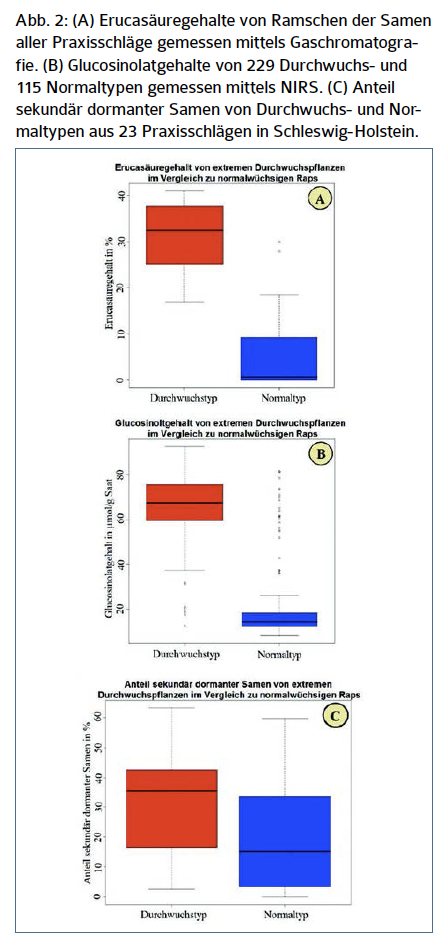 Die Werte für beide Qualitätsparameter bestätigen damit die Ergebnisse der Genomuntersuchungen. Die erhöhten Gehalte an Erucasäure wie an Glucosinolaten sprechen für eine Abstammung dieser Pflanzen von alten Sorten, seien es Körnerrapse oder Futterrapse. Dass es auch bei den Normaltypen einzelne Pflanzen mit erhöhten Gehalten gab, könnte daran liegen, dass es in den Jahrzehnten nach der Umstellung auf Qualitätsraps zu Kreuzungen zwischen Durchwuchs in alter Qualität mit den Pflanzen der jeweils angebauten 00-Sorte gekommen ist. Aus diesen Kreuzungen können auch Durchwuchspflanzen entstehen, die einen normalen Wuchstyp haben, aber in der Qualität den alten Elternsorten ähneln. Ein weiterer Grund für das Auftreten solcher Pflanzen in diesen Untersuchungen kann in der subjektiven Zuordnung der Pflanzen im Feld zu den beiden Wuchstypen liegen.
