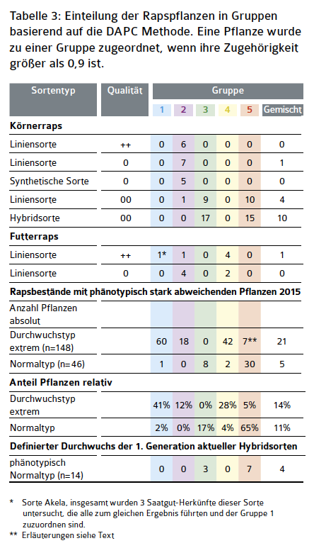Die extremen Durchwuchstypen lassen sich durch ihren genetischen Fingerabruck klar von den Normaltypen unterscheiden. Ein weiteres Indiz dafür ist der Heterozygotiegrad. Dieser ist in den Referenz-Hybridsorten ähnlich hoch wie in den Normaltypen, was darauf hinweist, dass die Auswahl der Pflanzen im Wesentlichen korrekt war. Klare Unterschiede gibt es auch zwischen modernen und älteren Rapssorten. Die Gruppen 3 und 5 enthalten dabei neben den modernen Rapssorten mit 00-Qualität auch die Mehrzahl an „normalen“ Pflanzen, sowie auch den „definierten Durchwuchs“, welcher aus dem gezielten Anbau von F2-Populationen stammt und dem normalen Durchwuchs zuzuordnen ist. Von den sieben extremen Durchwuchstypen in Gruppe 5 stammen sechs Pflanzen von Praxisschlag 12, bei dem die Unterscheidung zwischen extremen Durchwuchs- und Normaltypen schwieriger war als bei den anderen Schlägen. Dies dürfte eine Erklärung dafür sein, warum diese sechs Durchwuchstypen dort gruppieren.