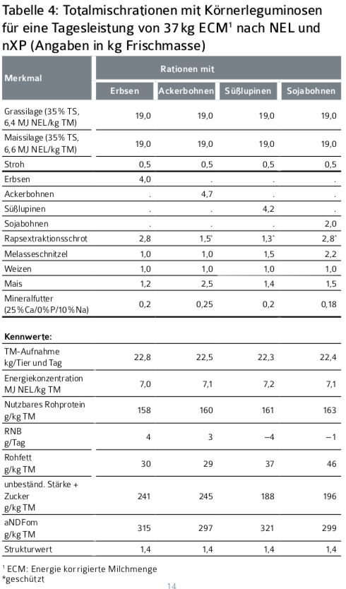 Wegen des höheren Rohfettgehalts der Sojabohnen ist deren Einsatzmenge auf etwa 2 kg begrenzt. Mit 46 g/kg TM wird in dieser Ration der höchste Rohfettgehalt ausgewiesen. Bei dieser Konzentration liegt die Rohfettaufnahme aber noch innerhalb der physiologischen Vorgaben, so dass eine Beeinträchtigung der Fermentationsvorgänge im Pansen nicht zu befürchten ist. Die Beispiele haben gezeigt, dass von Erbsen, Ackerbohnen und Süßlupinen 4 bis 5 kg je Kuh und Tag gut eingesetzt werden können. Bei den eiweißärmeren Erbsen sind zur Deckung des Proteinbedarfs Extraktionsschrote in Mengen von knapp 3 kg erforderlich. Rationen mit Ackerbohnen und Lupinen erfordern den Einsatz von geschütztem Rapsextraktionsschrot in einer Menge von etwa 1,5kg, um eine überhöhte Stickstoffzufuhr zu verhindern.