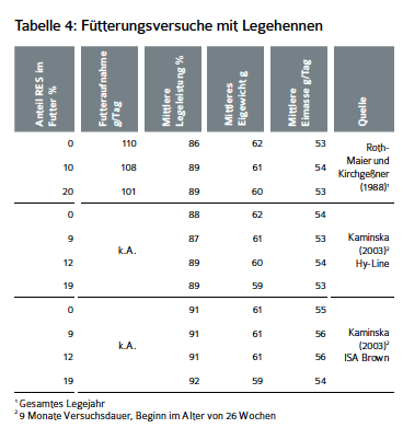 Es liegen einige Fütterungsversuche mit Legehennen zum Einsatz von Rapsextraktionsschrot vor. In Tabelle 4 sind Ergebnisse zusammengefasst, die unter praxisnahen Institutsbedingungen durchgeführt wurden. Schon eine ältere Arbeit aus dem Jahre 1988 zeigte ein Potenzial zum Einsatz von Rapsextraktionsschrot im Mischfutter im Bereich zwischen 10 und 20 %. Zur damaligen Zeit waren die Gehalte an Glucosinolaten noch deutlich höher als heute. Neuere Untersuchungen bestätigen diesen Einsatzbereich. Die Ergebnisse zeigen, dass bis zu einem Rapsextraktionsschrotanteil von 10 % es in keiner der Untersuchungen zu negativen Einflüssen auf die Futteraufnahme oder Merkmale der Leistung der Hennen gekommen ist.