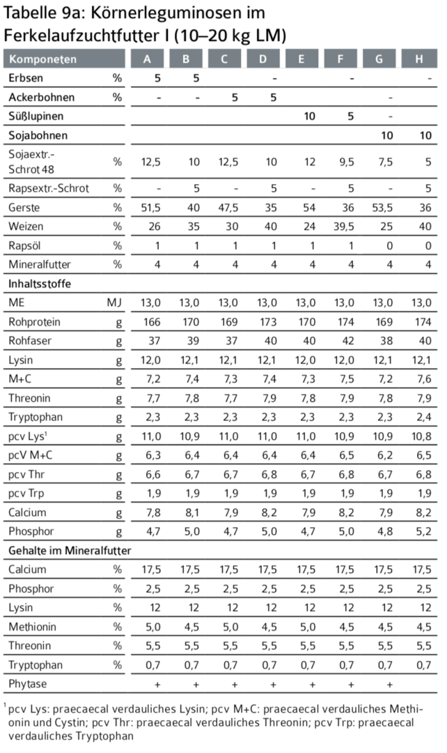 In vergleichenden Untersuchungen an Ferkeln zeigte der Einsatz von jeweils 6 % Ackerbohnen, Erbsen oder Blauen Süßlupinen im Ferkelaufzuchtfutter I und von jeweils 10 % Ackerbohnen, Erbsen oder Blauen Sü.lupinen im Ferkelaufzuchtfutter II keine signifikanten Effekte gegenüber einer Kontrollration auf der Basis von Sojeextraktionsschrot (Preißinger et al., 2018). In einem neueren Versuch mit Weißen Sü.lupinen und Einsatzmengen von 5 % im Ferkelaufzuchtfutter I sowie 10 % im Ferkelaufzuchtfutter II ergab sich ein signifikanter Rückgang im Futterverbrauch sowie in der Wachstumsleistung bei Umstellung auf 10 % Weiße Sü.lupinen sowie in der gesamten Aufzucht (Tabelle 4b). Die Sojabohne kann dagegen, wie Wetscherck et al. (2013) zeigten, bedenkenlos in einer Höhe von 10 % beim Ferkel eingesetzt werden. Um ausreichend genaue Einsatzempfehlungen zu geben, sind weitere Versuche erforderlich