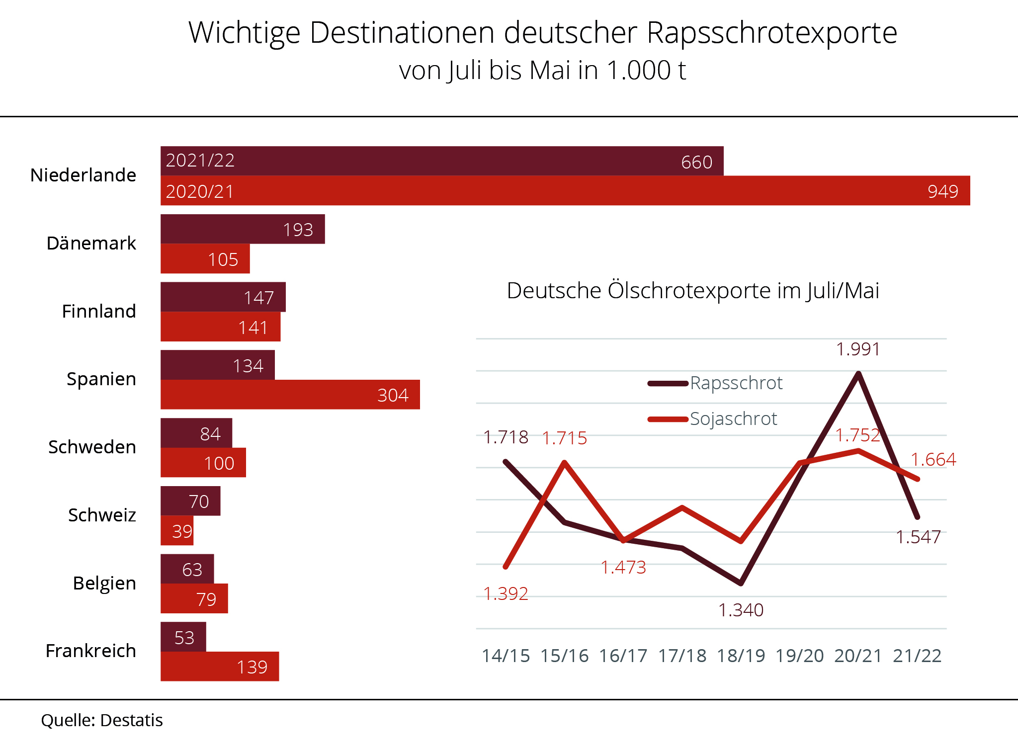 Insgesamt hat Deutschland nach Angaben des Statistischen Bundesamtes von Juli 2021 bis Mai 2022 gut 1,5 Mio. t Rapsschrot exportiert und damit etwa 22 % weniger als im Vorjahreszeitraum. Es ist die kleinste Menge seit 3 Jahren. Das lag zum einen an der geringeren Verfügbarkeit. In deutschen Ölmühlen fielen im genannten Zeitraum mit 4,8 Mio. t rund 5,5 % weniger an, wodurch das Exportpotenzial limitiert wurde. Auf der anderen Seite bremsten die vergleichsweise hohen Marktpreise das Kaufinteresse aus dem Ausland. Das Protein im Rapsschrot war von Oktober 2021 bis Mai 2022 teurer bzw. preisidentisch mit Protein aus GVO-Sojaschrot. In Ländern, in denen die GVO-Freiheit von Futtermitteln keine große Rolle spielt, wurde daher eher auf Sojaschrot als auf die Alternative zurückgegriffen.