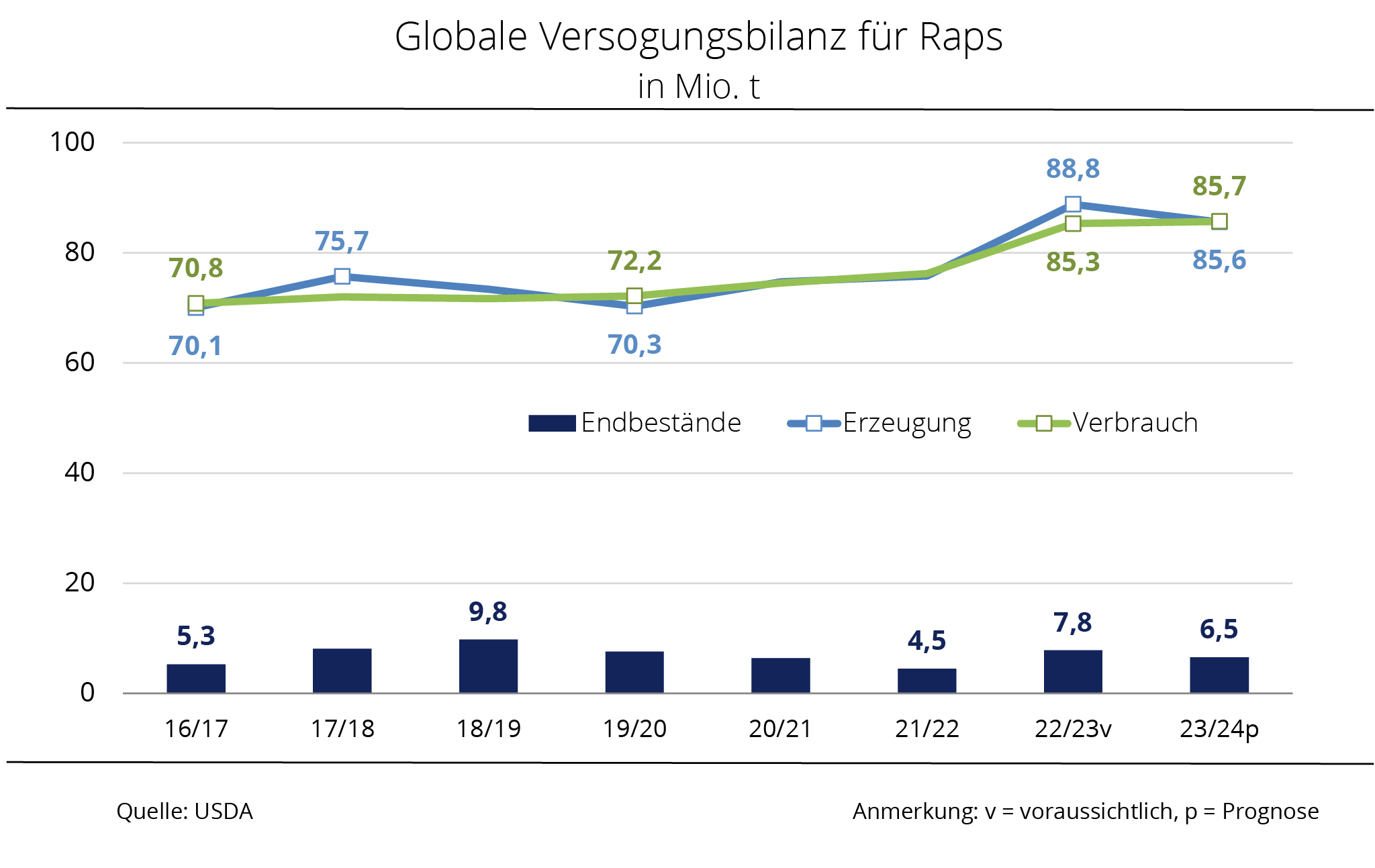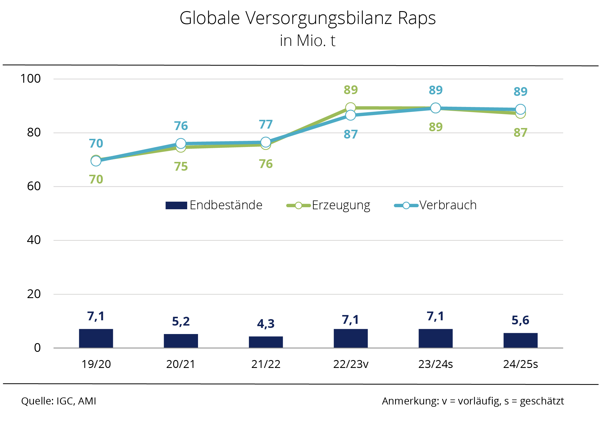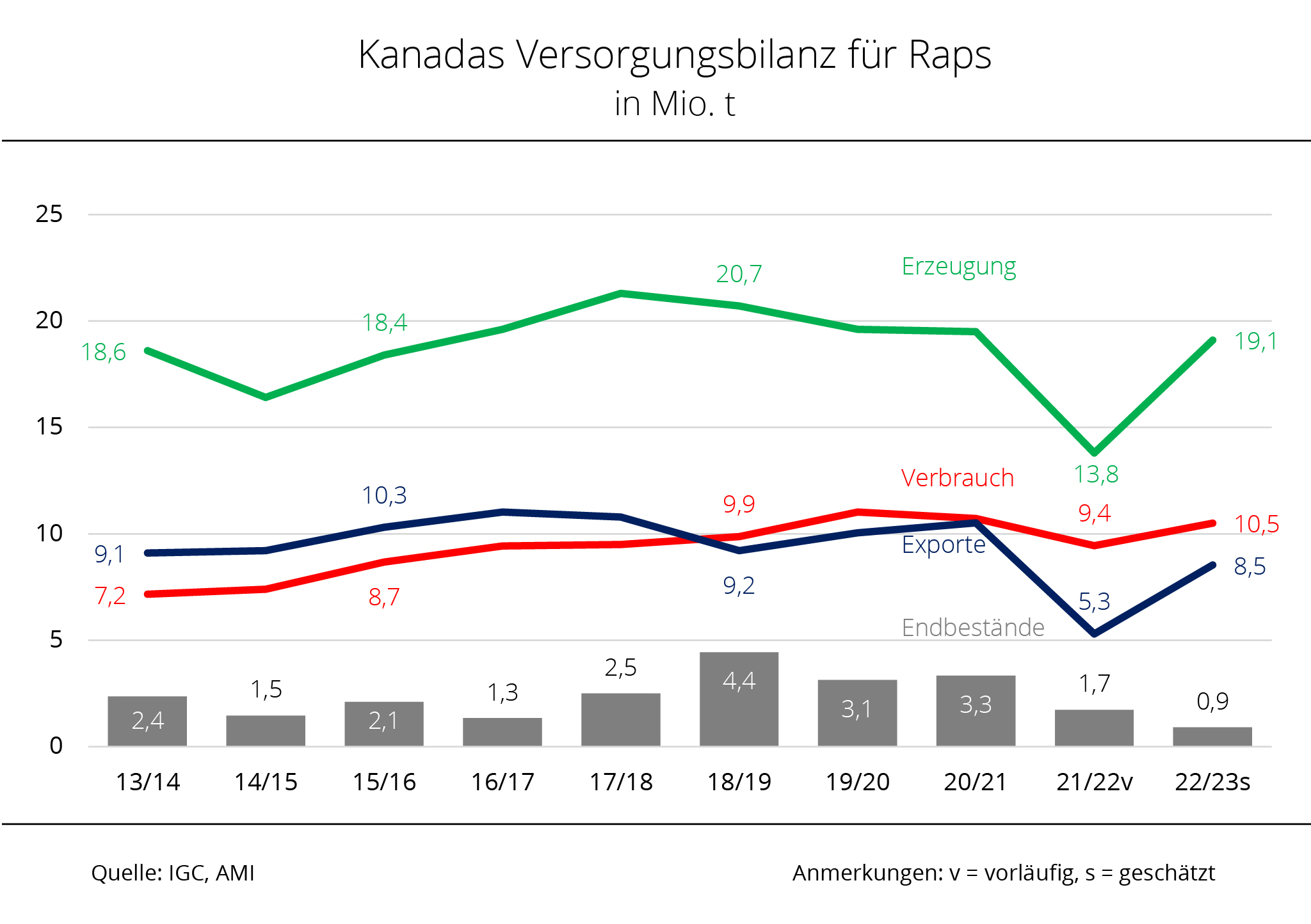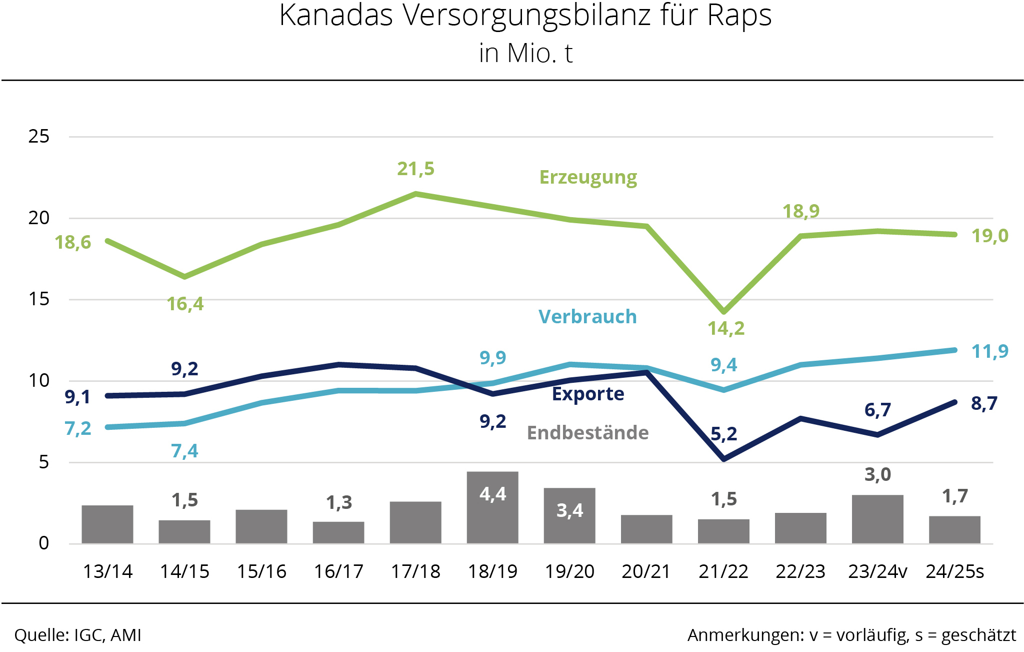 Bei einem inländischen Rapsverbrauch von 10,5 Mio. t, rund 1,1 Mio. t mehr als im vergangenen Wirtschaftsjahr, ergibt sich ein Überschuss von 8,6 Mio. t. Dennoch dürften die Vorräte angesichts der geringen Anfangsbestände mit 900.000 t deutlich hinter dem Vorjahresvolumen von 1,7 Mio. t zurückbleiben. Angesichts der größeren kanadischen Erzeugung dürften, nach Einschätzung der AMI, die Rapsexporte mit rund 8,5 Mio. t deutlich zunehmen. Das wären 60,3 % mehr als noch im Vorjahr. Der inländische Verbrauch könnte ebenfalls zunehmen. Mit prognostizierten 10 Mio. t läge er 16,3 % über dem Vorjahresvolumen.