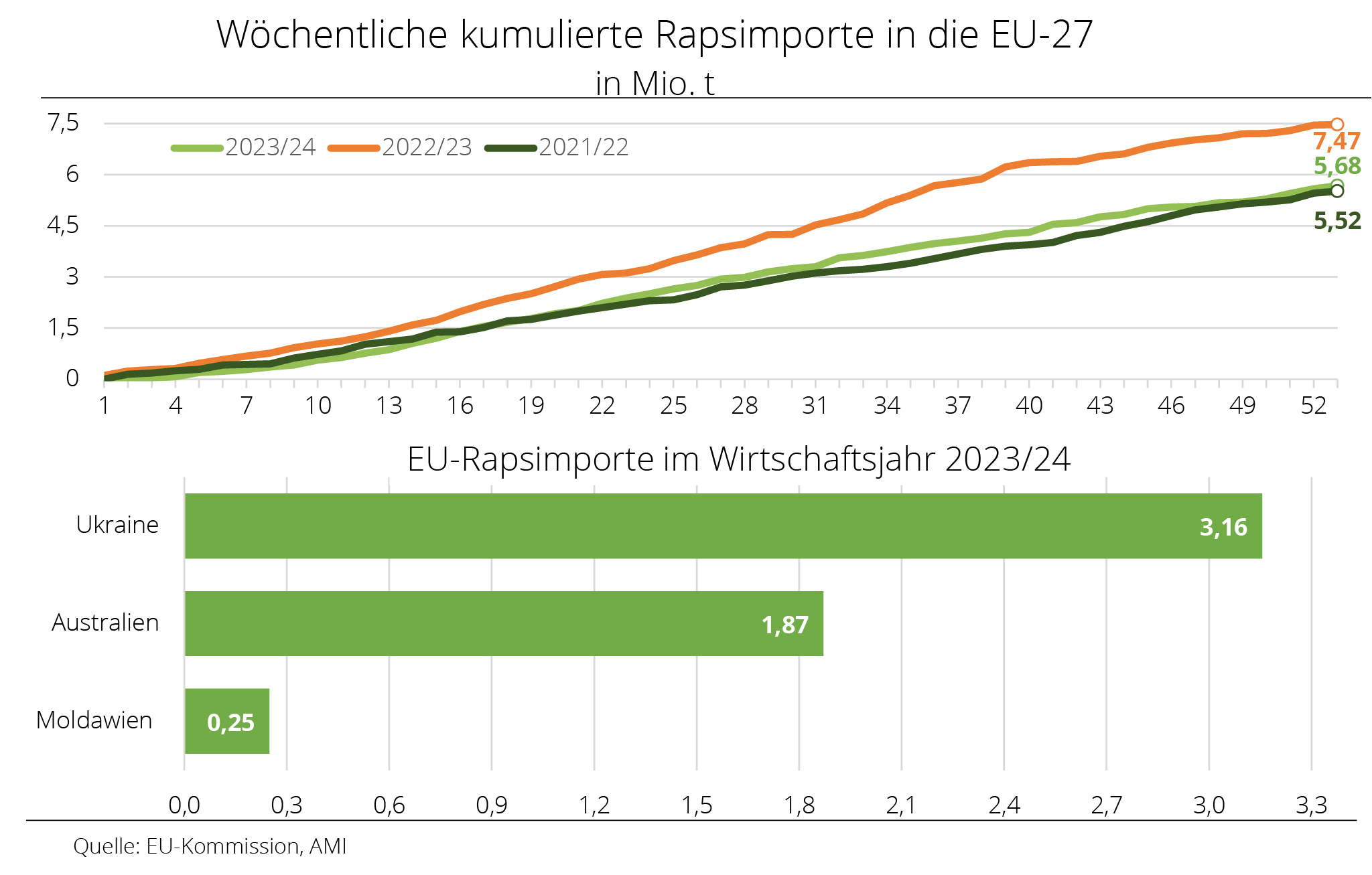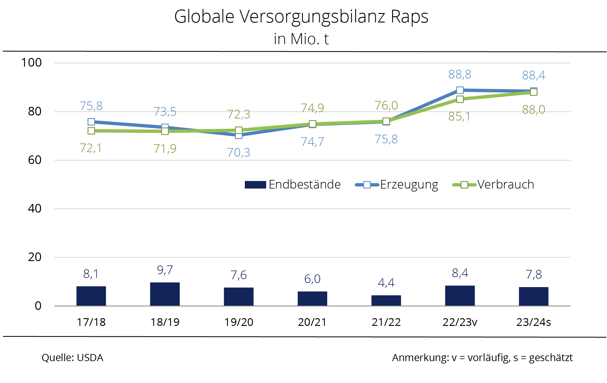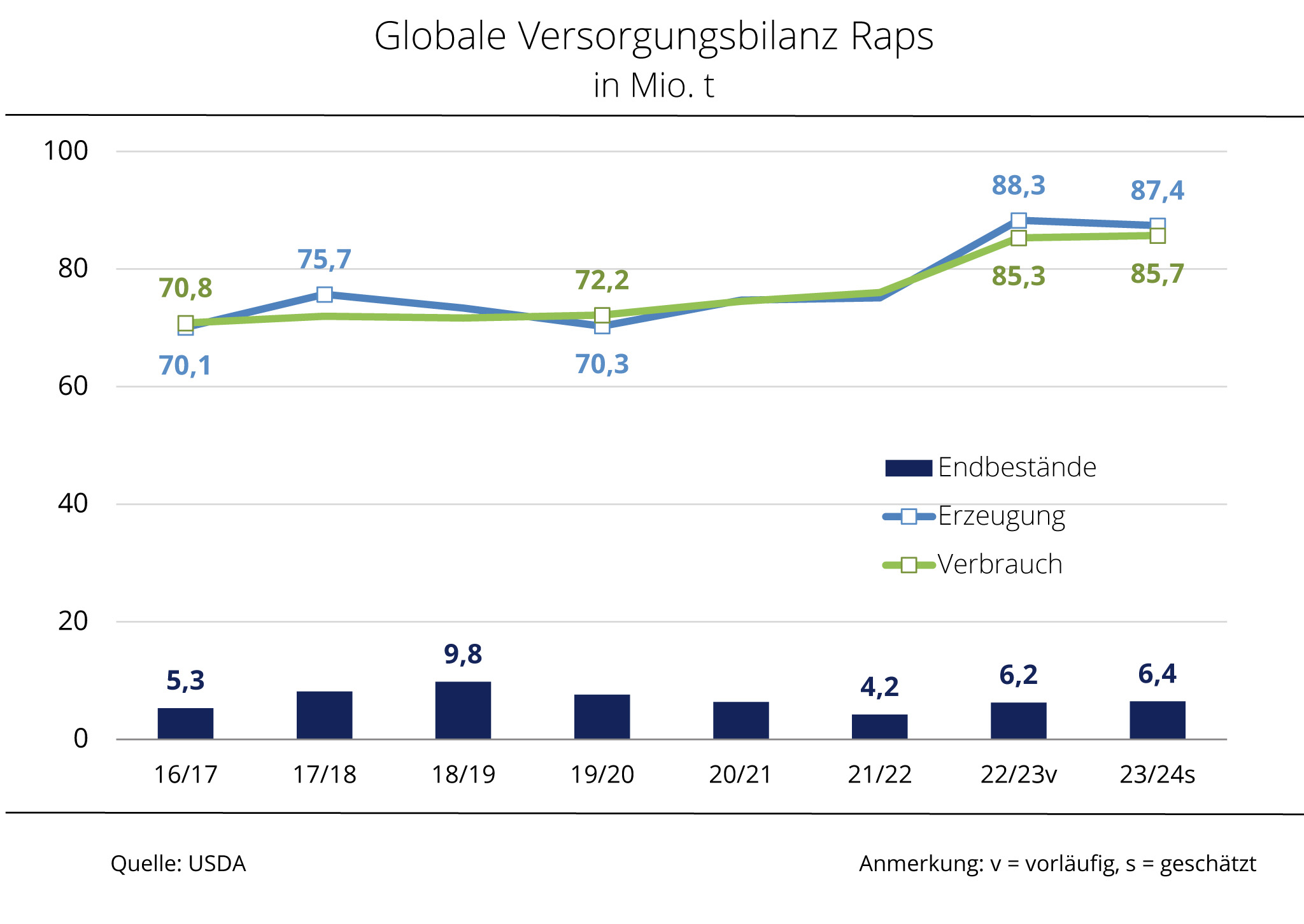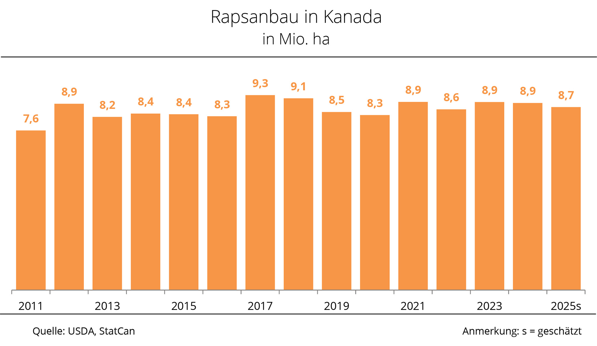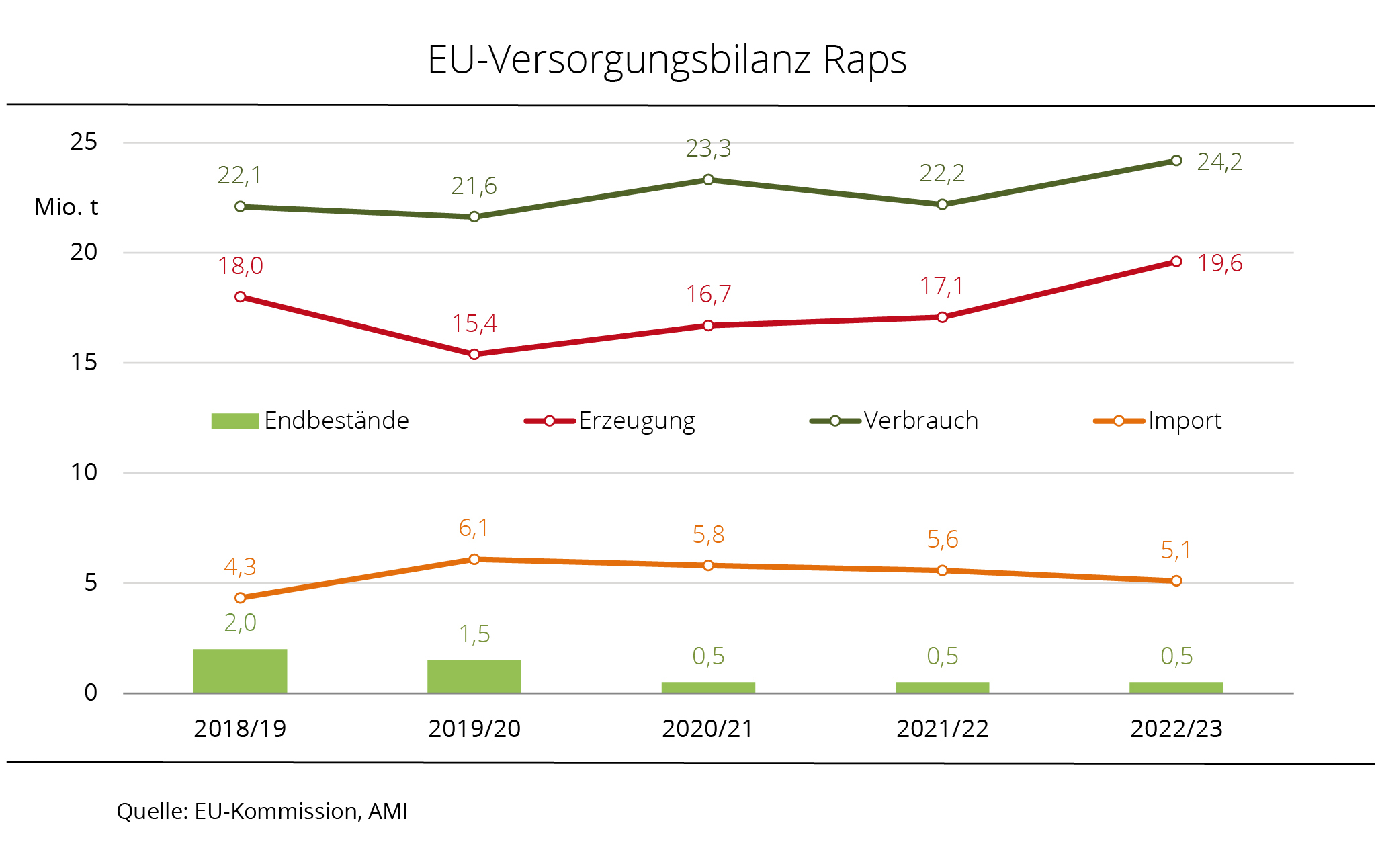 Bei einem inländischen Rapsverbrauch von 10,5 Mio. t, rund 1,1 Mio. t mehr als im vergangenen Wirtschaftsjahr, ergibt sich ein Überschuss von 8,6 Mio. t. Dennoch dürften die Vorräte angesichts der geringen Anfangsbestände mit 900.000 t deutlich hinter dem Vorjahresvolumen von 1,7 Mio. t zurückbleiben. Angesichts der größeren kanadischen Erzeugung dürften, nach Einschätzung der AMI, die Rapsexporte mit rund 8,5 Mio. t deutlich zunehmen. Das wären 60,3 % mehr als noch im Vorjahr. Der inländische Verbrauch könnte ebenfalls zunehmen. Mit prognostizierten 10 Mio. t läge er 16,3 % über dem Vorjahresvolumen.