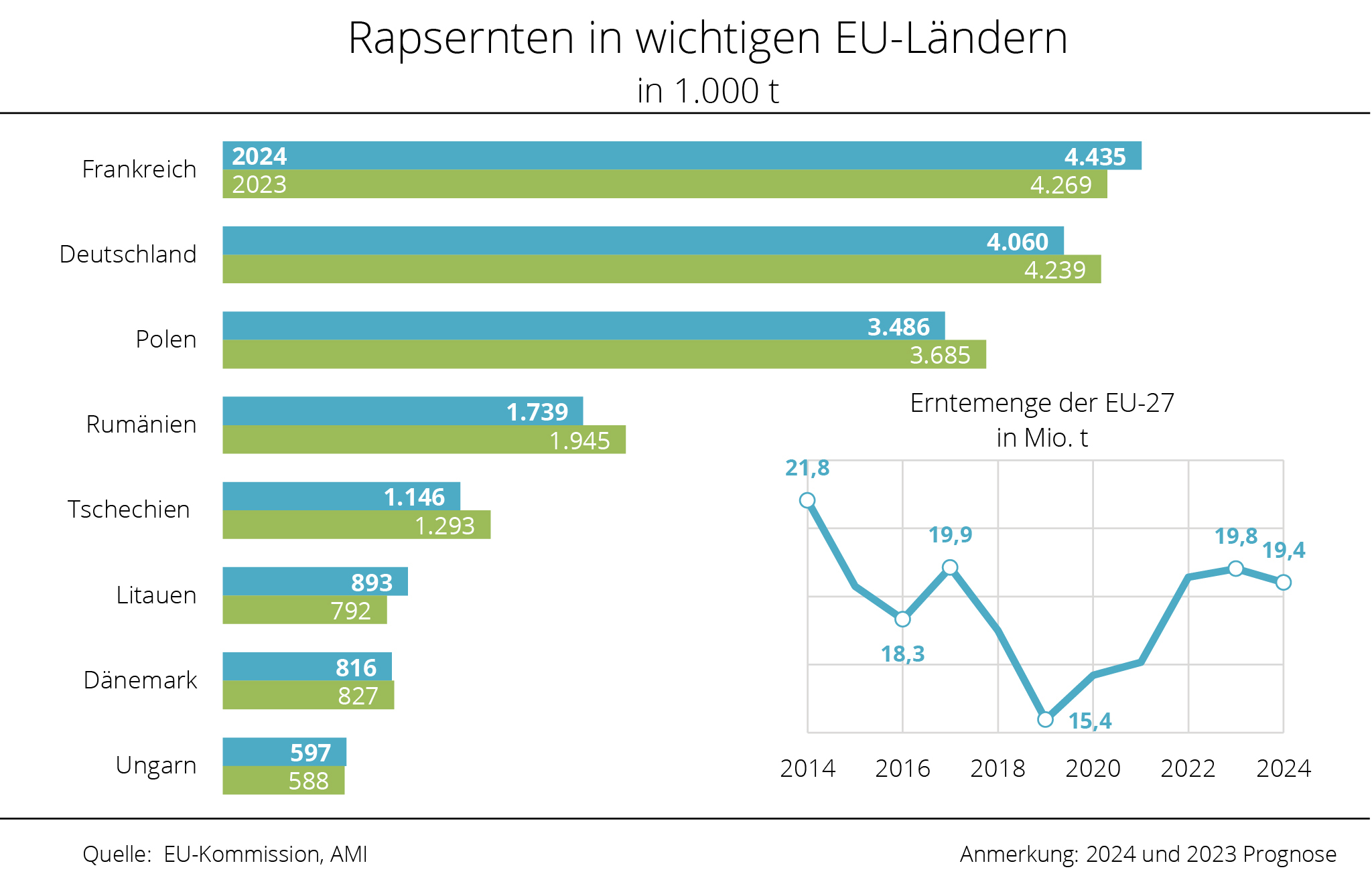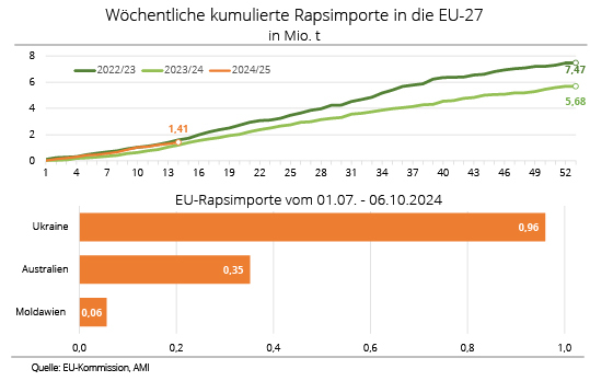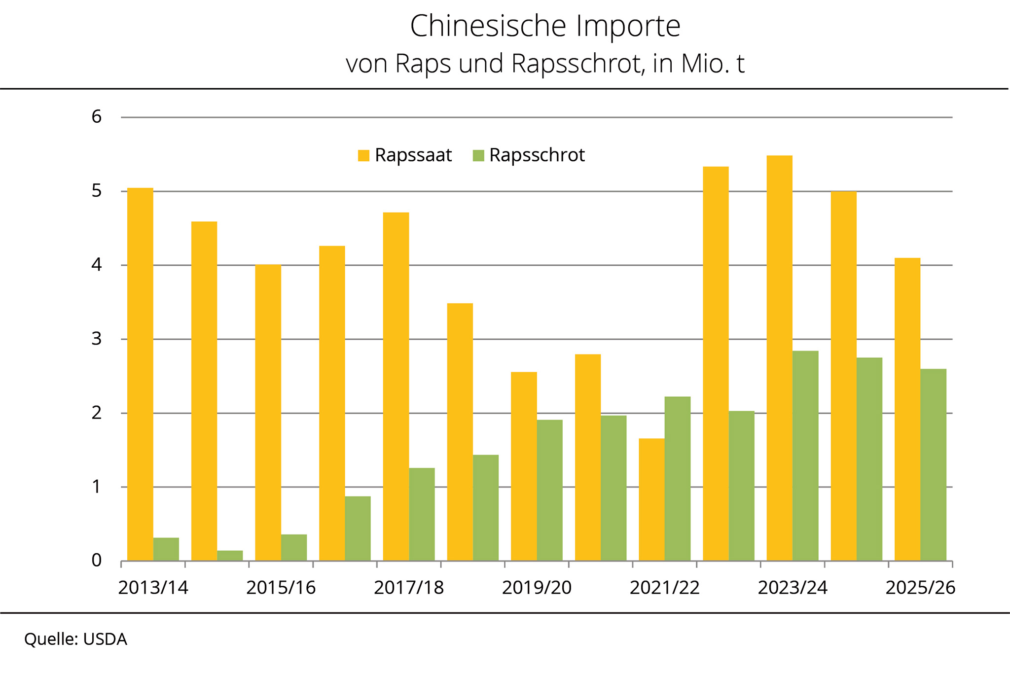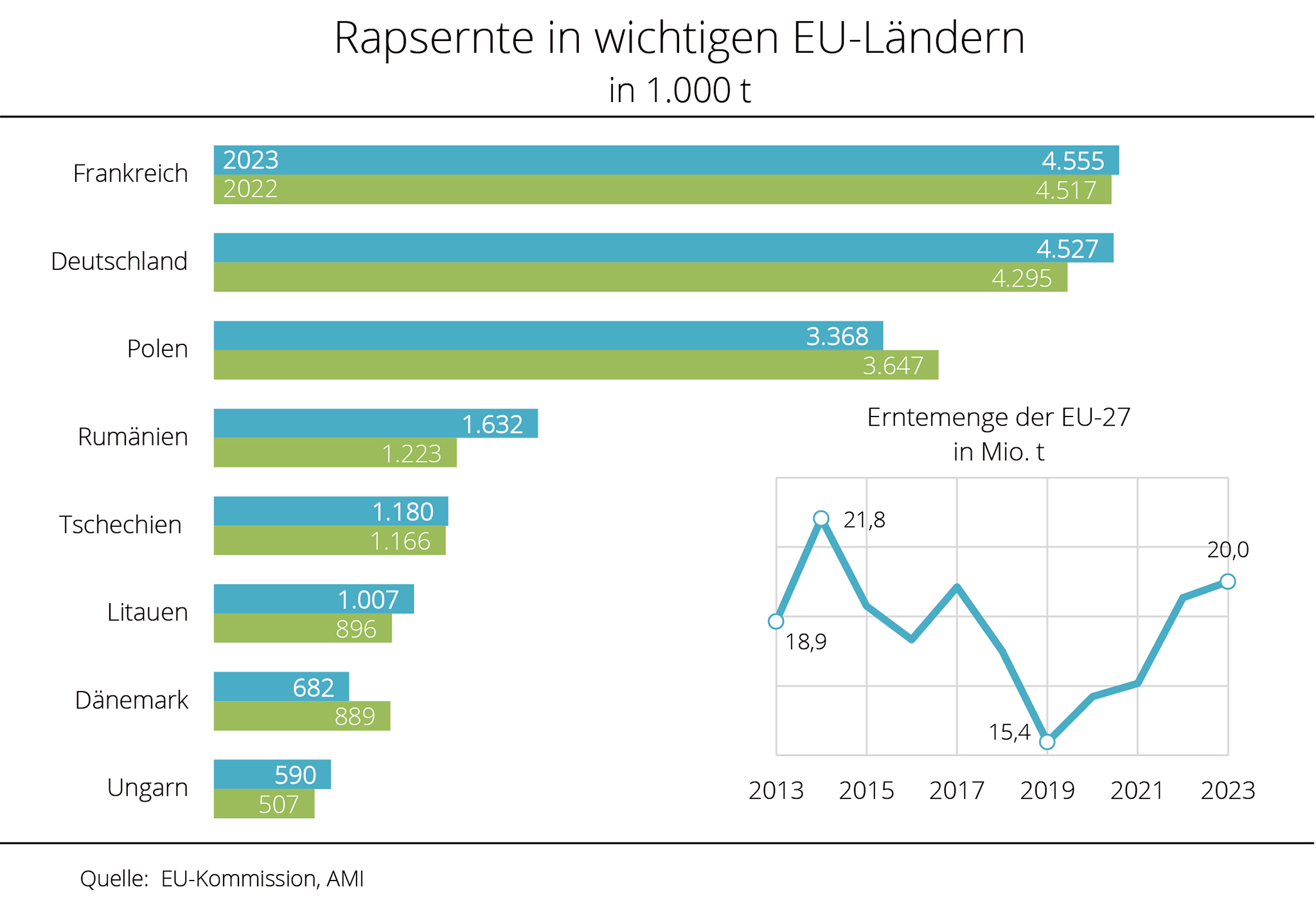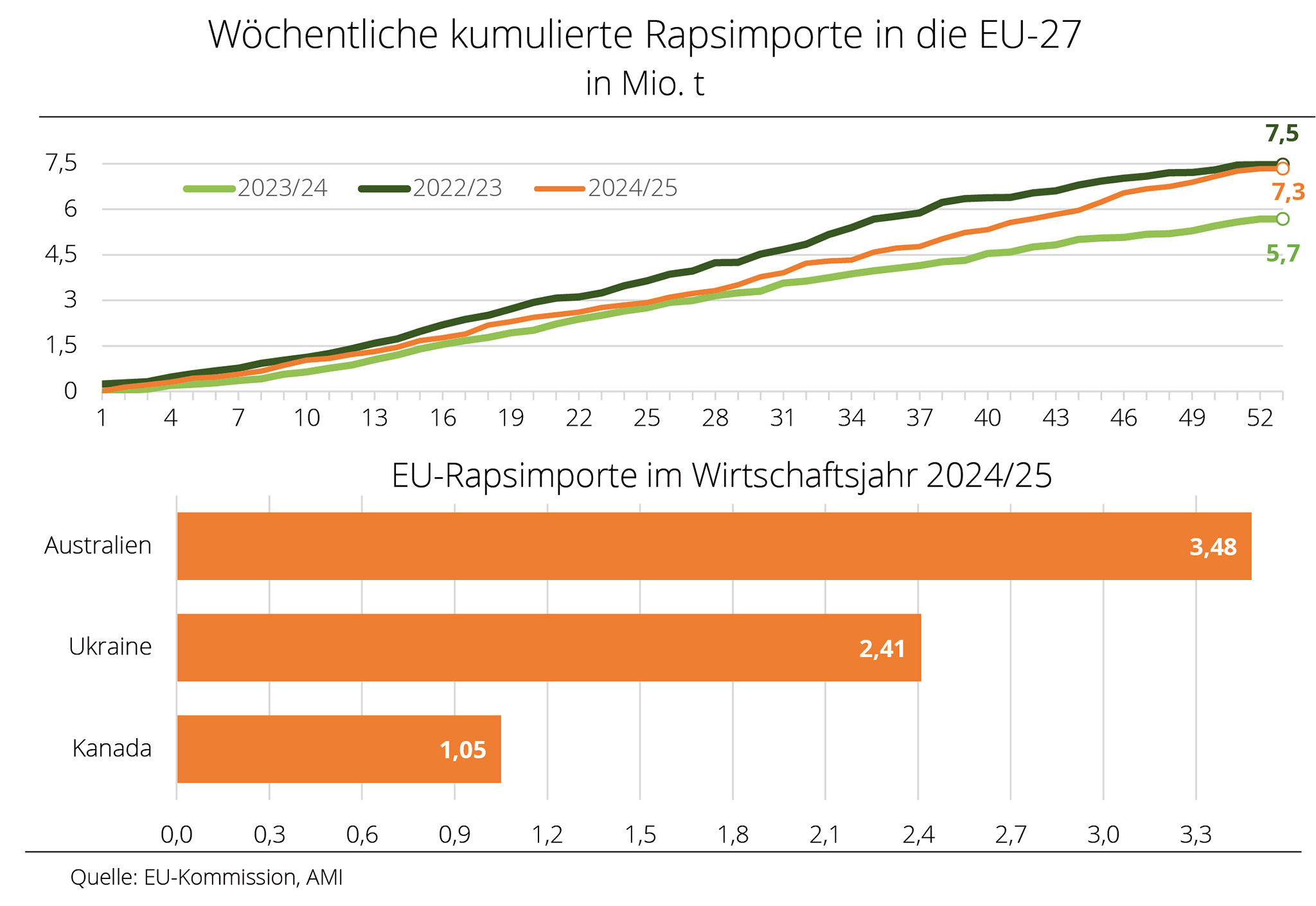 Bei einem inländischen Rapsverbrauch von 10,5 Mio. t, rund 1,1 Mio. t mehr als im vergangenen Wirtschaftsjahr, ergibt sich ein Überschuss von 8,6 Mio. t. Dennoch dürften die Vorräte angesichts der geringen Anfangsbestände mit 900.000 t deutlich hinter dem Vorjahresvolumen von 1,7 Mio. t zurückbleiben. Angesichts der größeren kanadischen Erzeugung dürften, nach Einschätzung der AMI, die Rapsexporte mit rund 8,5 Mio. t deutlich zunehmen. Das wären 60,3 % mehr als noch im Vorjahr. Der inländische Verbrauch könnte ebenfalls zunehmen. Mit prognostizierten 10 Mio. t läge er 16,3 % über dem Vorjahresvolumen.