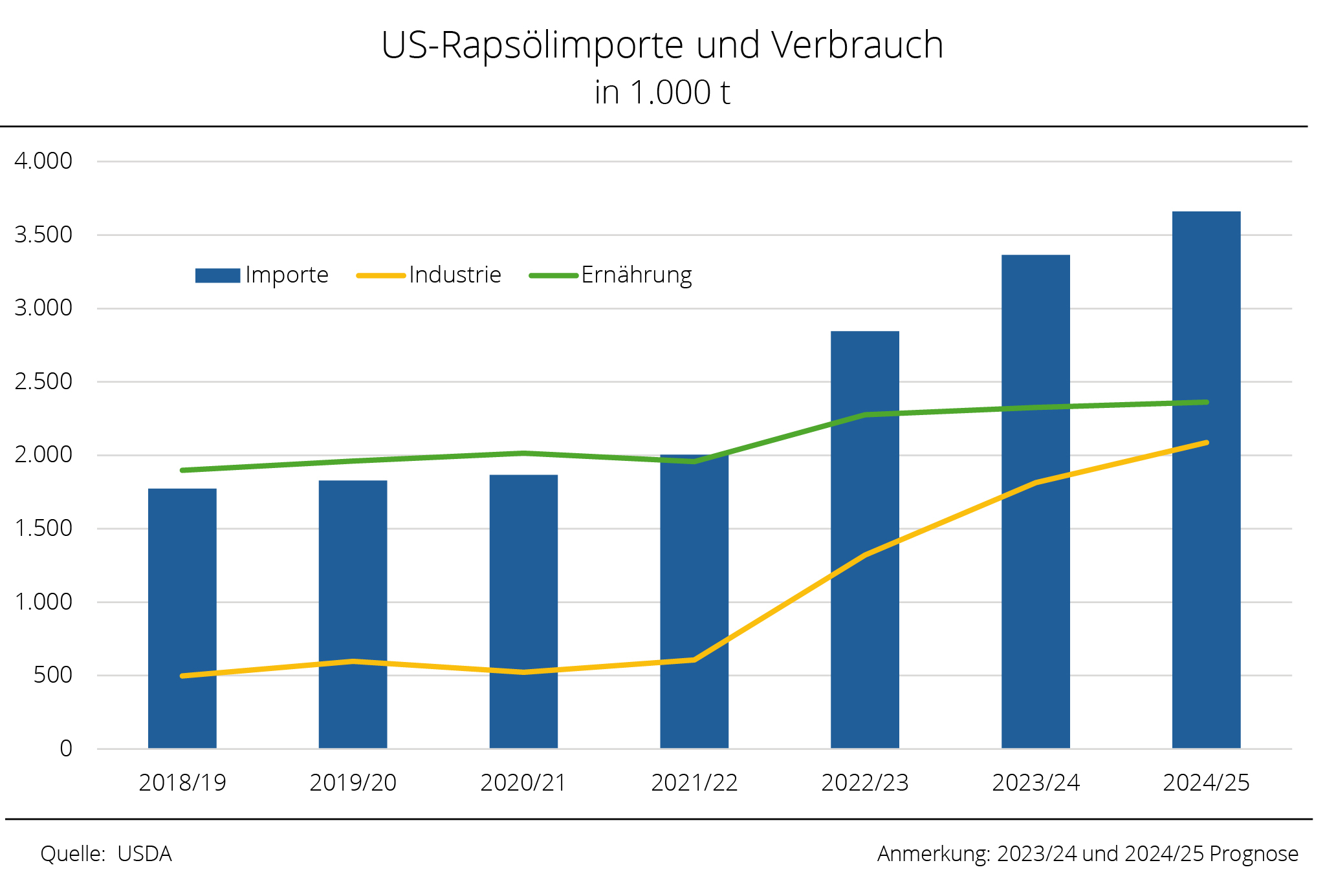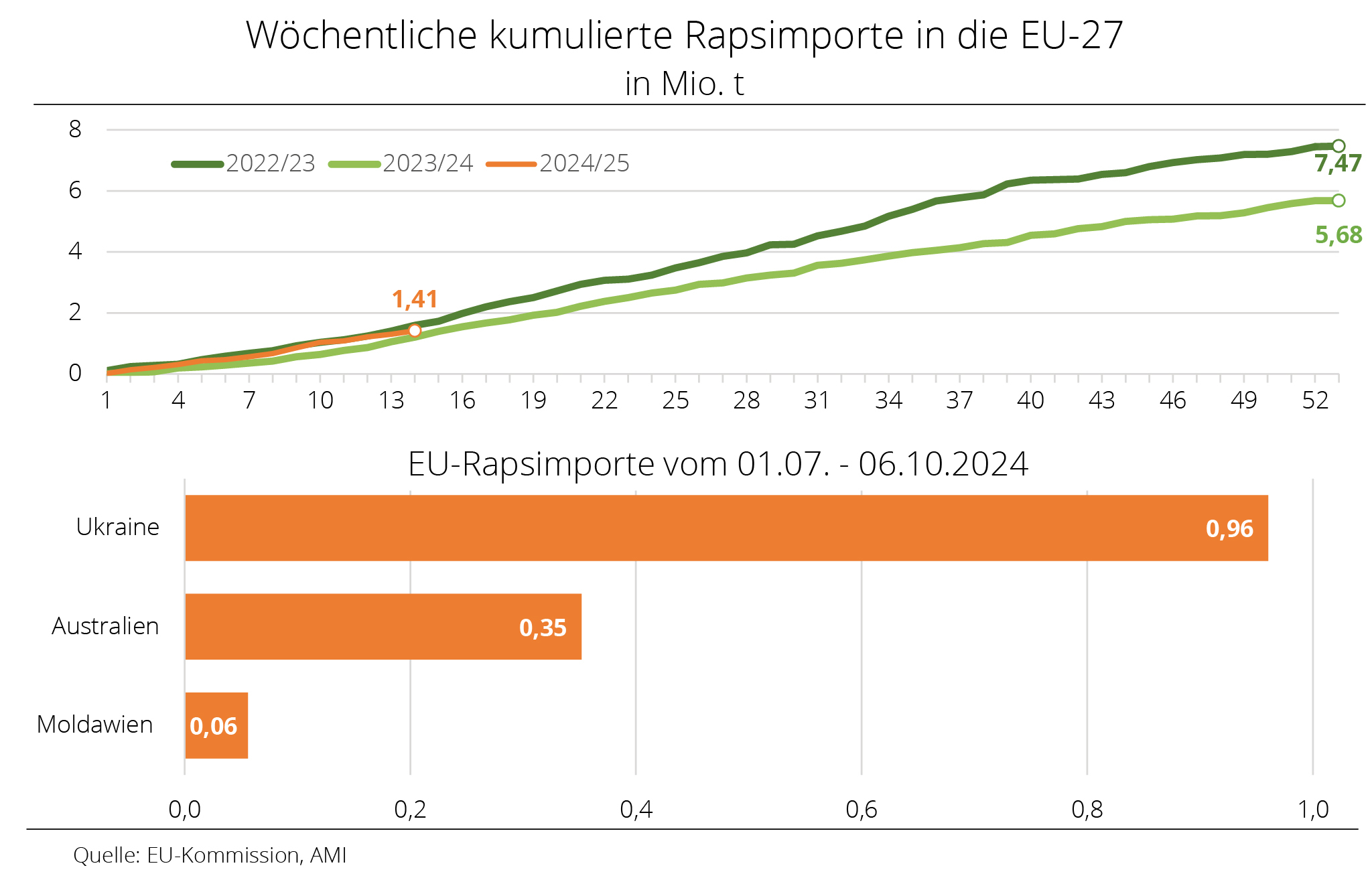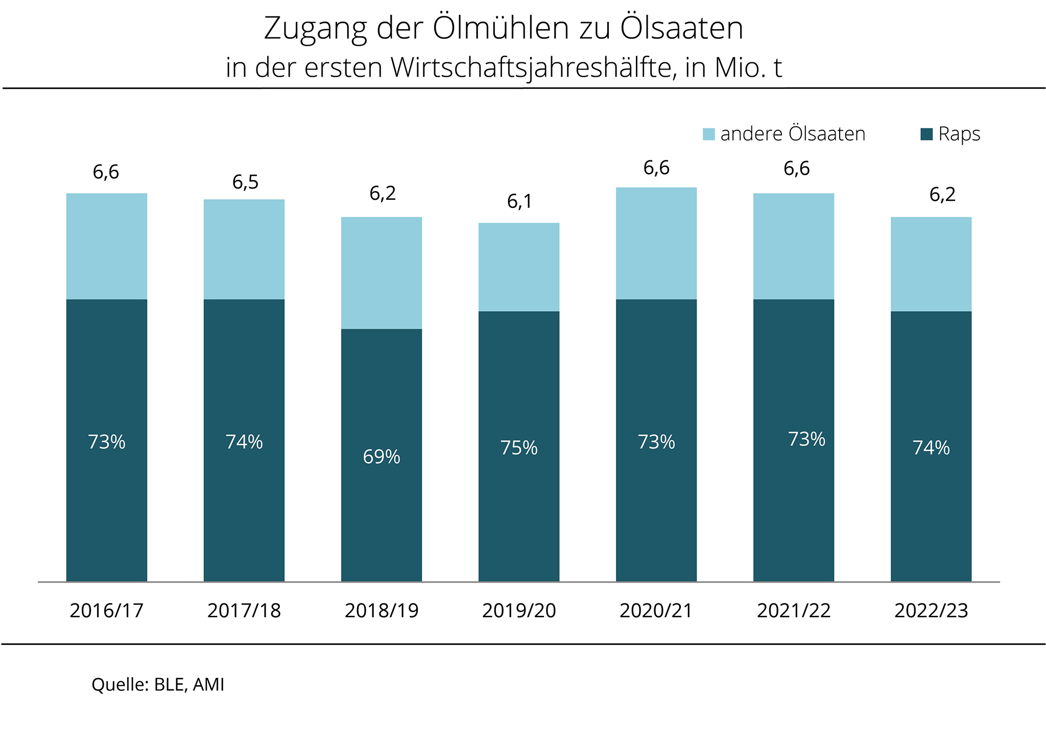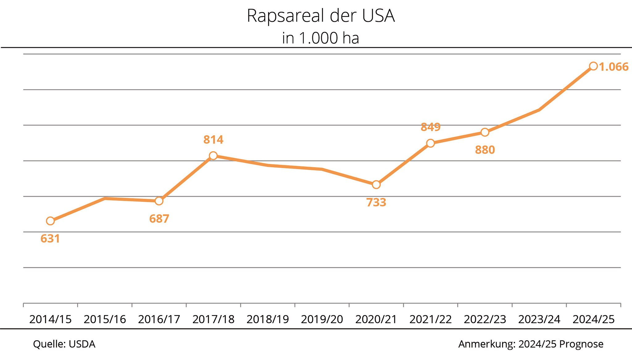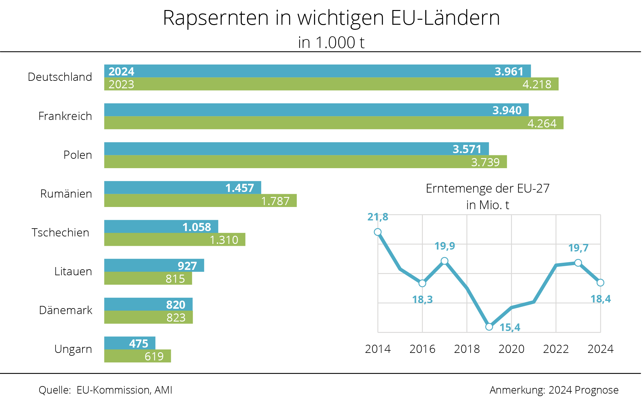 Bei einem inländischen Rapsverbrauch von 10,5 Mio. t, rund 1,1 Mio. t mehr als im vergangenen Wirtschaftsjahr, ergibt sich ein Überschuss von 8,6 Mio. t. Dennoch dürften die Vorräte angesichts der geringen Anfangsbestände mit 900.000 t deutlich hinter dem Vorjahresvolumen von 1,7 Mio. t zurückbleiben. Angesichts der größeren kanadischen Erzeugung dürften, nach Einschätzung der AMI, die Rapsexporte mit rund 8,5 Mio. t deutlich zunehmen. Das wären 60,3 % mehr als noch im Vorjahr. Der inländische Verbrauch könnte ebenfalls zunehmen. Mit prognostizierten 10 Mio. t läge er 16,3 % über dem Vorjahresvolumen.
