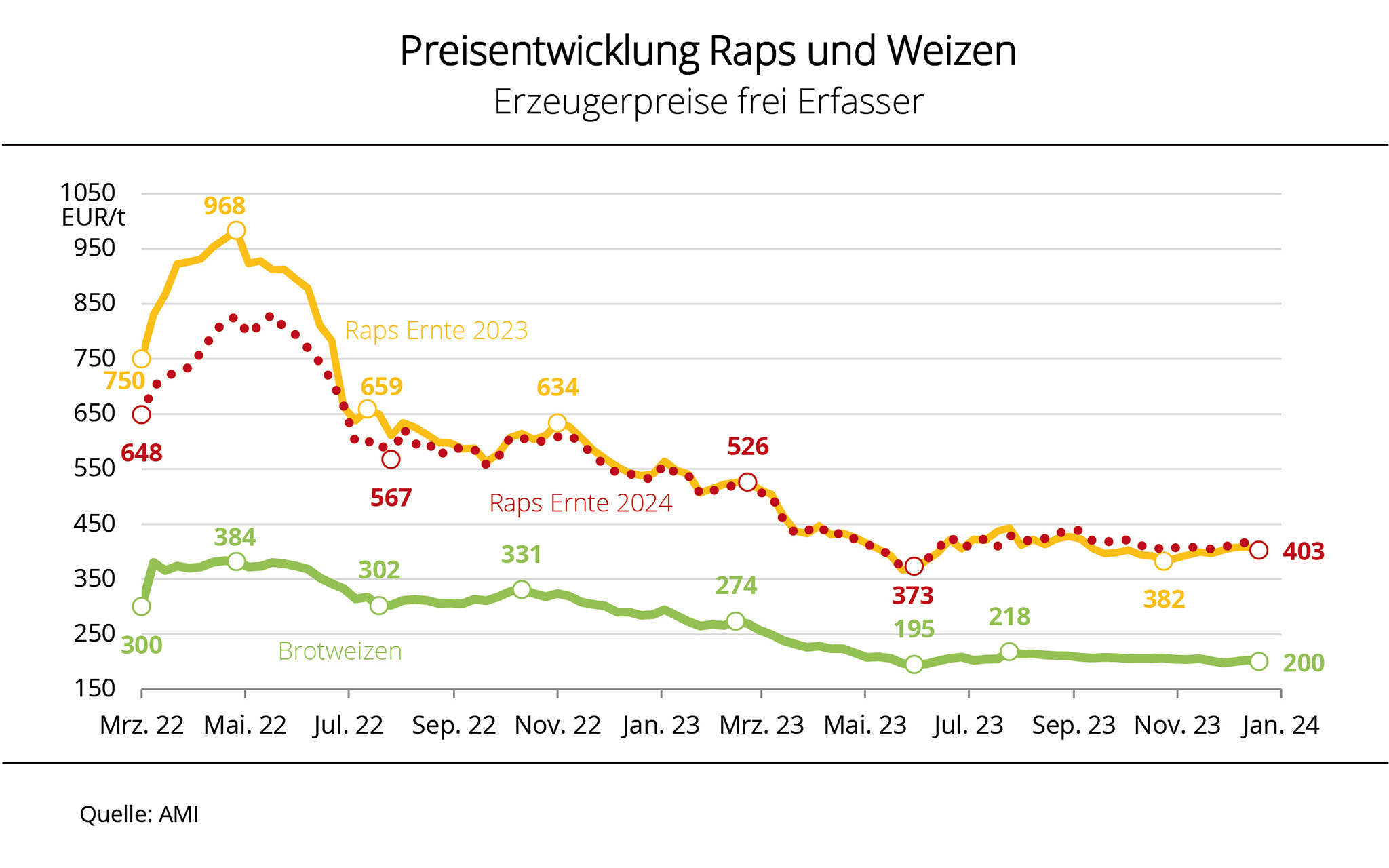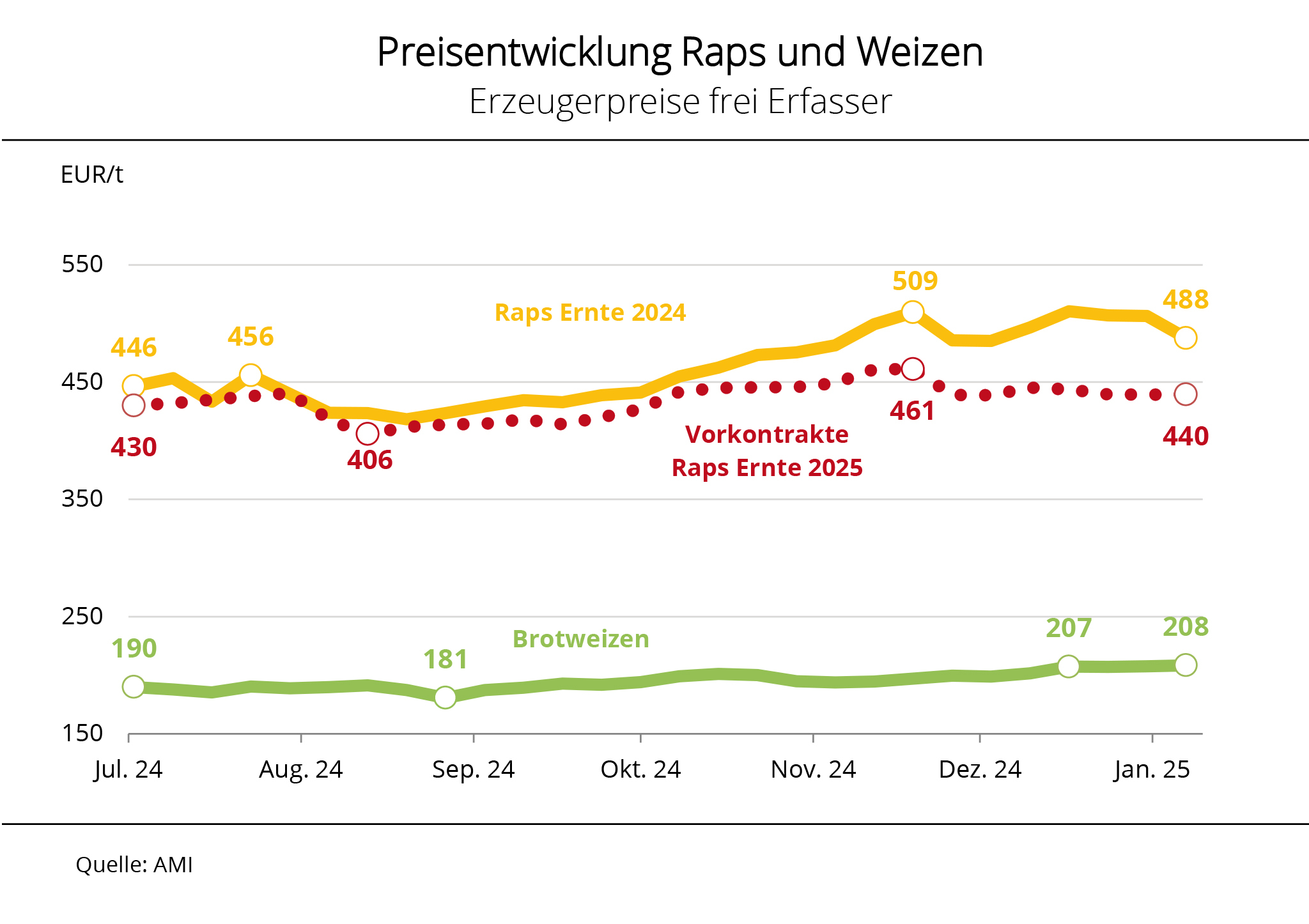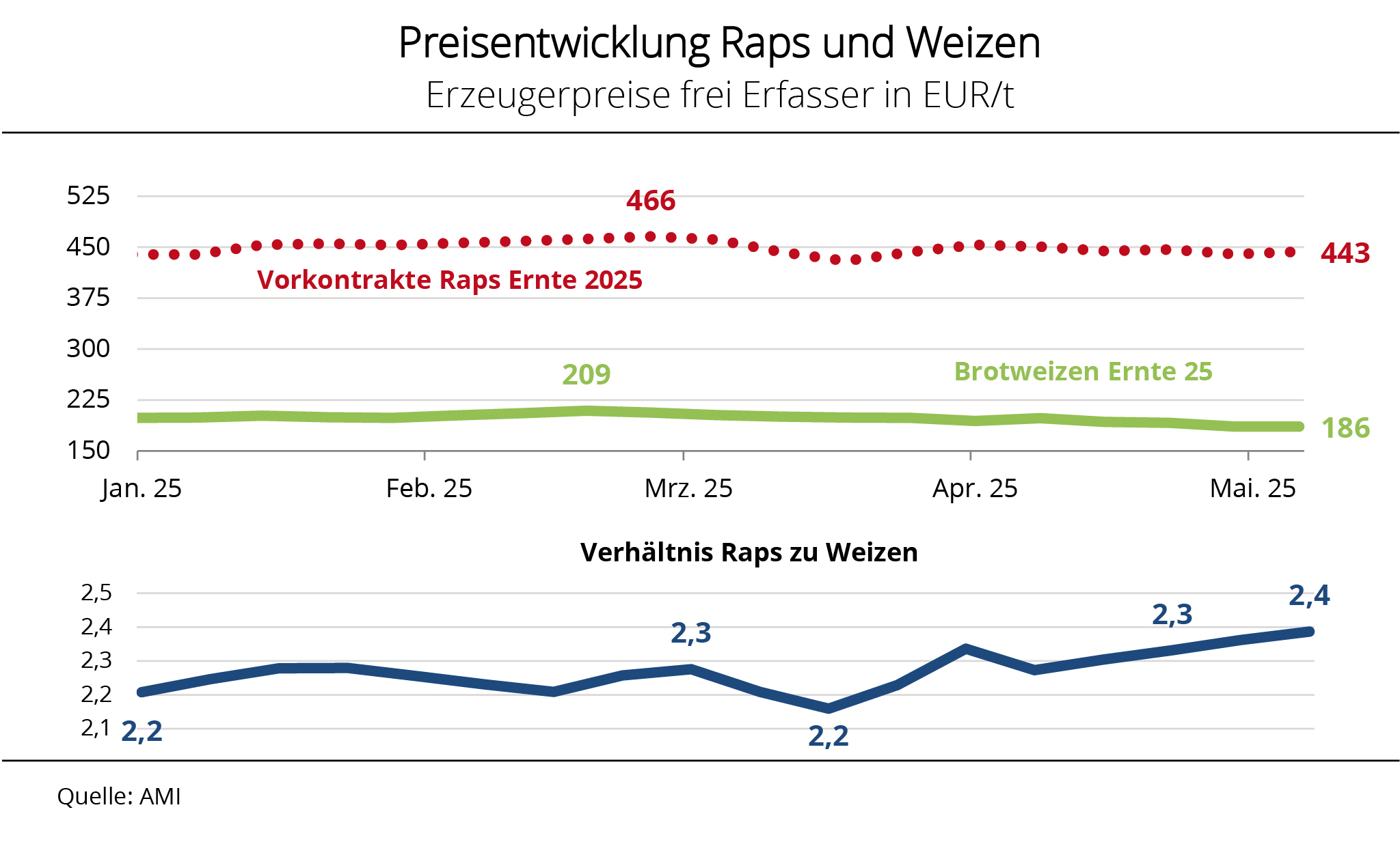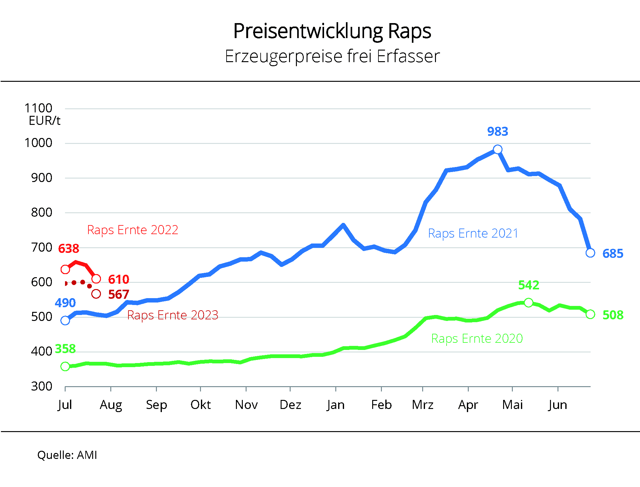 Bei einem inländischen Rapsverbrauch von 10,5 Mio. t, rund 1,1 Mio. t mehr als im vergangenen Wirtschaftsjahr, ergibt sich ein Überschuss von 8,6 Mio. t. Dennoch dürften die Vorräte angesichts der geringen Anfangsbestände mit 900.000 t deutlich hinter dem Vorjahresvolumen von 1,7 Mio. t zurückbleiben. Angesichts der größeren kanadischen Erzeugung dürften, nach Einschätzung der AMI, die Rapsexporte mit rund 8,5 Mio. t deutlich zunehmen. Das wären 60,3 % mehr als noch im Vorjahr. Der inländische Verbrauch könnte ebenfalls zunehmen. Mit prognostizierten 10 Mio. t läge er 16,3 % über dem Vorjahresvolumen.
