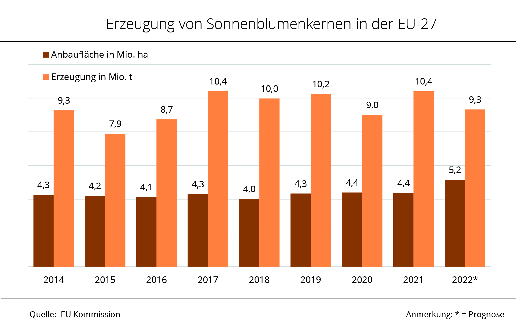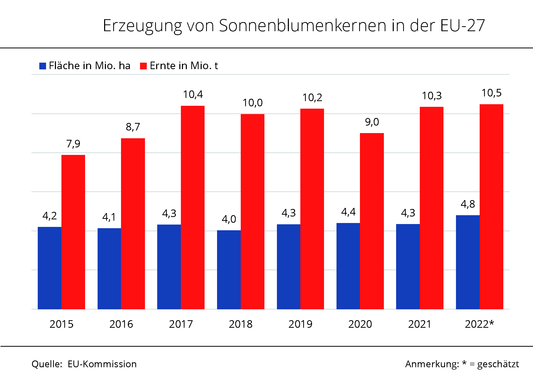 Der Ukrainekrieg und die damit verbundene Knappheit an Sonnenblumenöl veranlasste viele Erzeuger in der Europäischen Gemeinschaft, im Frühjahr 2022 mehr Sonnenblumen auszusäen. Die anfänglich optimistischen Ernteaussichten lassen sich aber aufgrund der Trockenheit in weiten Teilen Europas nicht halten.