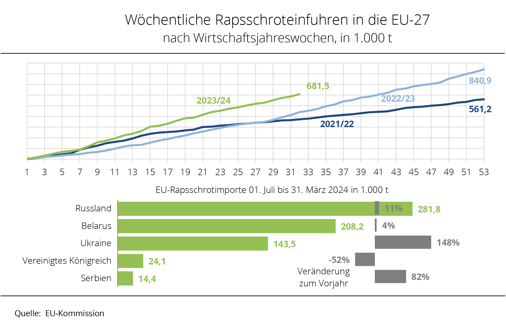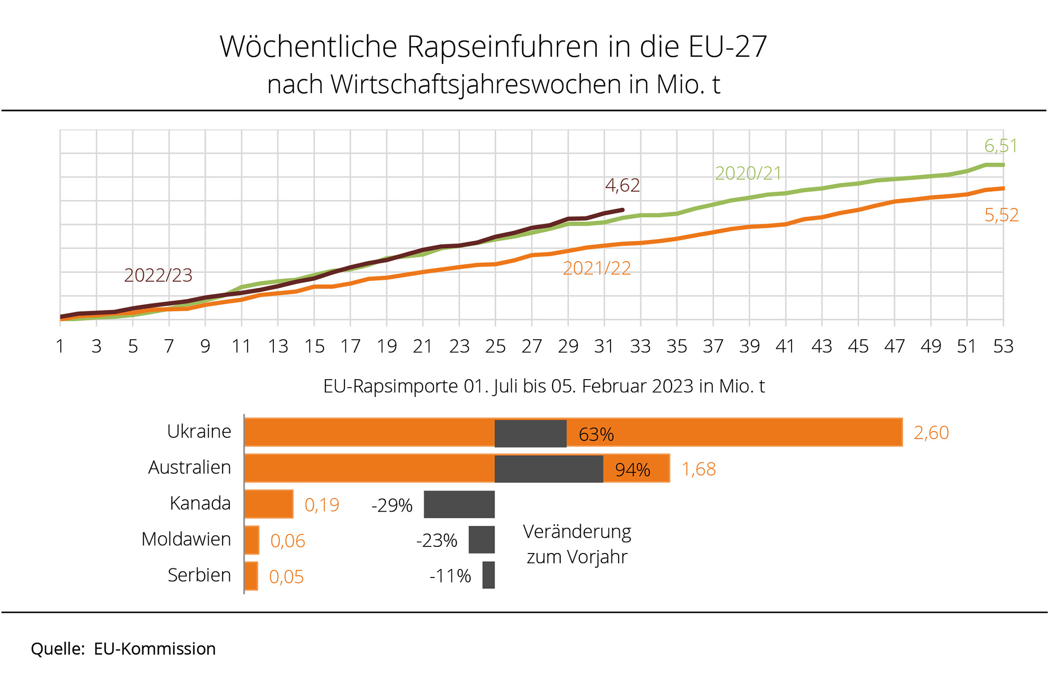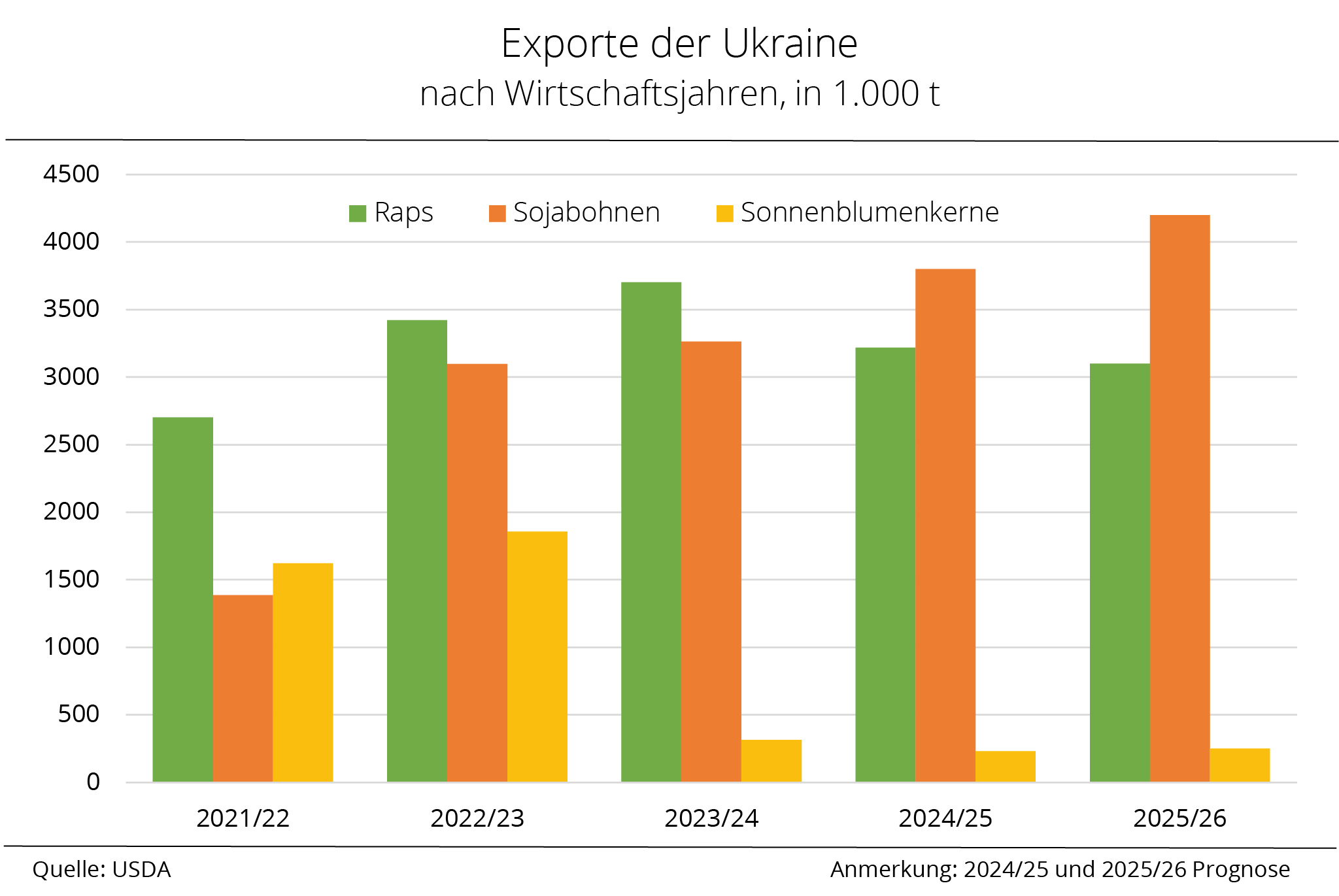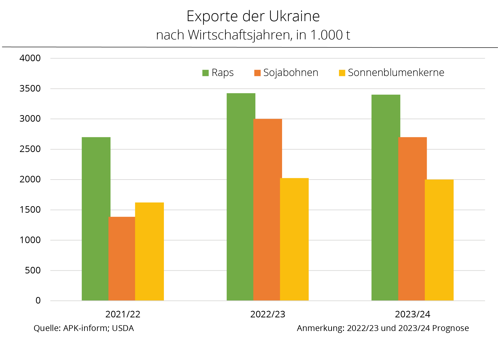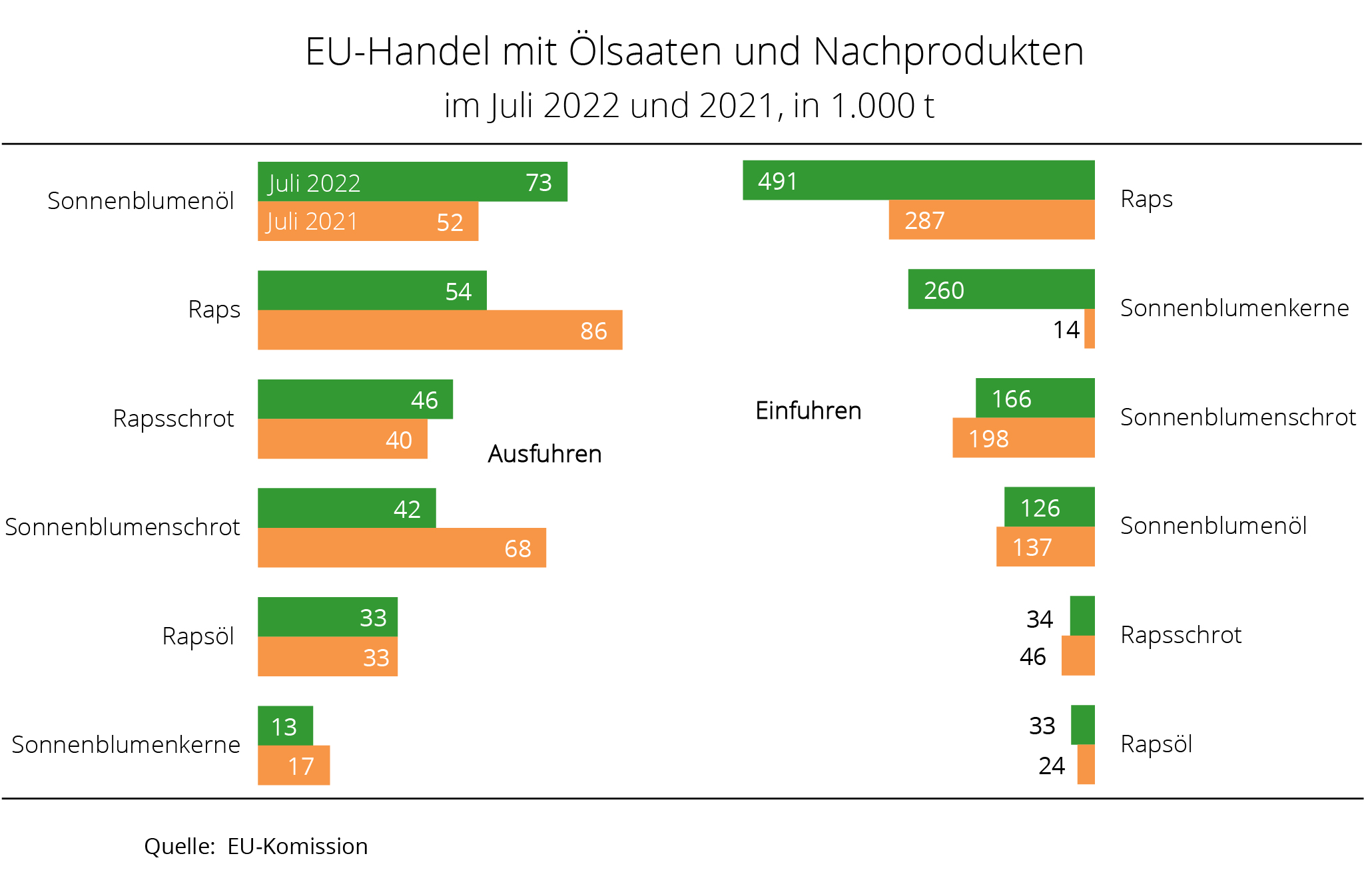 Nach Angaben der EU-Kommission hat sich der Außenhandel mit Raps und Sonnenblumenkernen zwar verändert, aber nicht so stark wie erwartet. Auslöser war das stark eingeschränkte Exportpotenzial der Ukraine, wichtigster Lieferant für Ölsaaten, Ölschrote und insbesondere Sonnenblumenöl. Wie aktuelle Daten zeigen, kamen größere Mengen von dort als prognostiziert – von einem Einbruch der Lieferungen kann daher pauschal nicht gesprochen werden.