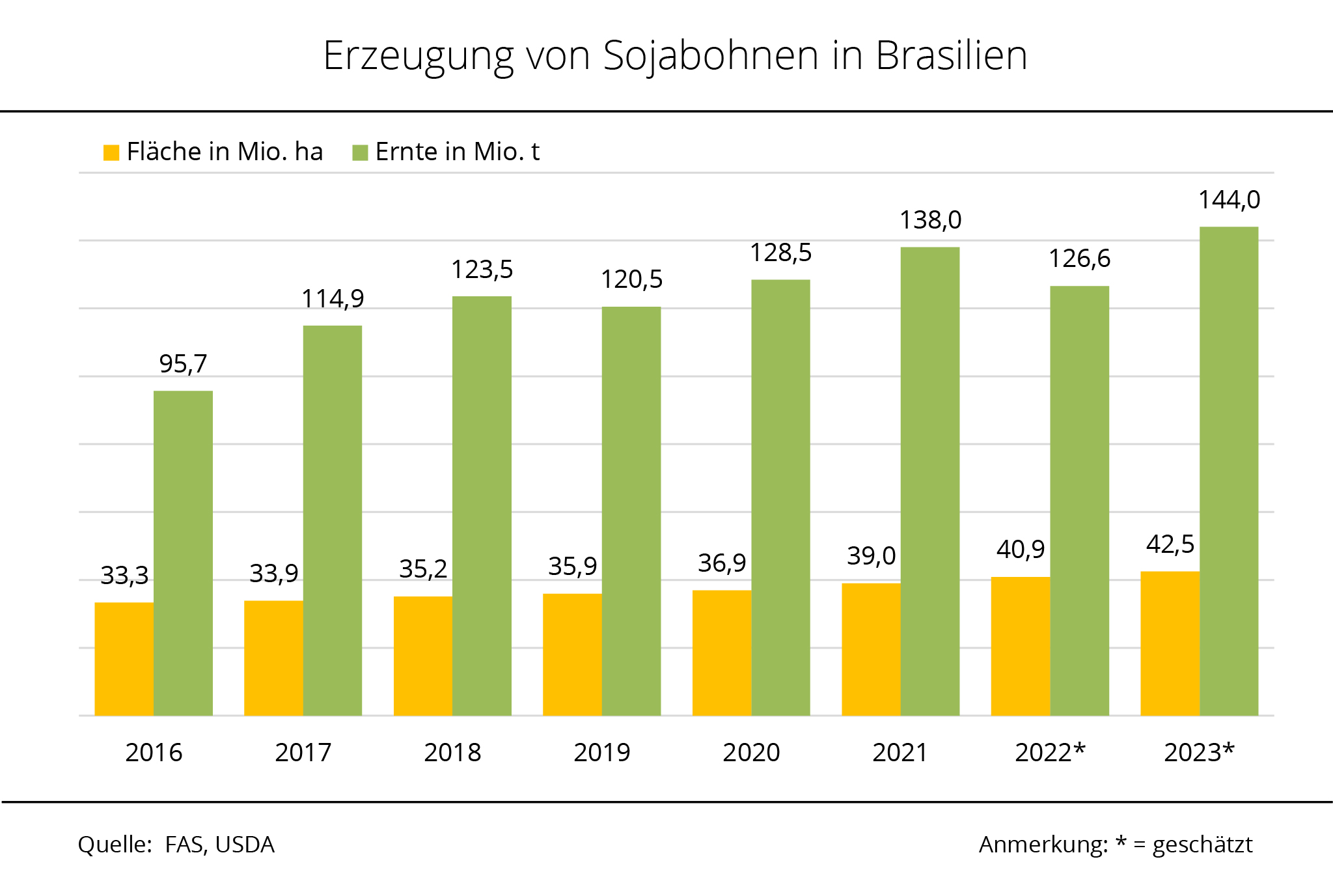 Auf 42,5 Mio. ha schätzt der Auslandservice des US-Landwirtschaftsministeriums, FAS, für das Wirtschaftsjahr 2022/23 die Anbaufläche für Soja. Das entspricht einem voraussichtlichen Plus gegenüber Vorjahr von 1,6 Mio. ha. Die 5-jährige Wachstumsrate von 1,2 Mio. ha dürfte damit um 400.000 ha übertroffen werden. Insbesondere die Grenzregionen zum Urwald im Norden und Nordosten des Landes sind laut FAS von einer verstärkten Ausdehnung des Sojaareals betroffen. Neben der Erwartung einer lebhaften weltweiten Nachfrage, stellt auch der günstige Wechselkurs des brasilianischen Reals zum US-Dollar und die Verbesserung der Infrastruktur infolge neuer und verbesserter Straßen und Häfen einen Anreiz für Farmer dar, ihre Sojaflächen, unter anderem auf degradierten Weiden, auszuweiten.
