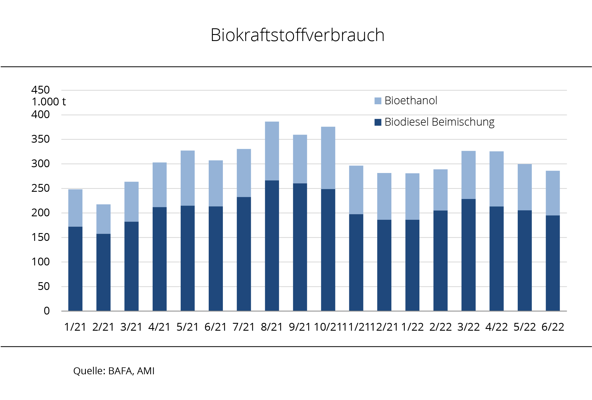 Im ersten Halbjahr 2022 summierte sich der Verbrauch von Biodiesel und Hydriertem Pflanzenöl (HVO) zur Beimischung auf rund 1,23 Mio. t und war damit 6,3 % größer als im Vorjahreszeitraum.
