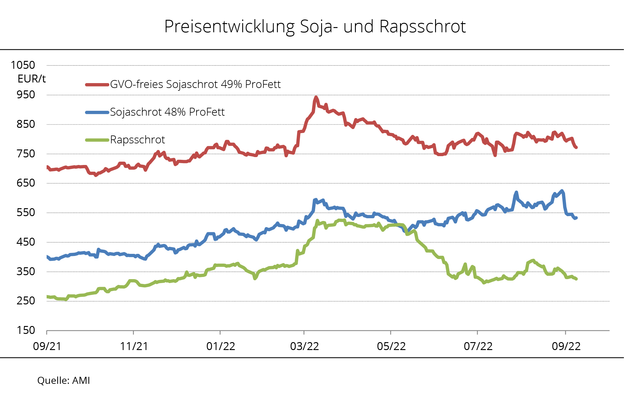 Die Preise für Sojaschrot stiegen im August ebenfalls deutlich an. Zum einen gestützt von den ungünstigen Vegetationsbedingungen in den USA, dem wichtigsten Anbieter am Weltmarkt, zum anderen getrieben von den steigenden Energiekursen und infolgedessen steigenden Logistikkosten bei zusätzlich begrenztem Frachtraum. Im August 2022 wurden für 48er Partien im Schnitt 585 EUR/t fob Mühle aufgerufen und damit 3,1 % mehr als im Vormonatsdurchschnitt und sogar 45 % über der Vorjahreslinie. Mit dem Einbruch der Sojanotierungen Anfang September 2022 aufgrund der nach oben korrigierten US-Ertragsprognosen gaben die Kassapreise in Deutschland ebenfalls nach.