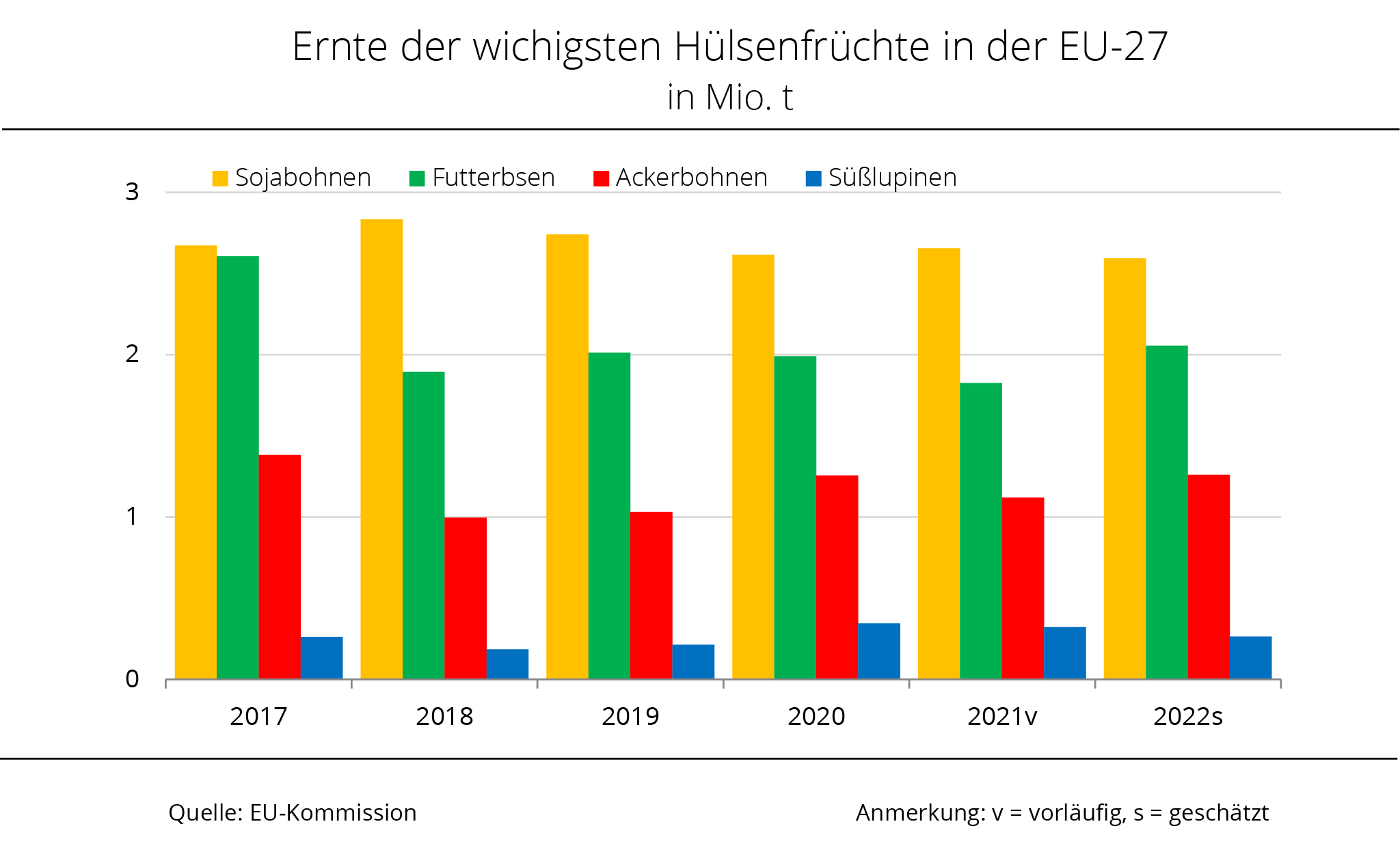 Nach Einschätzung der EU-Kommission dürften 2022 knapp 6,2 Mio. t Hülsenfrüchte in der Union geerntet werden, 4 % mehr als im Vorjahr. Das Rekordergebnis von 6,9 Mio. t im Jahr 2017 wird jedoch deutlich verfehlt. Vor allem Futtererbsen und Ackerbohnen werden mit 2,1 bzw. 1,3 Mio. t und einem Plus von jeweils 13 % im Vergleich zum Vorjahr umfangreicher gedroschen. Nach Einschätzung der Agrarmarkt Informations-Gesellschaft (mbH) ist dieses Plus sowohl auf die Flächenausdehnung als auch auf voraussichtlich höhere Erträge zurückzuführen.