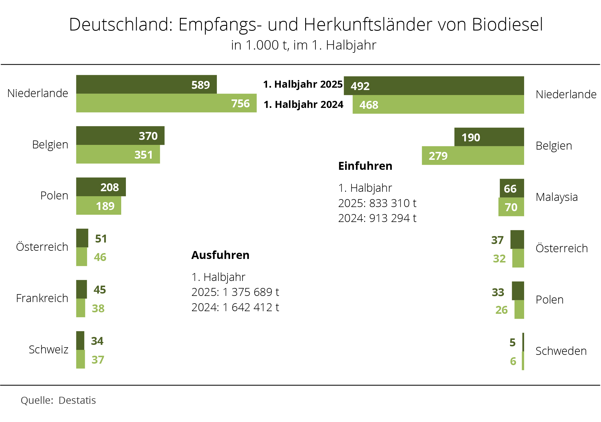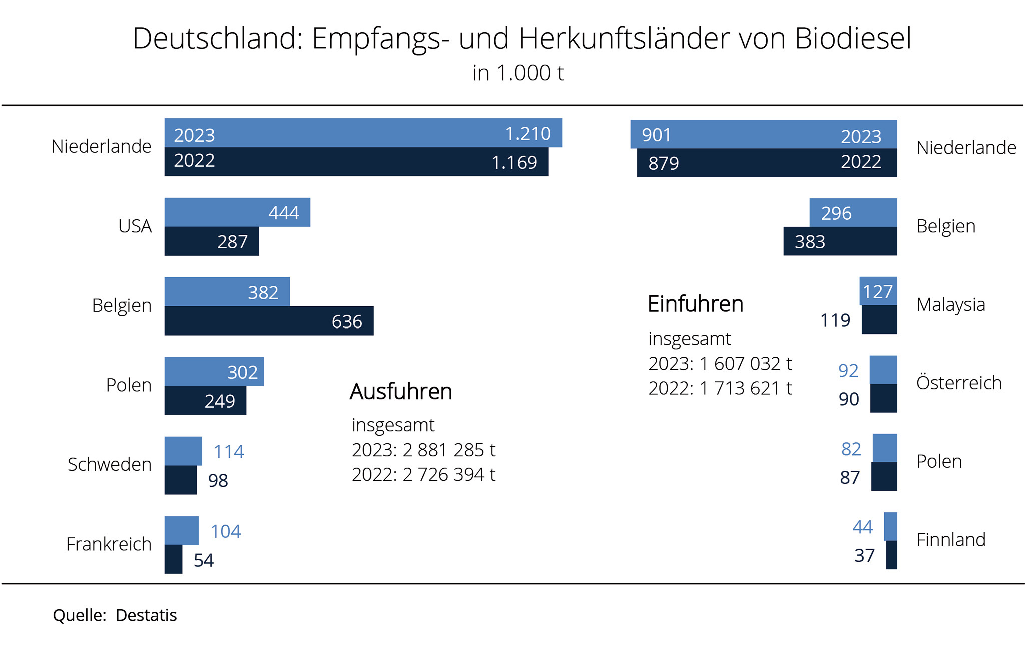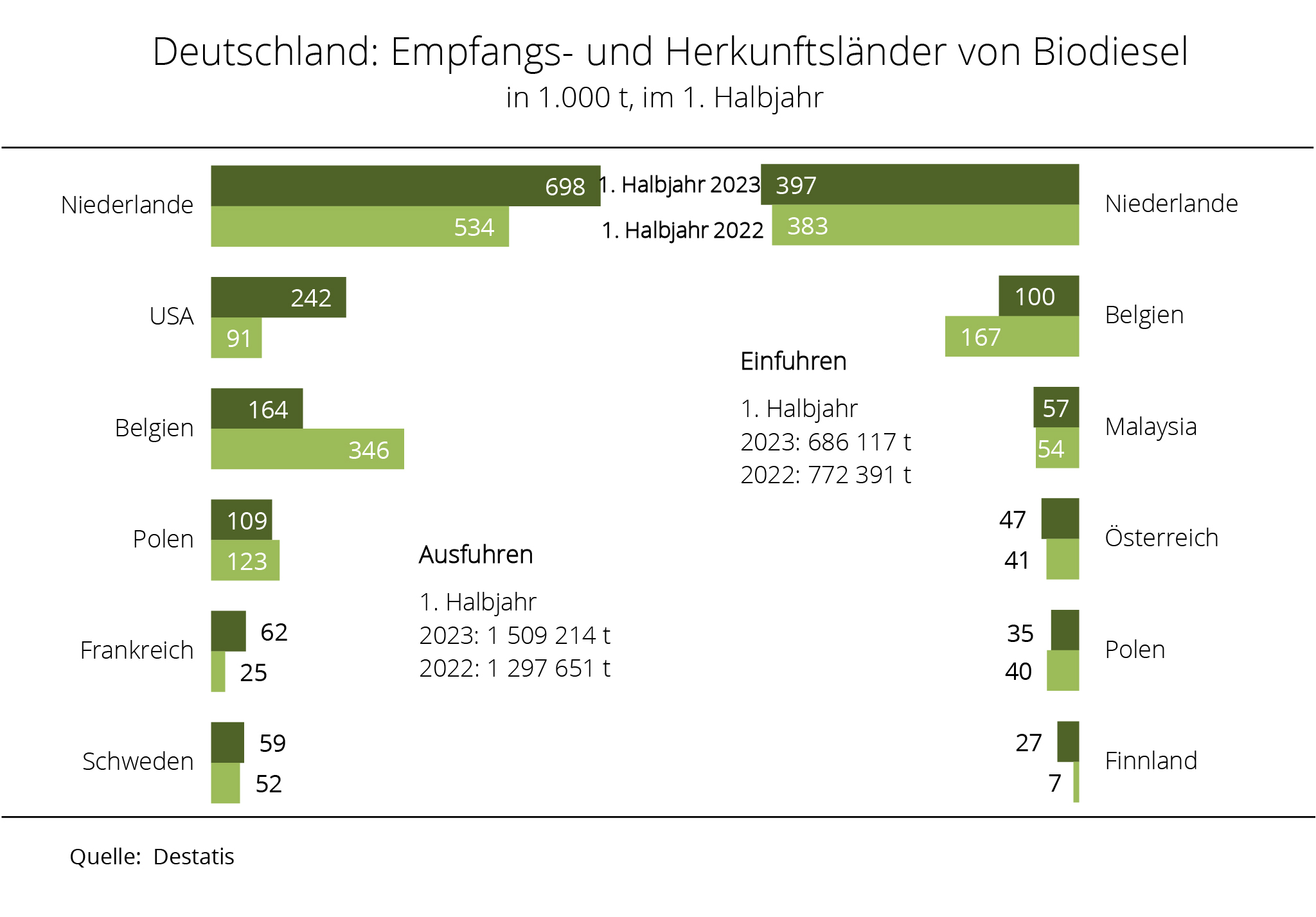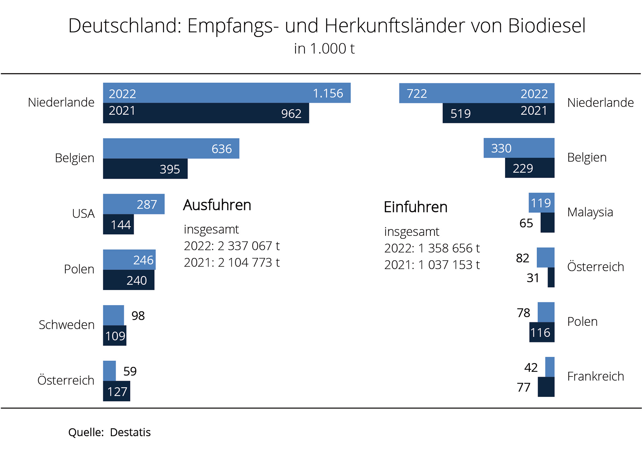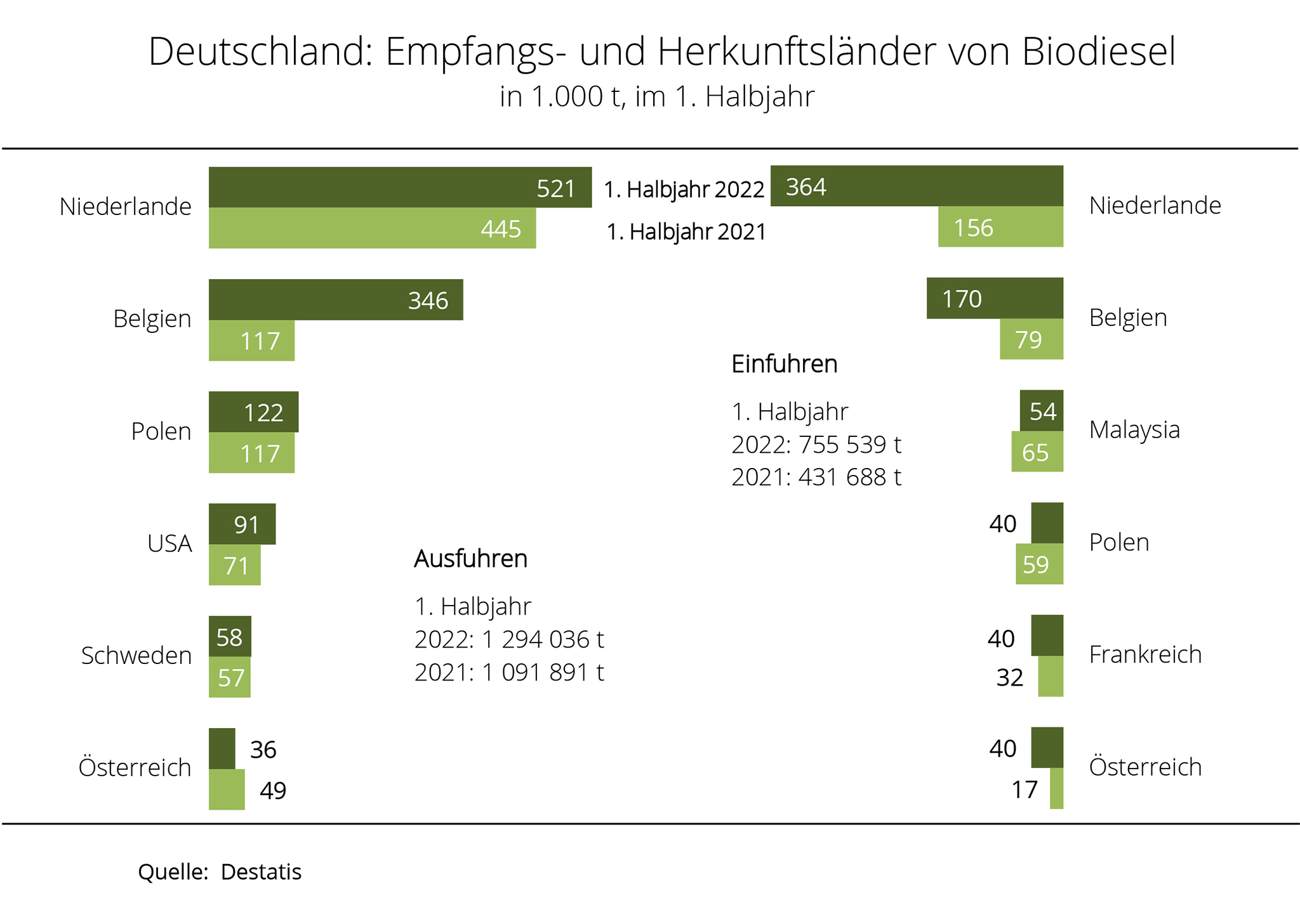 Deutschland exportierte im ersten Halbjahr 2022 laut Statistischem Bundesamt rund 1,3 Mio. t Biodiesel. Demgegenüber belief sich der Import auf 755.539 t. Wichtigster Handelspartner sind mit 40 bzw. 48 % am Gesamtexport bzw.