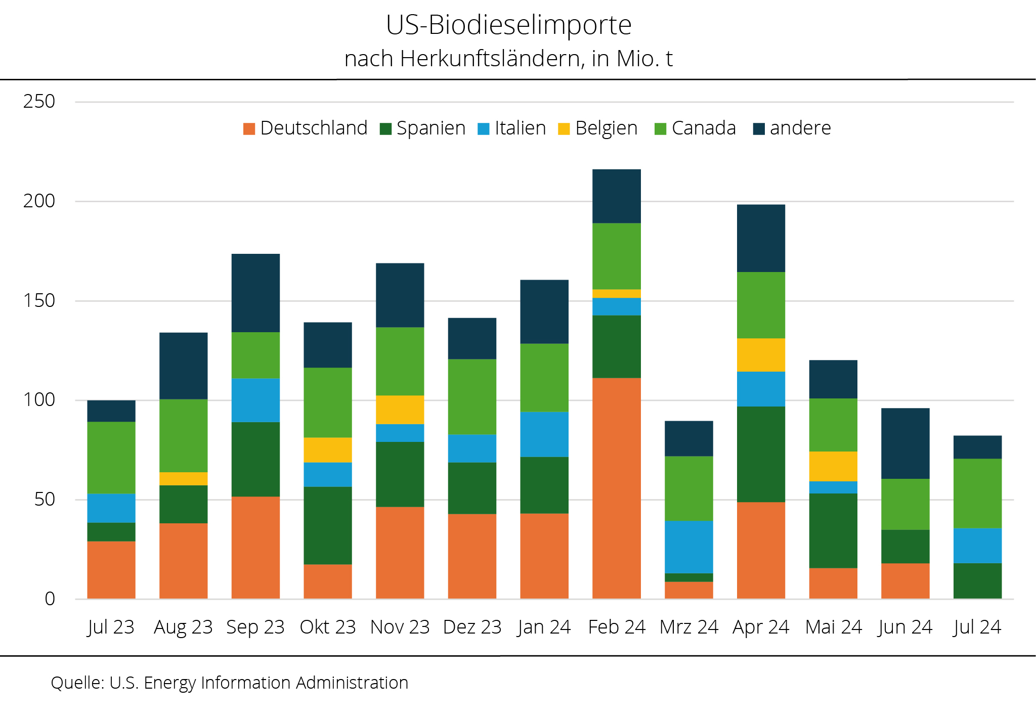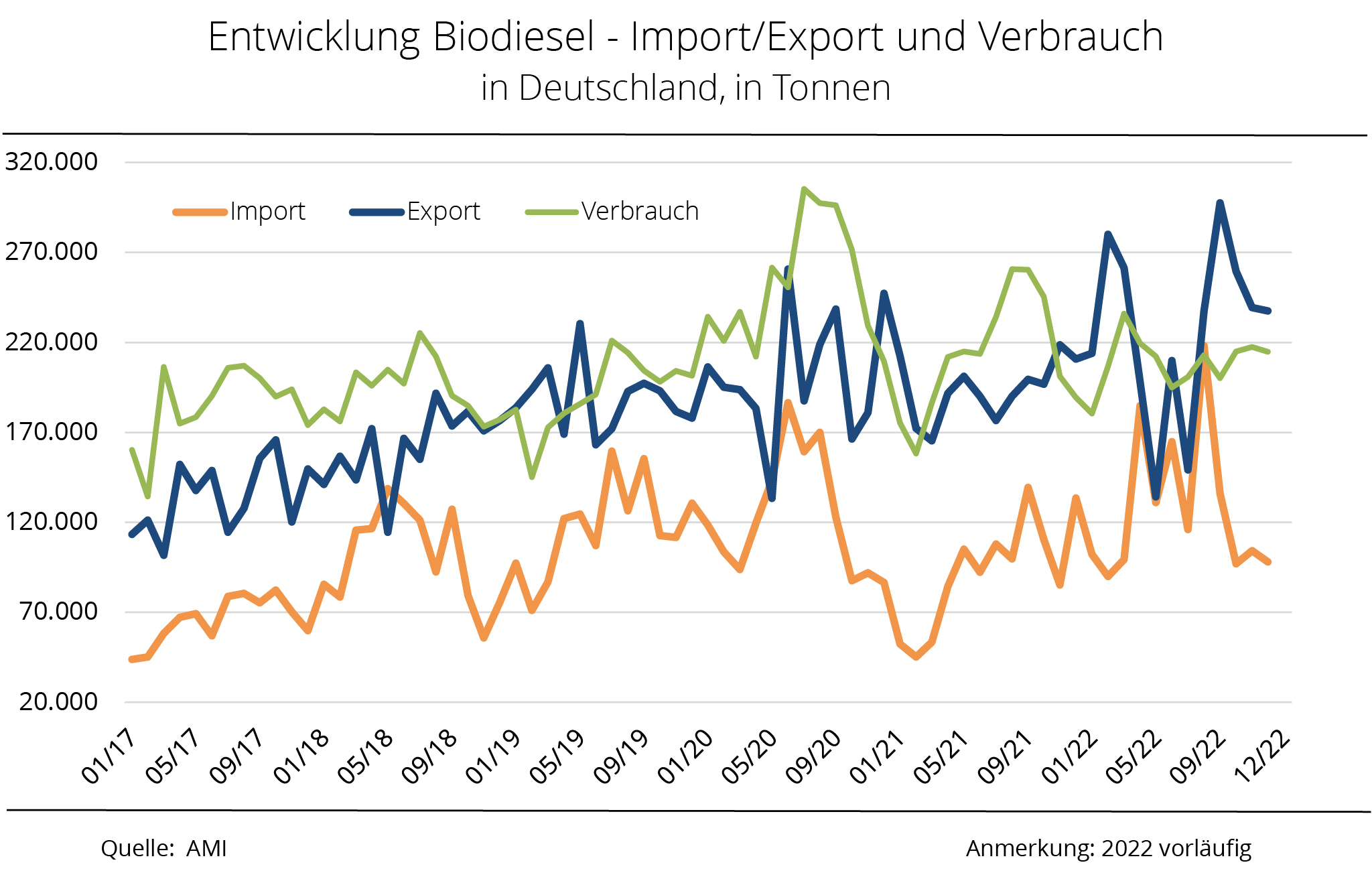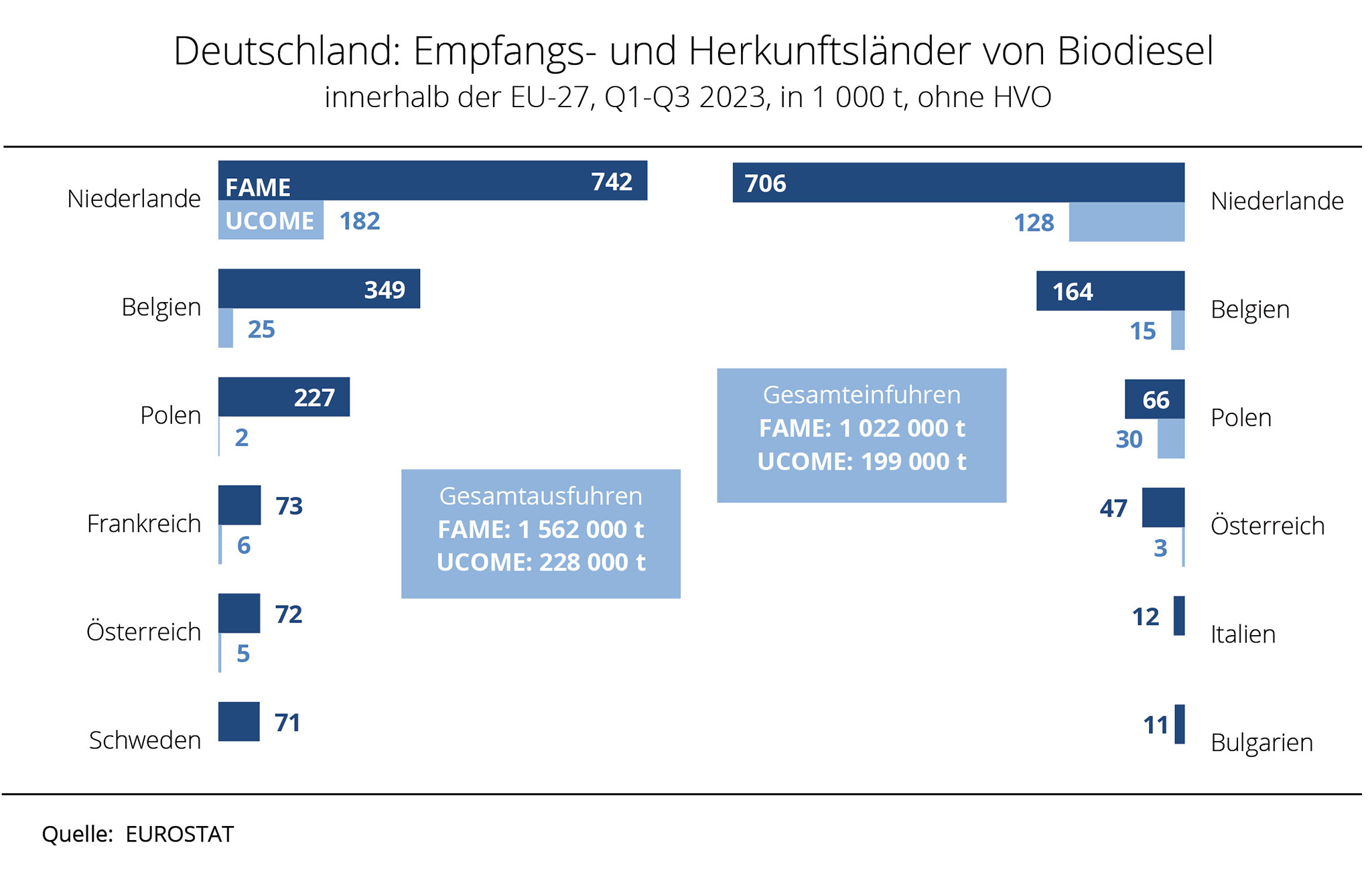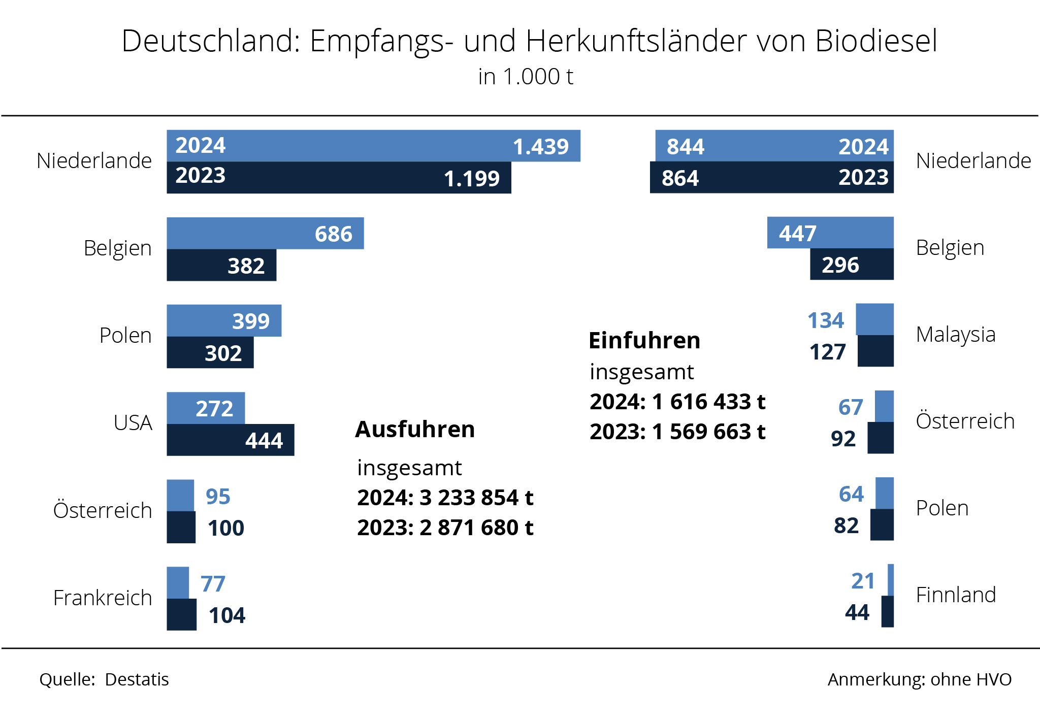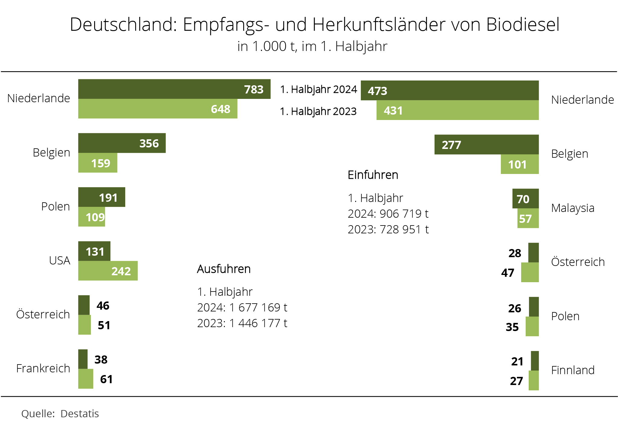Deutschland exportierte im ersten Halbjahr 2022 laut Statistischem Bundesamt rund 1,3 Mio. t Biodiesel. Demgegenüber belief sich der Import auf 755.539 t. Wichtigster Handelspartner sind mit 40 bzw. 48 % am Gesamtexport bzw.