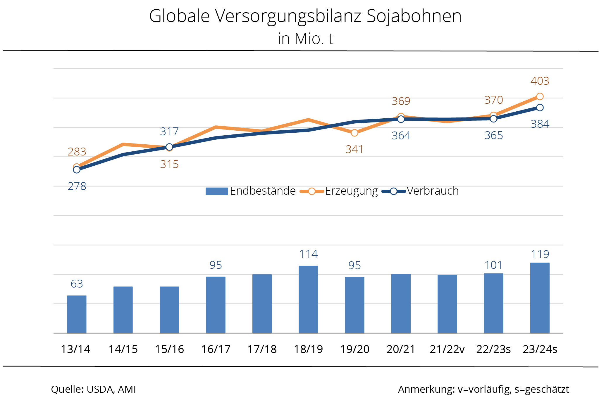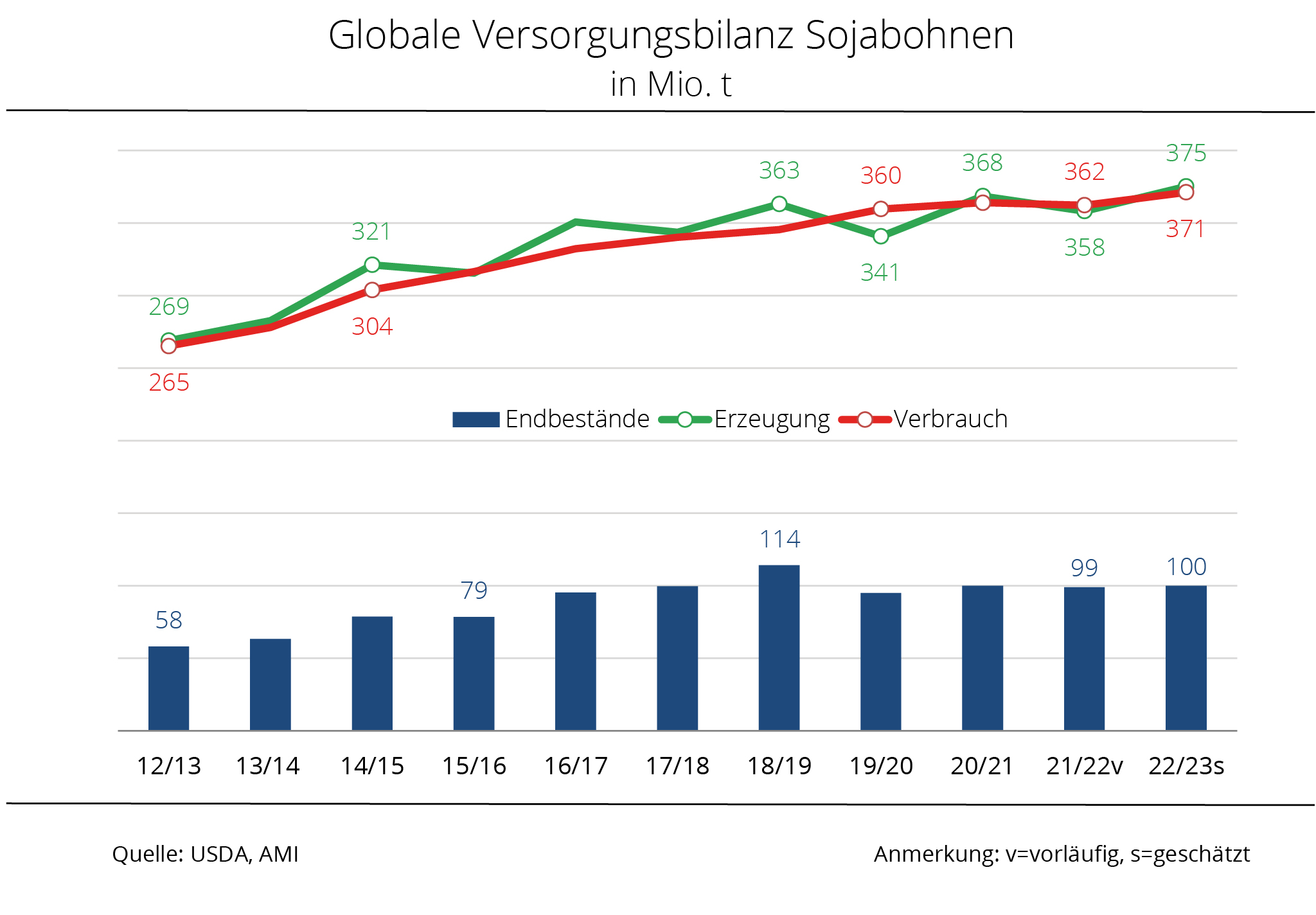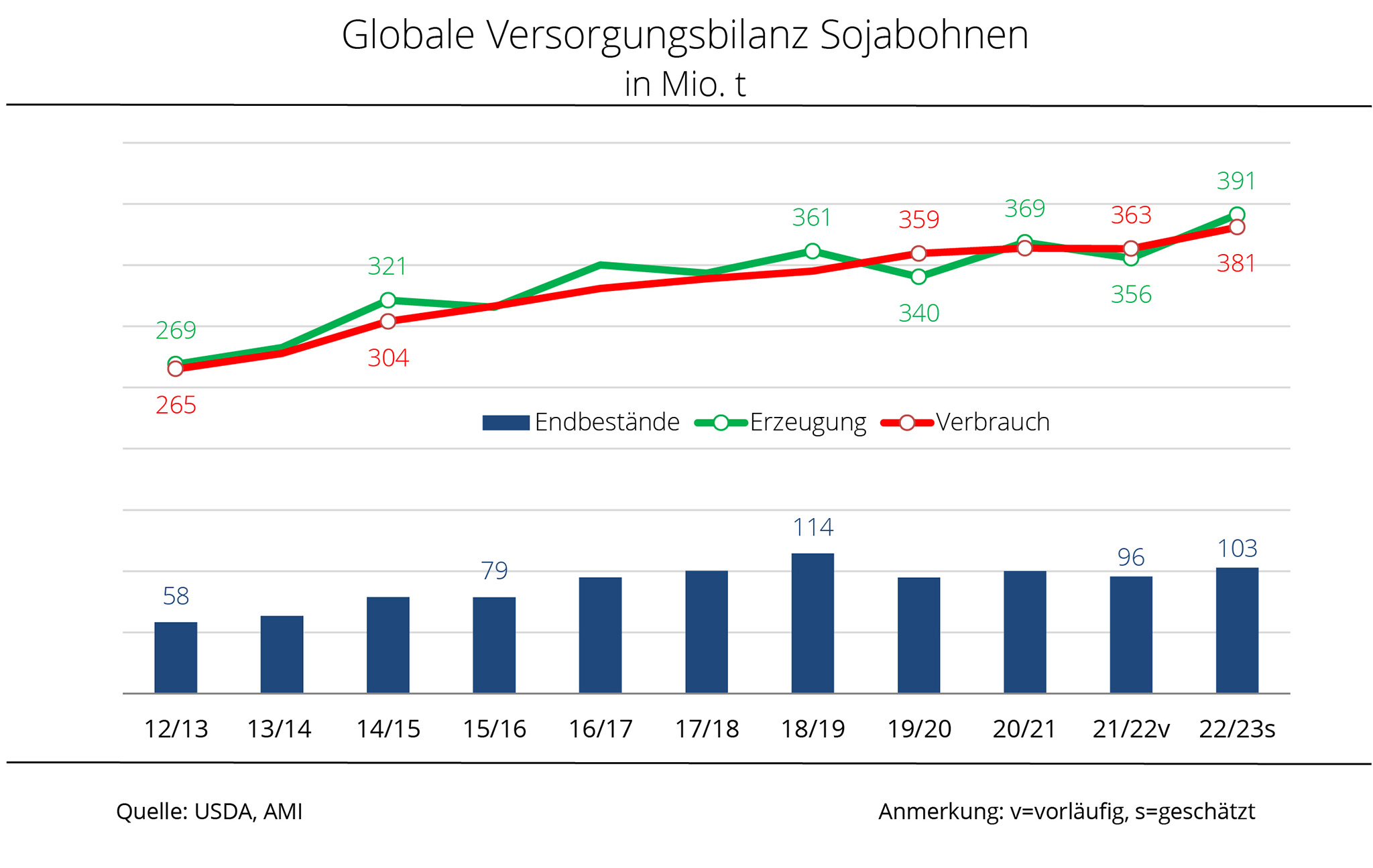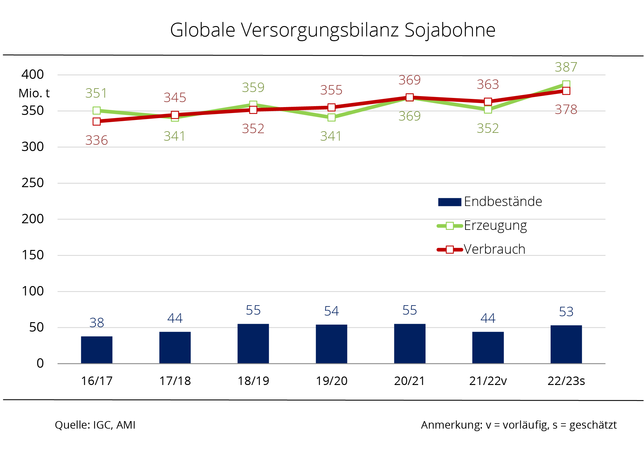 Im Zuge seines jüngsten Berichts korrigierte der Internationale Getreiderat (IGC) seine Schätzung des globalen Sojaangebots 2022/23 um 2 auf 387 Mio. t nach unten. Dennoch dürfe das Angebot im laufenden Wirtschaftsjahr ein Rekordniveau erreichen und das Vorjahresniveau um knapp 10 % übertreffen.