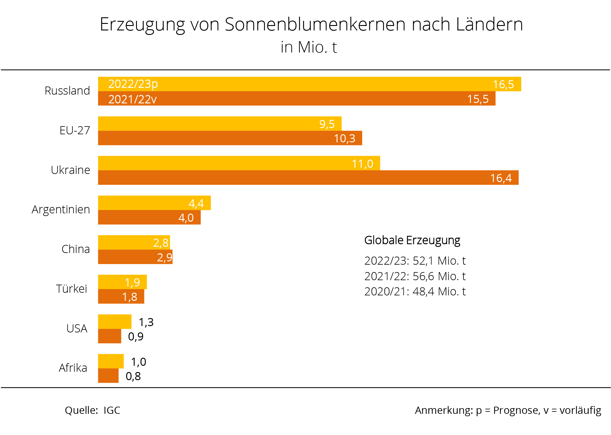 Global dürften im Wirtschaftsjahr 2022/23 nach Angaben des Internationalen Getreiderates IGC rund 52,1 Mio. t Sonnenblumenkerne zusammenkommen. Das wären zwar 700.000 t mehr als noch im September prognostiziert, das Vorjahresvolumen wird damit dennoch um 7,9 % verfehlt. Während in Russland rund 6,5 % mehr Sonnenblumenkerne erzeugt werden dürften als noch 2021/22, wird das Angebot der Ukraine, angesichts des anhaltenden Kriegsgeschehens und eines Rückgangs der Anbaufläche, voraussichtlich ein Drittel kleiner ausfallen. Berichten zufolge konnten bis zum 14.10.2022 knapp die Hälfte der ukrainischen Flächen geräumt werden. Niederschläge verzögerten die Erntearbeiten jedoch zuletzt und verstärkten die Sorge um deutliche Qualitätseinbußen.
