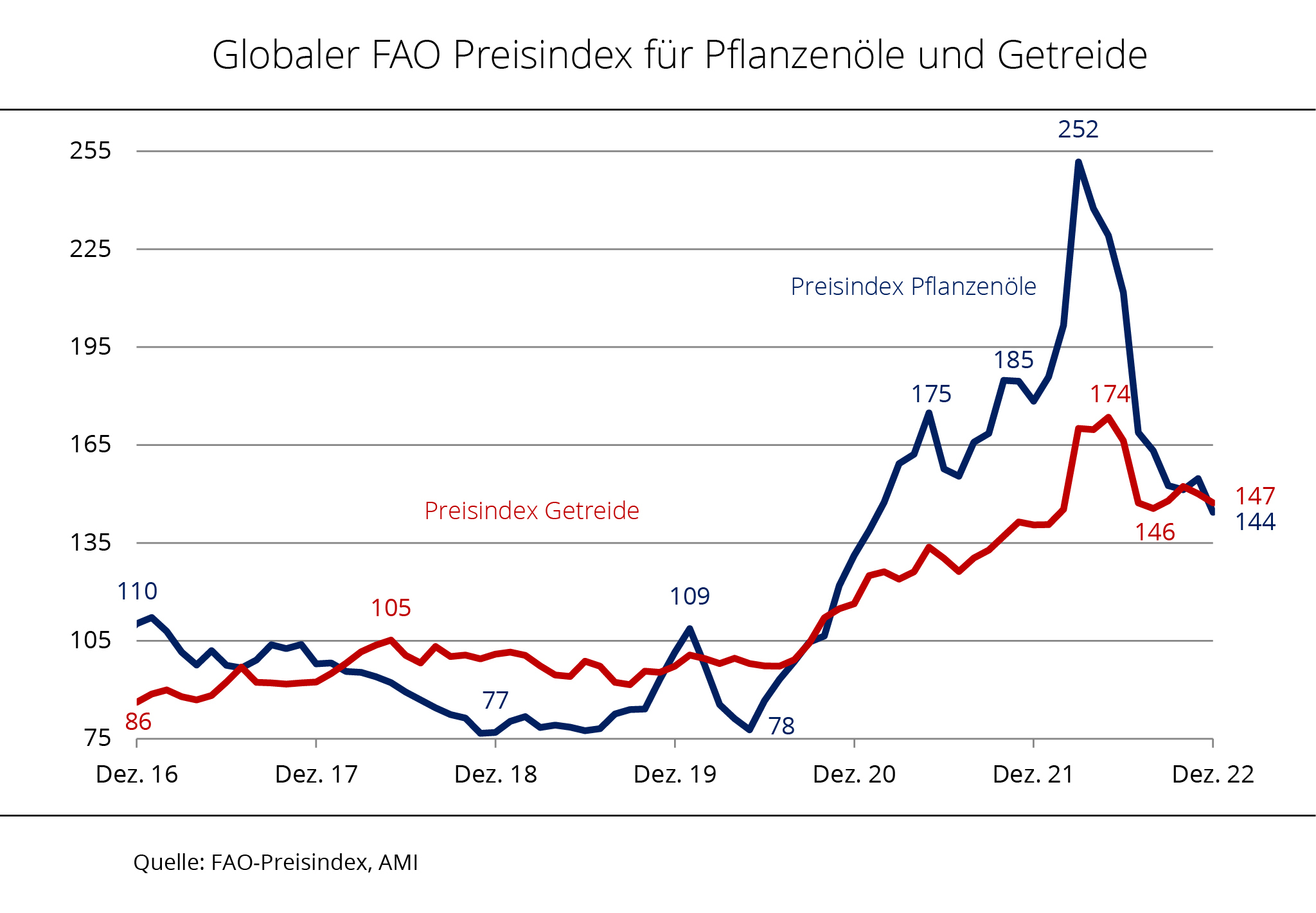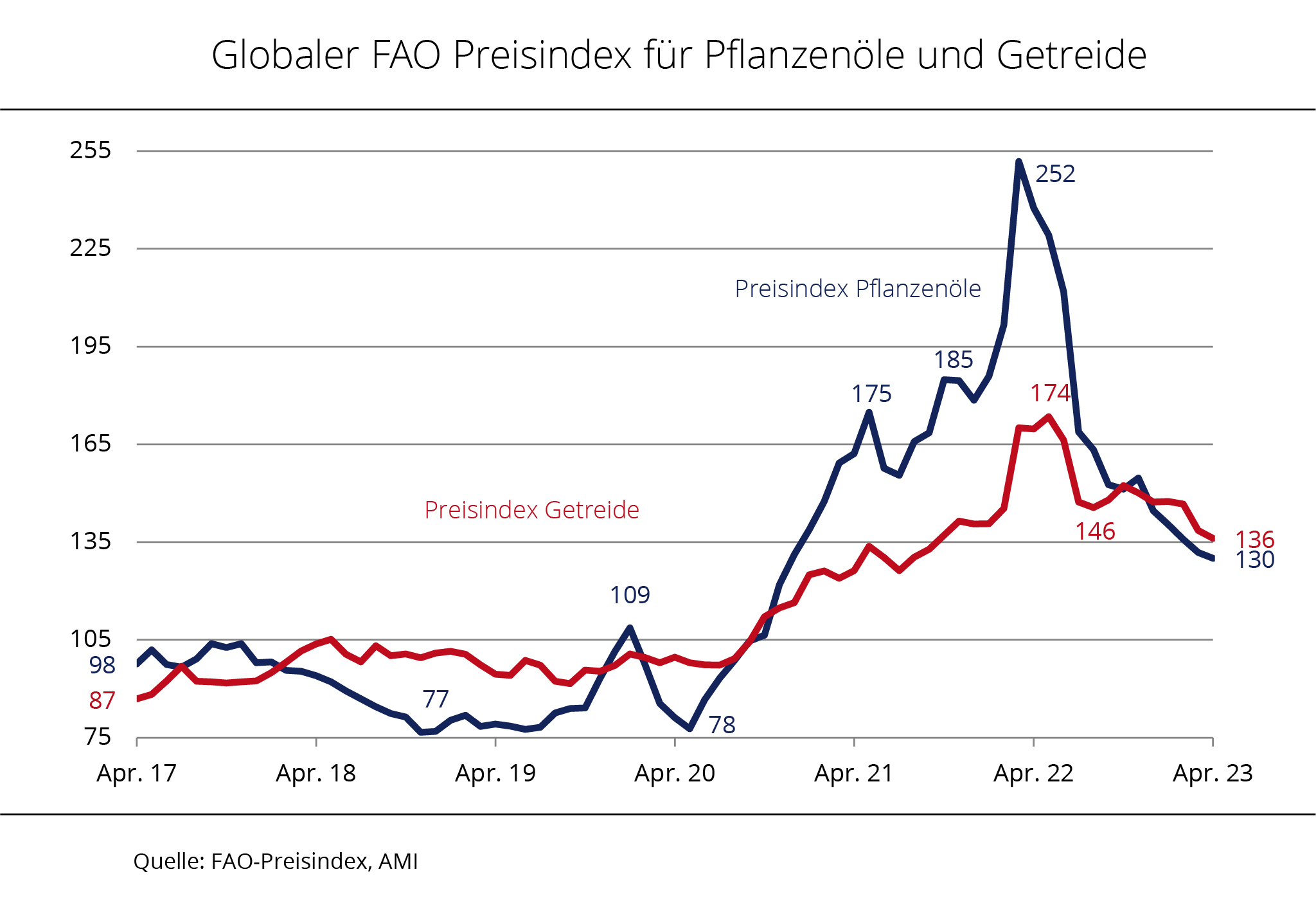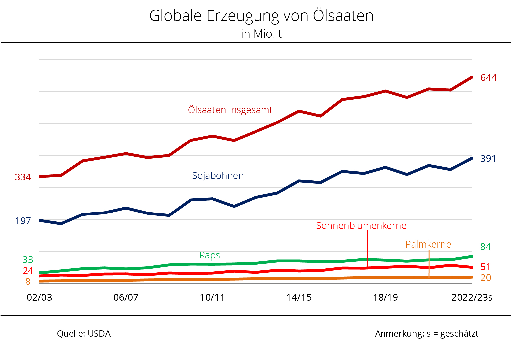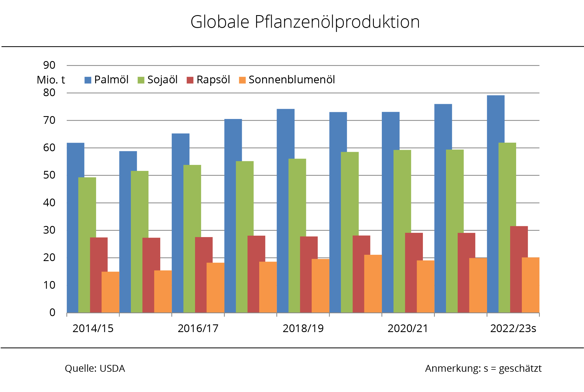 Nach der jüngsten Schätzung des US-Landwirtschaftsministeriums (USDA) beläuft sich die globale Erzeugung von Pflanzenölen 2022/23 auf 219,8 Mio. t. Das wären 8,3 Mio. t mehr als 2021/22. Damit wird die Produktion den Bedarf von voraussichtlich 213,6 Mio. t auch im laufenden Wirtschaftsjahr vollständig decken.