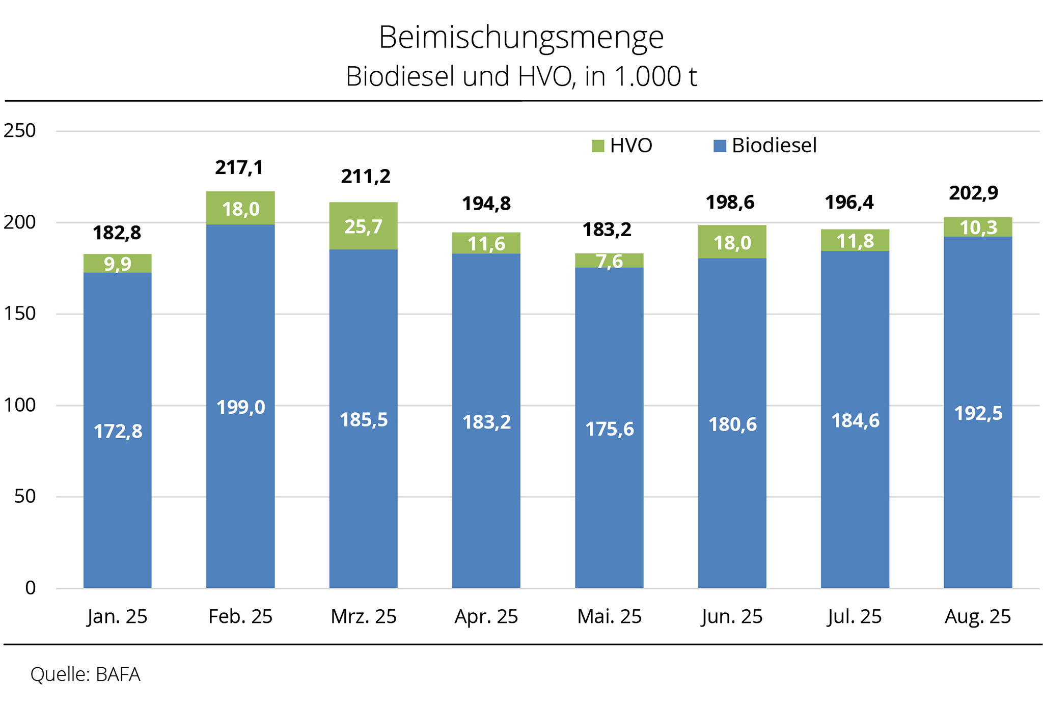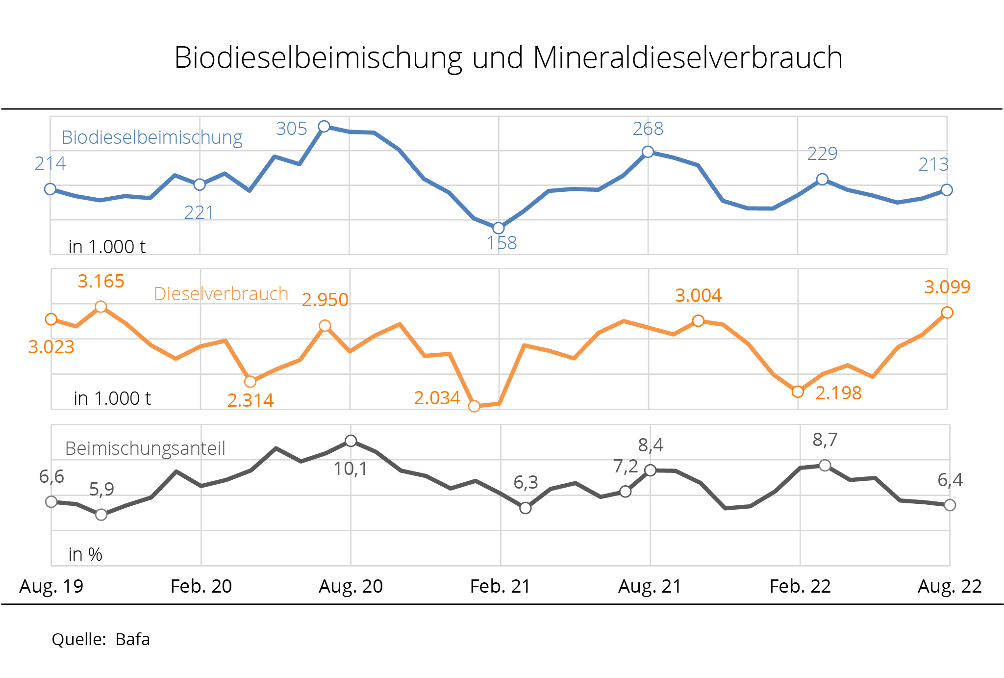 Im August 2022 wurden 212.960 t Biodiesel und damit 6,1 % mehr als im Vormonat beigemischt. Da der Dieselverbrauch gleichzeitig um 8,8 % auf 3,1 Mio. t zunahm und damit ein 3-Jahreshoch erreichte, reduziert sich der Beimischungsanteil um 0,2 Prozentpunkte auf 6,4 %, womit der geringste Beimischungsanteil seit Jahresbeginn erreicht wurde. Der Gesamtverbrauch von Diesel und Biodiesel summiert sich im August folglich auf gut 3,3 Mio. t, das sind 3,7 % mehr als noch im August 2021. Im laufenden Jahr summiert sich der Biodieselverbrauch damit auf gut 1,6 Mio. t. Der Beimischungsanteil lag im Schnitt über die ersten 8 Monate des Jahres 2022 bei 7,2 %, im Vorjahreszeitraum lag dieser bei 7,4 %.