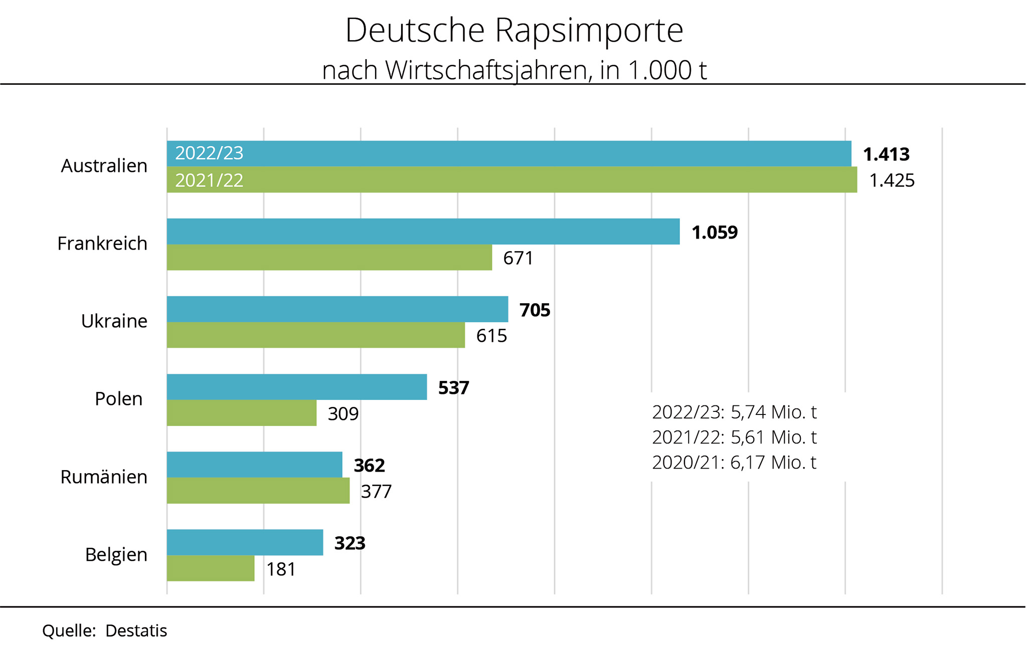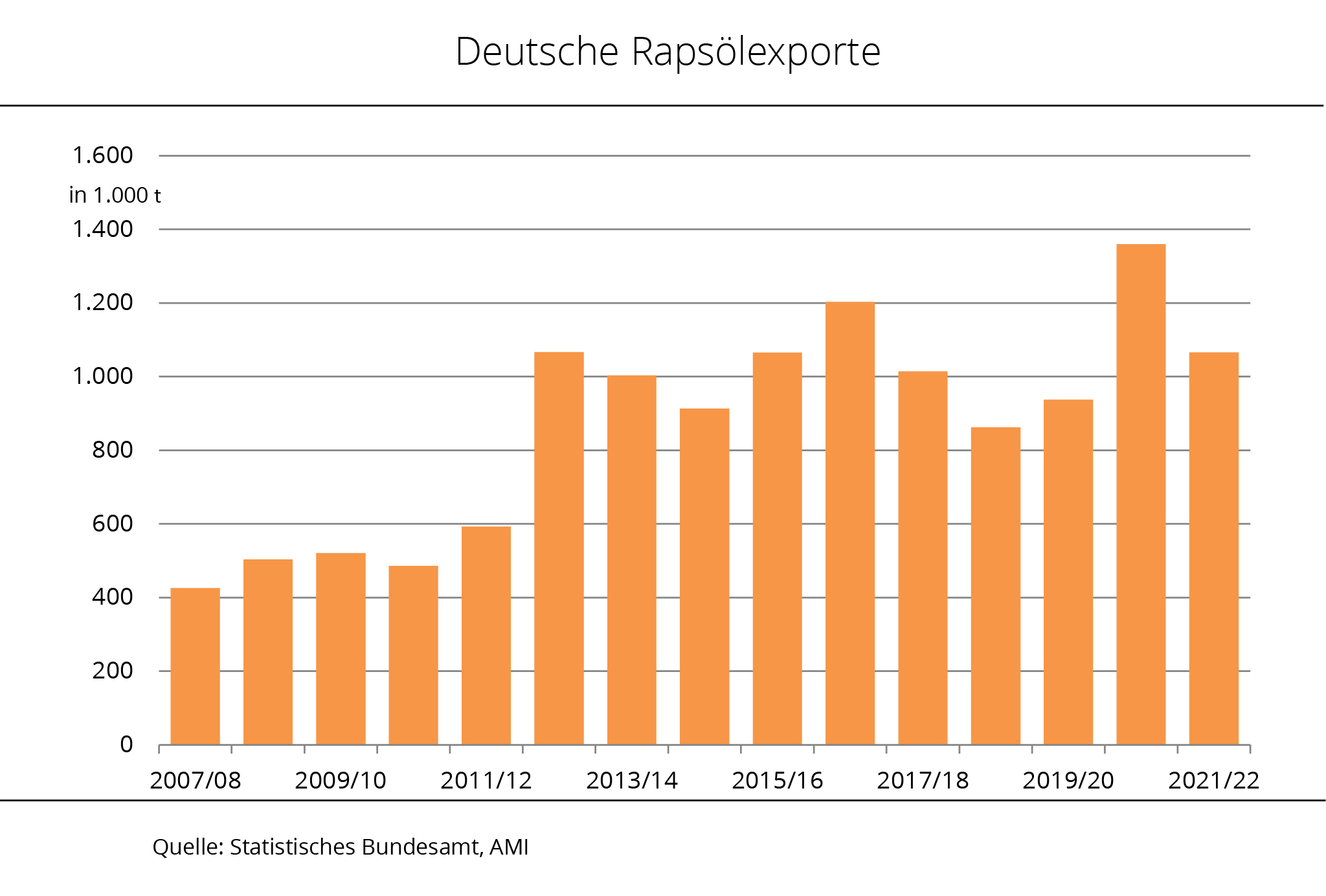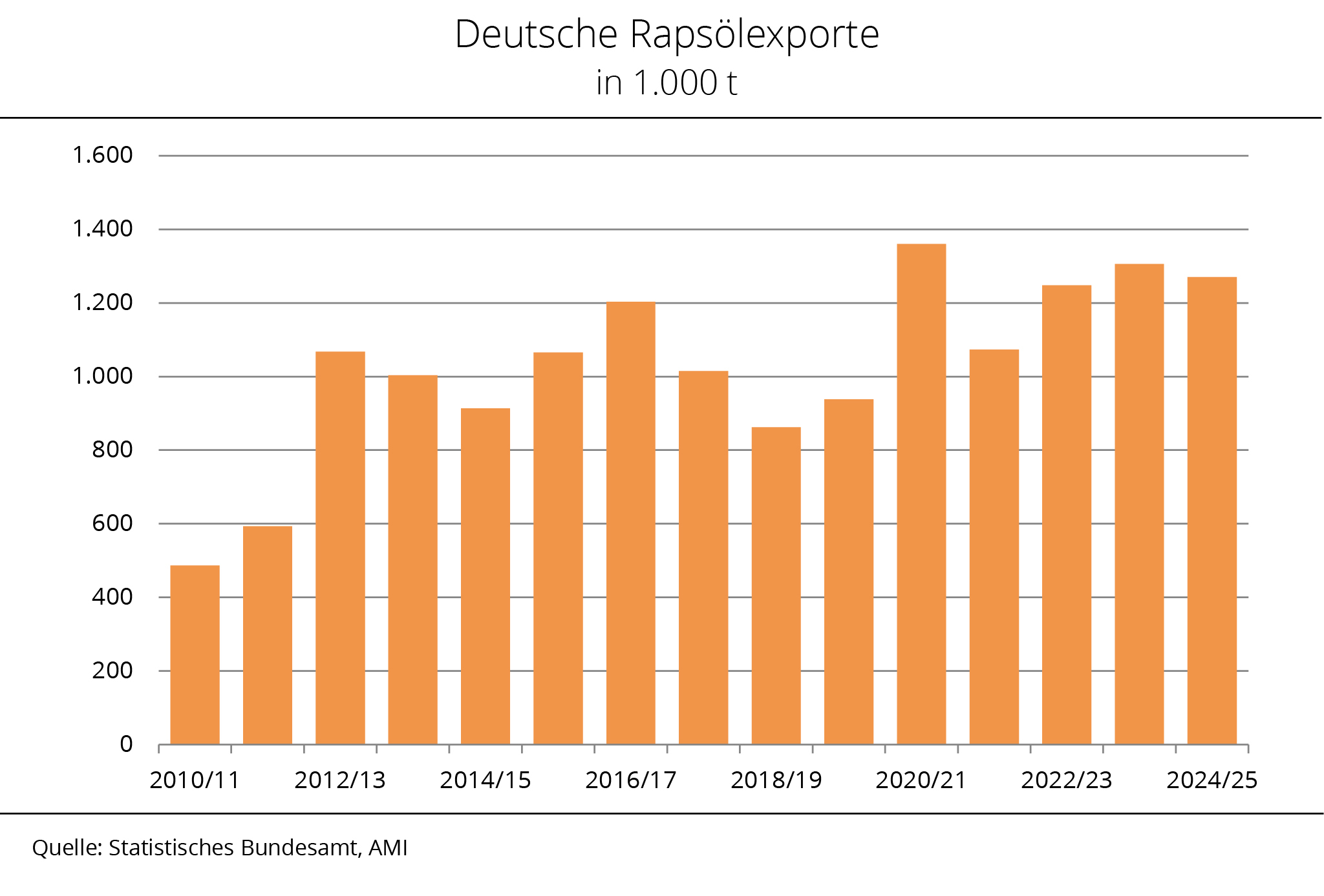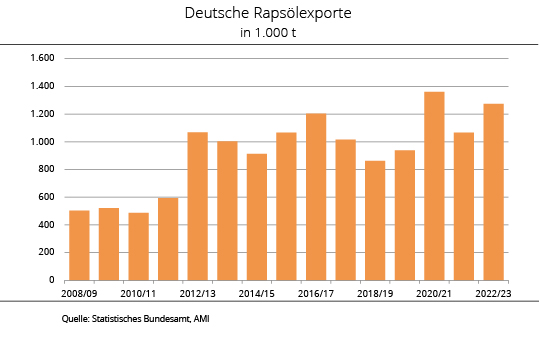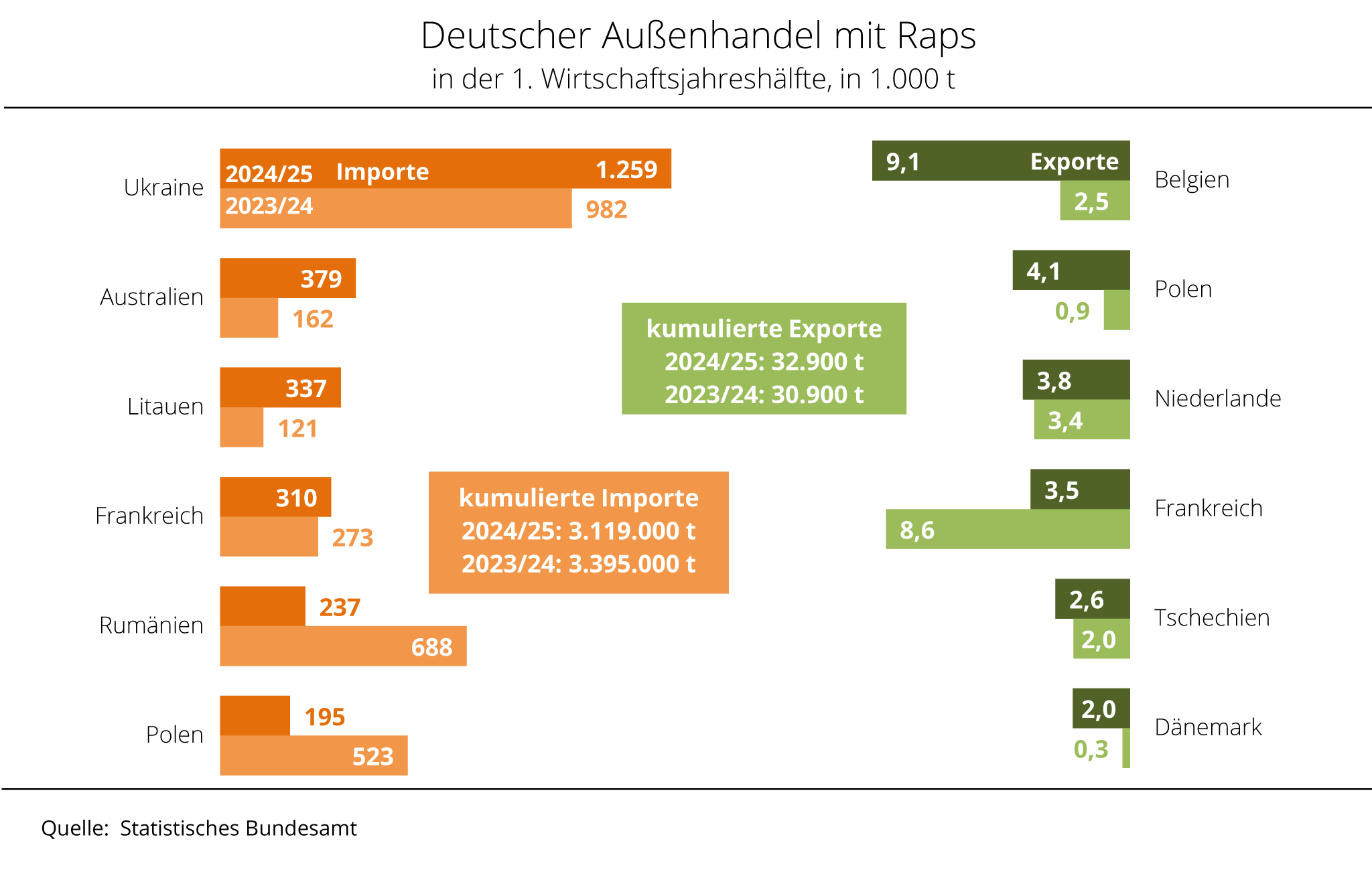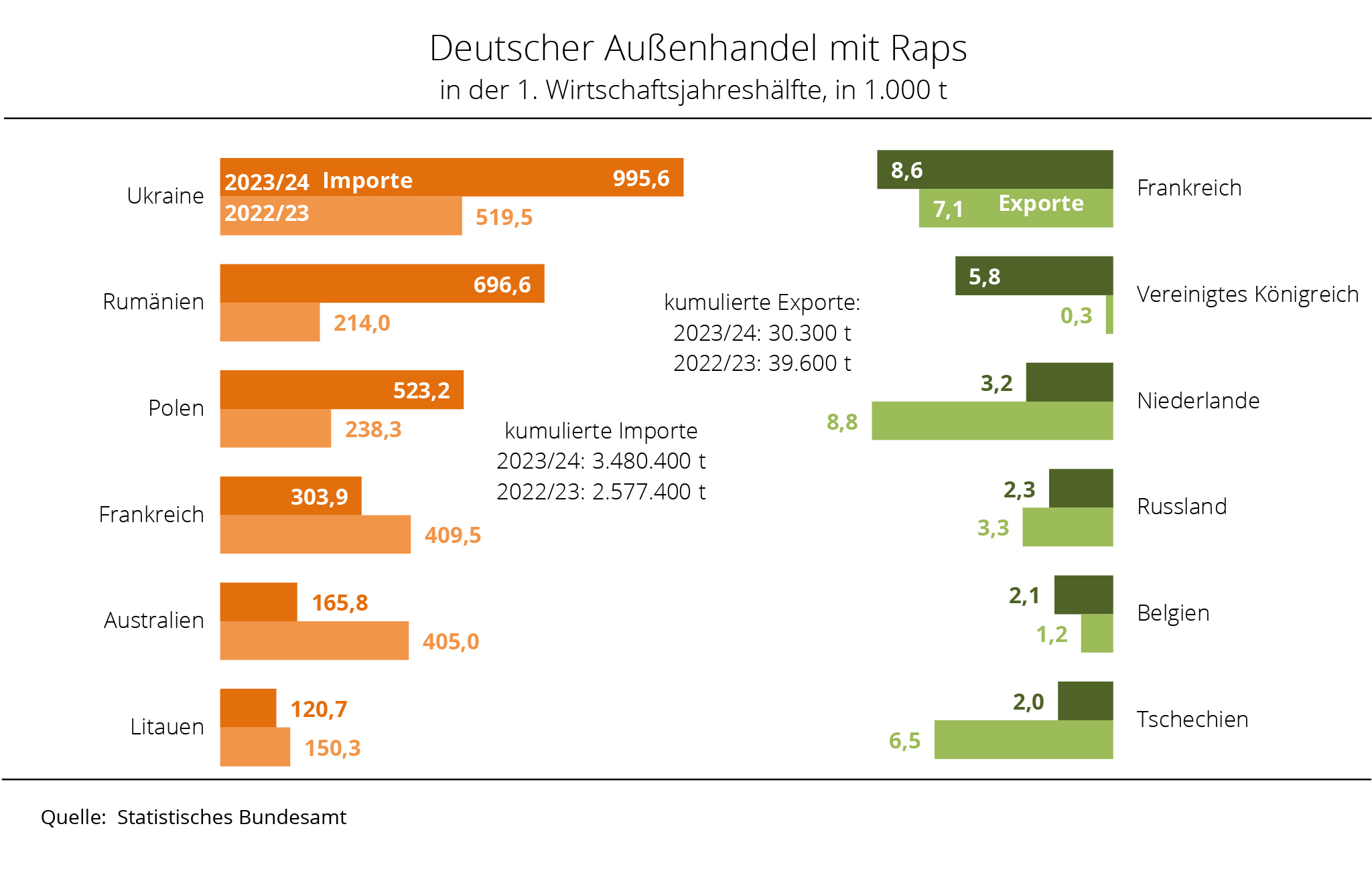Deutschland ist der größte Nettoimporteur in der EU, dementsprechend fallen die Ausfuhren relativ gering aus, trotz der größeren Ernte. In den ersten sechs Monaten der laufenden Saison exportierte die Bundesrepublik nur rund 64.100 t Raps, das sind rund 87 % mehr als im Vorjahreszeitraum. Deutscher Raps geht vor allem in andere EU-Mitgliedsstaaten, zum Beispiel nach Polen (34.600 t), in die Niederlande (7.300 t) und nach Frankreich (5.200 t).