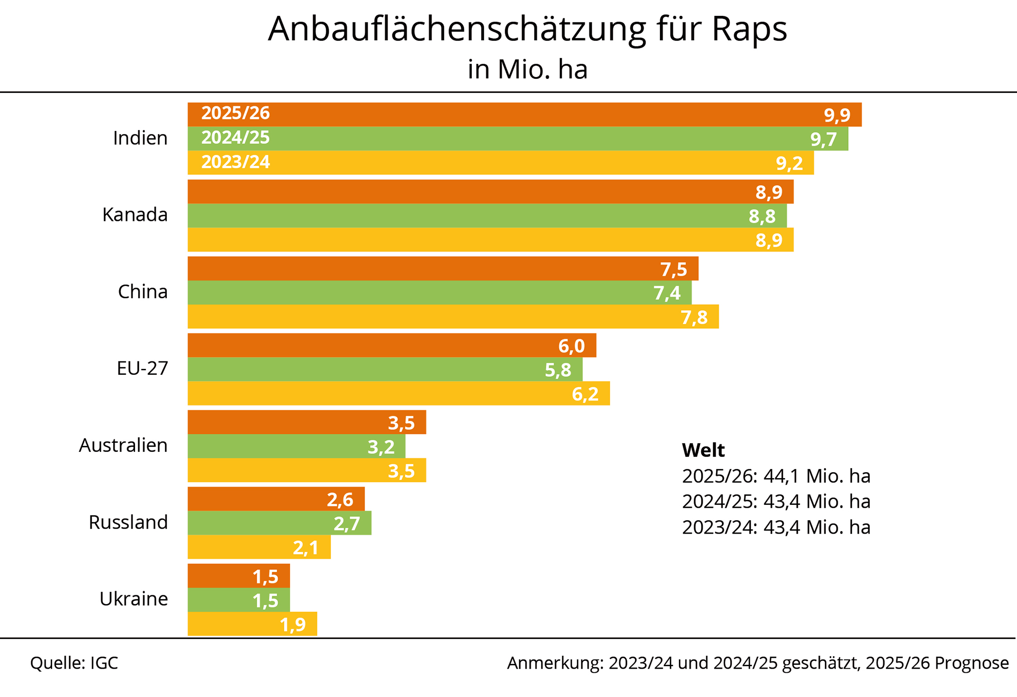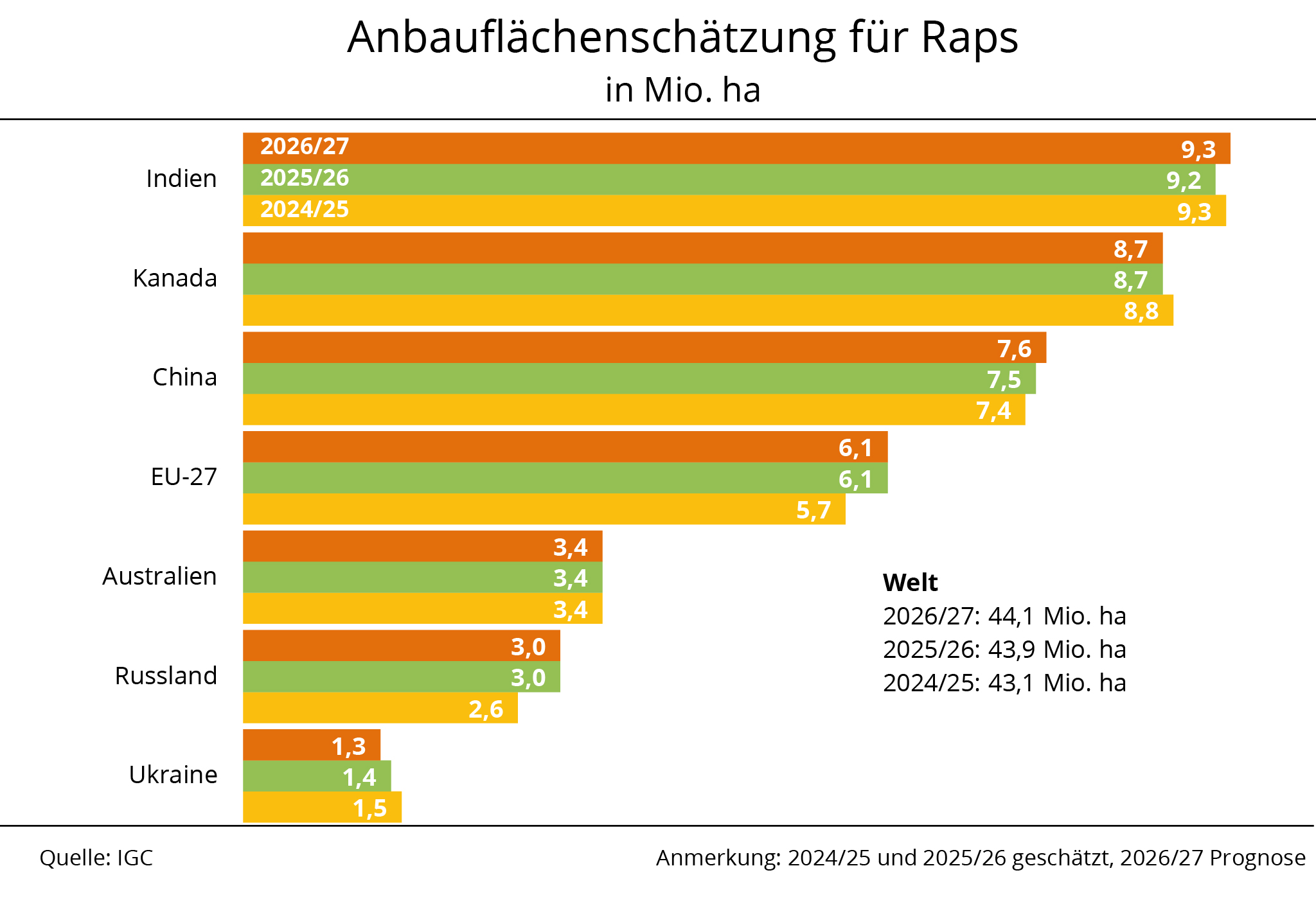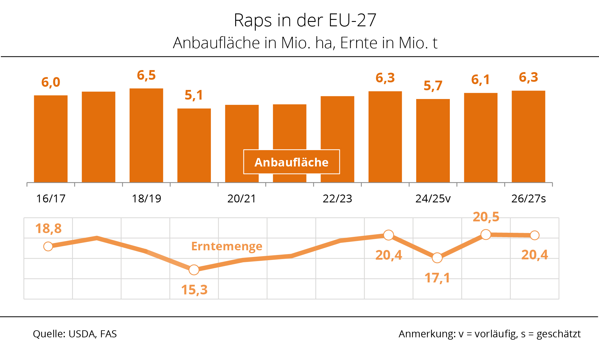 Frankreich, Deutschland, Polen und Rumänien stellen zusammen rund drei Viertel der gesamten EU‑Produktion. In allen genannten Ländern geht der FAS von einer Ausweitung der Anbaufläche aus. Der Internationale Getreiderat (IGC)hatte kürzlich eine zurückhaltendere Einschätzung abgegeben. Er erwartet eine stagnierende Rapsfläche von rund 6,1 Mio. ha.