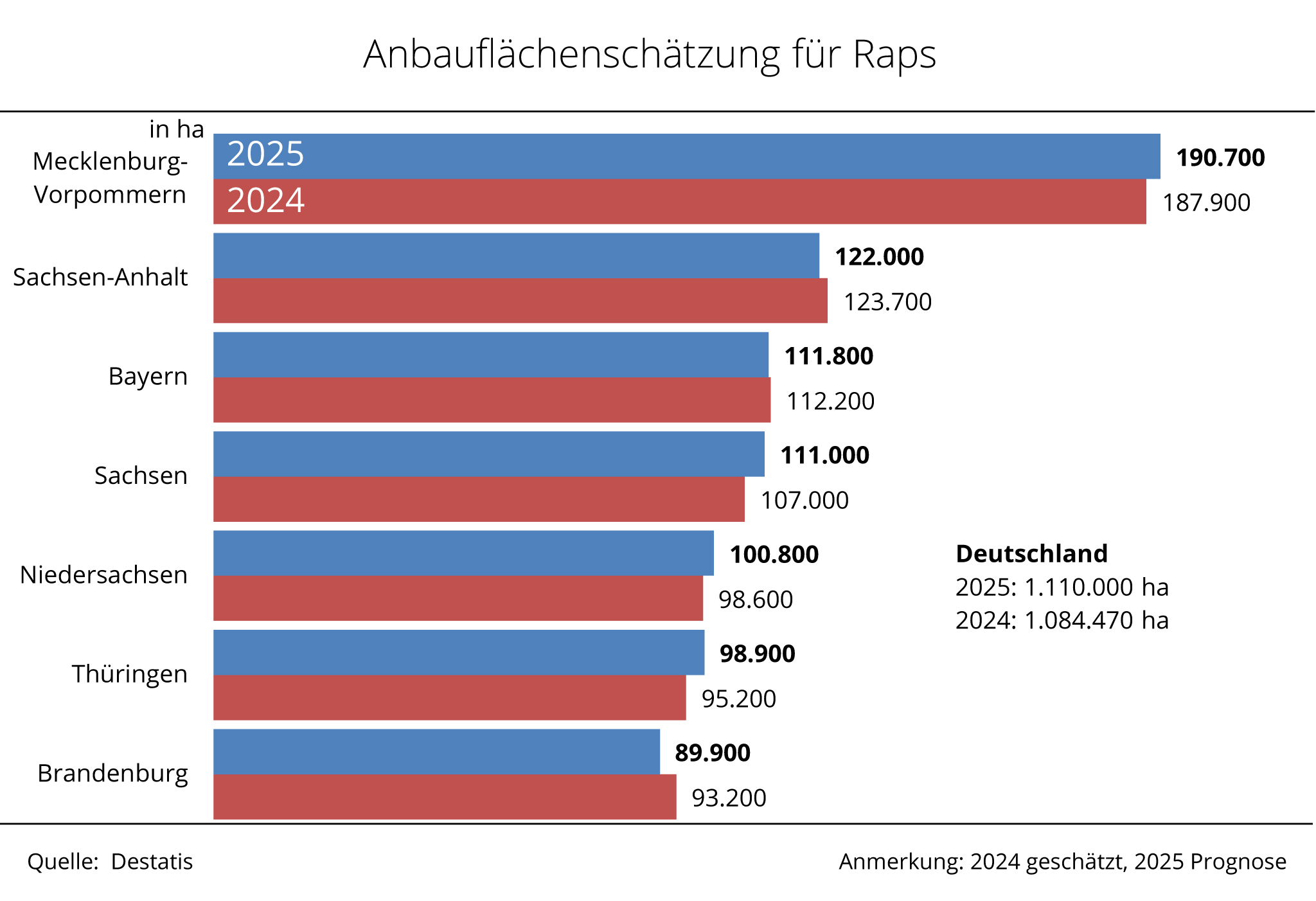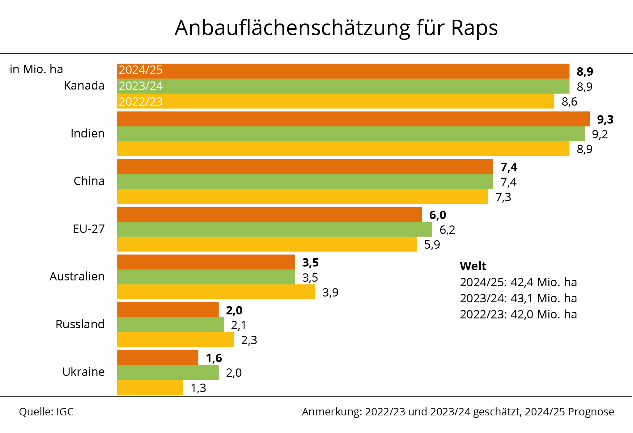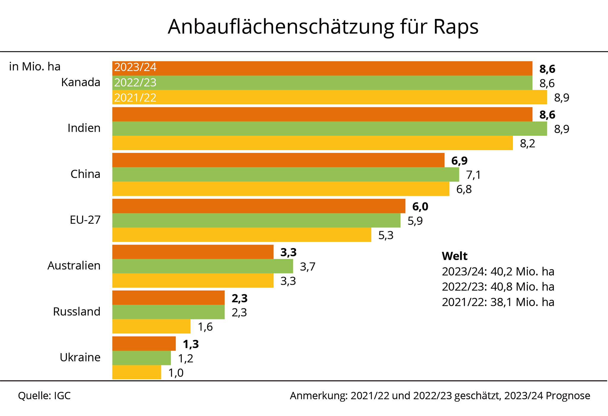 Frankreich, Deutschland, Polen und Rumänien stellen zusammen rund drei Viertel der gesamten EU‑Produktion. In allen genannten Ländern geht der FAS von einer Ausweitung der Anbaufläche aus. Der Internationale Getreiderat (IGC)hatte kürzlich eine zurückhaltendere Einschätzung abgegeben. Er erwartet eine stagnierende Rapsfläche von rund 6,1 Mio. ha.