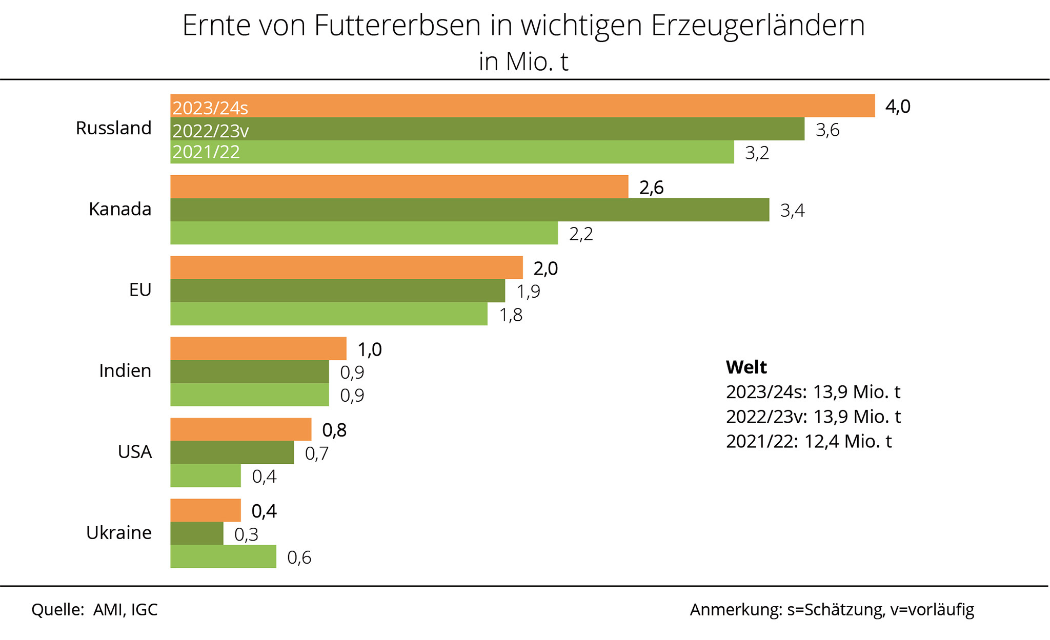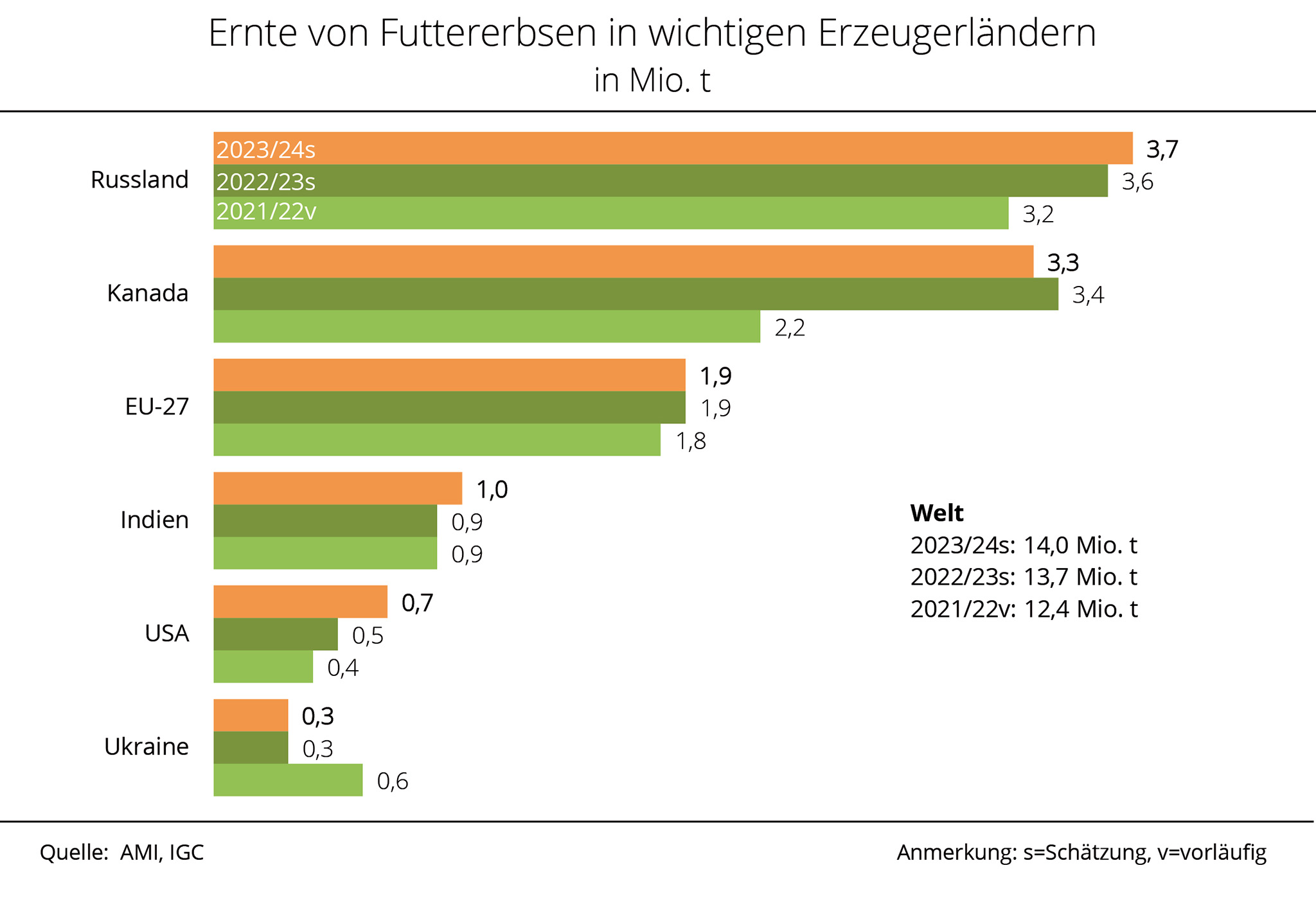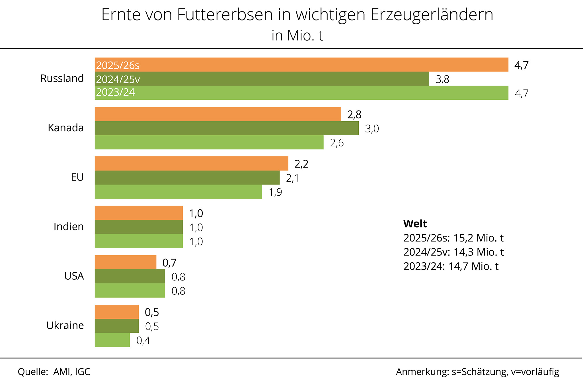 Trotz einer kleineren Anbaufläche ist die Erzeugung 2025 in Russland, dem weltweit größten Erzeuger von Futtererbsen, nach Einschätzung des Internationalen Getreiderates (IGC) um fast 40 % auf den Spitzenwert von 5,3 Mio. t gestiegen. Ausschlaggebend sind nach Recherche der Agrarmarkt Informations-Gesellschaft (mbH) vorrangig die sehr guten Erträge. Für Kanada taxiert der IGC die zur Vermarktung verfügbare Ernte im Vergleich zu 2024/25 auf 3,9 Mio. t und damit um ein Drittel höher. Ursache ist hier die um 8 % ausgedehnte Anbaufläche, Insbesondere in der Provinz Alberta. Eine günstige Witterung in Saskatchewan und Alberta führte zudem zu höheren Erträgen.