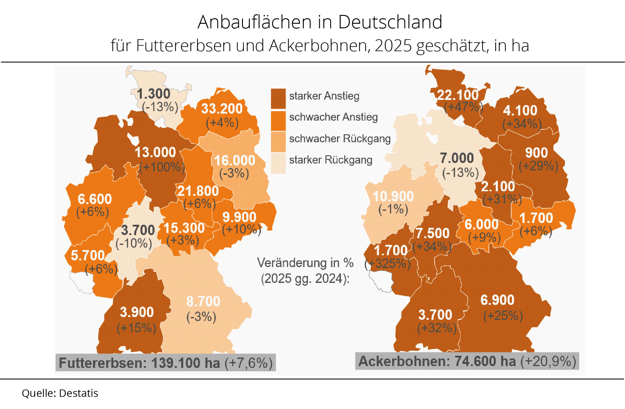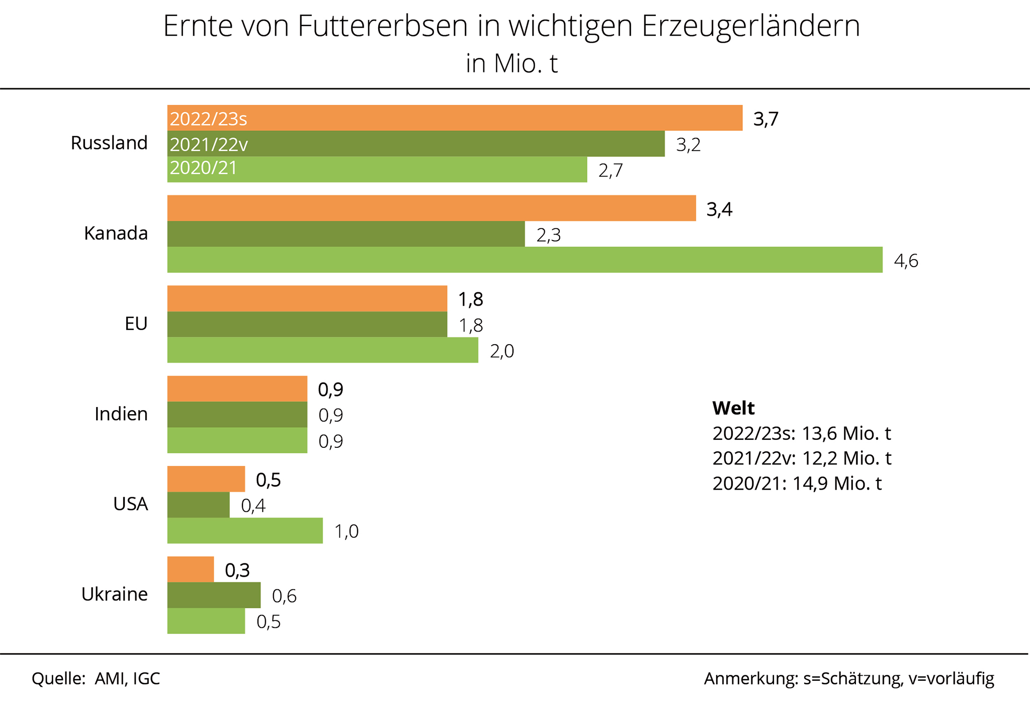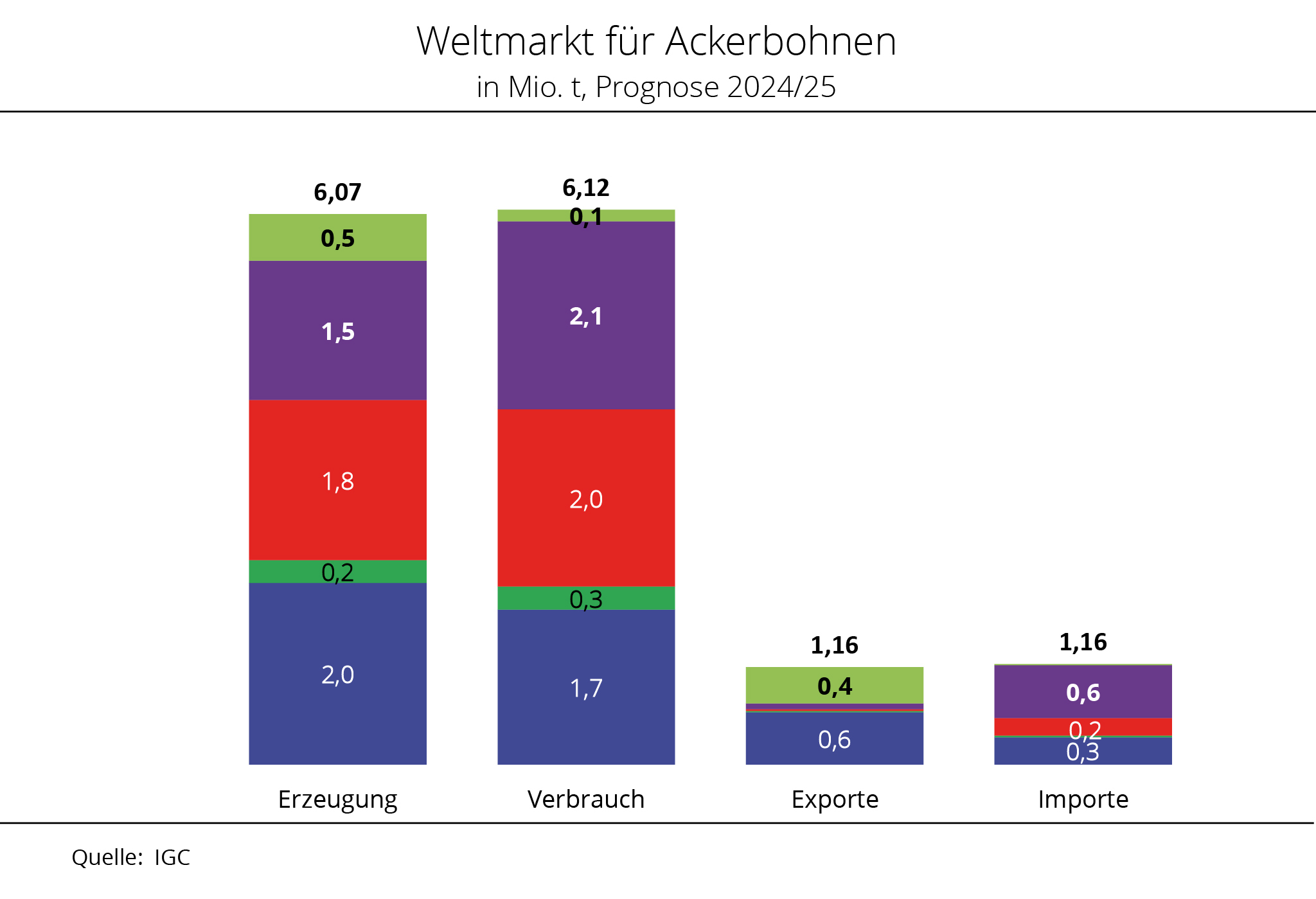 Trotz einer kleineren Anbaufläche ist die Erzeugung 2025 in Russland, dem weltweit größten Erzeuger von Futtererbsen, nach Einschätzung des Internationalen Getreiderates (IGC) um fast 40 % auf den Spitzenwert von 5,3 Mio. t gestiegen. Ausschlaggebend sind nach Recherche der Agrarmarkt Informations-Gesellschaft (mbH) vorrangig die sehr guten Erträge. Für Kanada taxiert der IGC die zur Vermarktung verfügbare Ernte im Vergleich zu 2024/25 auf 3,9 Mio. t und damit um ein Drittel höher. Ursache ist hier die um 8 % ausgedehnte Anbaufläche, Insbesondere in der Provinz Alberta. Eine günstige Witterung in Saskatchewan und Alberta führte zudem zu höheren Erträgen.