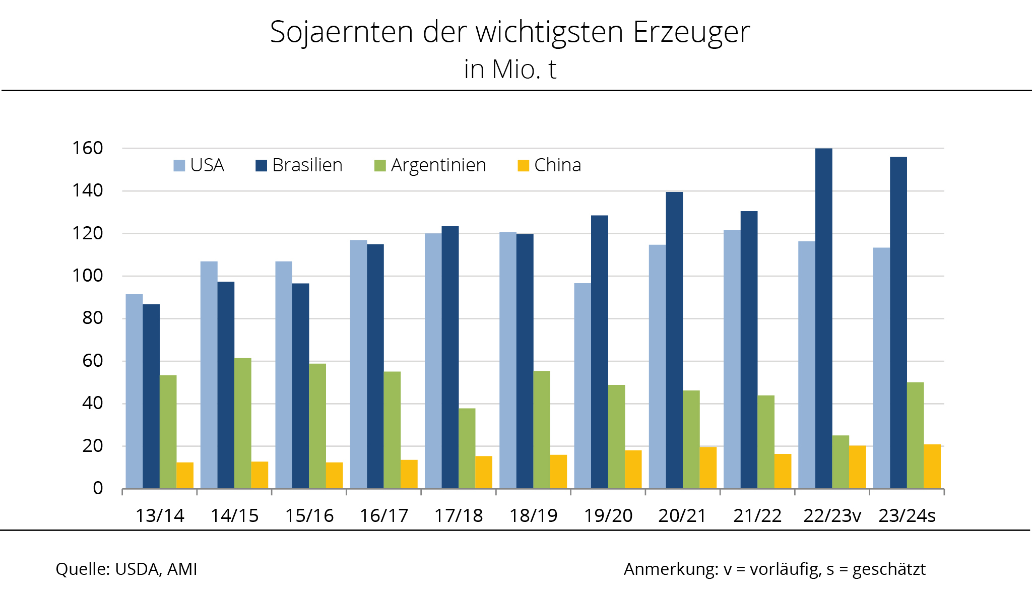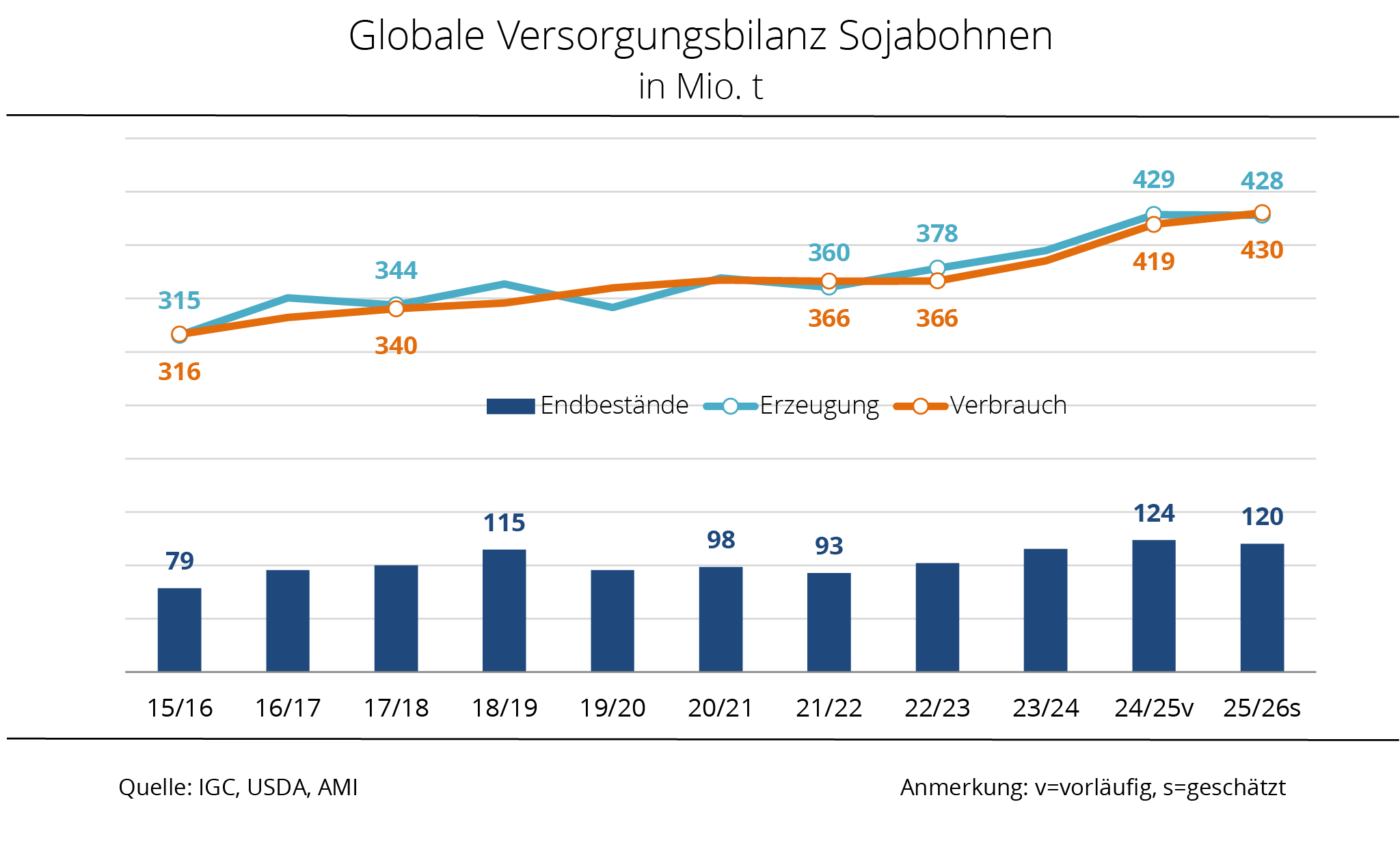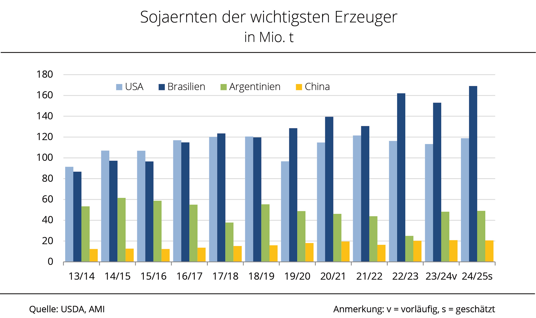 Brasilien, die USA und Argentinien sind mit einem Anteil von insgesamt 80 % die weltweit wichtigsten Erzeuger von Sojabohnen. Mit großem Abstand folgt China mit einem Anteil von 5 %. In Brasilien soll nach Schätzungen des US-Landwirtschaftsministeriums (USDA) im laufenden Wirtschaftsjahr die Rekordmenge von rund 178 Mio. t Sojabohnen geerntet werden – nach 171,5 Mio. t im Vorjahr. Mit einer Flächenausweitung um 1,7 auf 49,1 Mio. ha baut Brasilien seine Spitzenposition vor den USA weiter aus. In den Vereinigten Staaten ist die Sojabohnenernte bereits Ende des Jahres 2025 abgeschlossen worden. Dort wurden rund 116,0 Mio. t geerntet. Das entspricht einem Minus von rund 3,1 Mio. t im Vergleich zum Vorjahr.