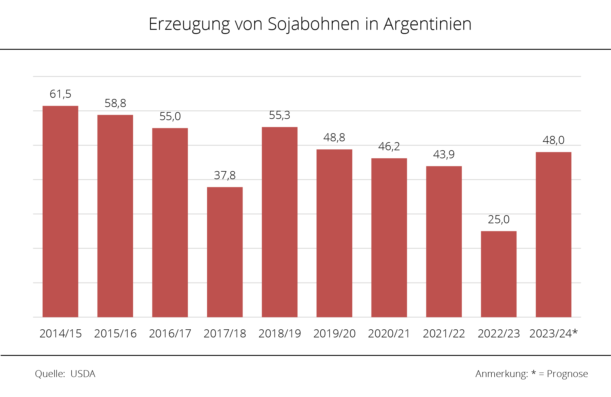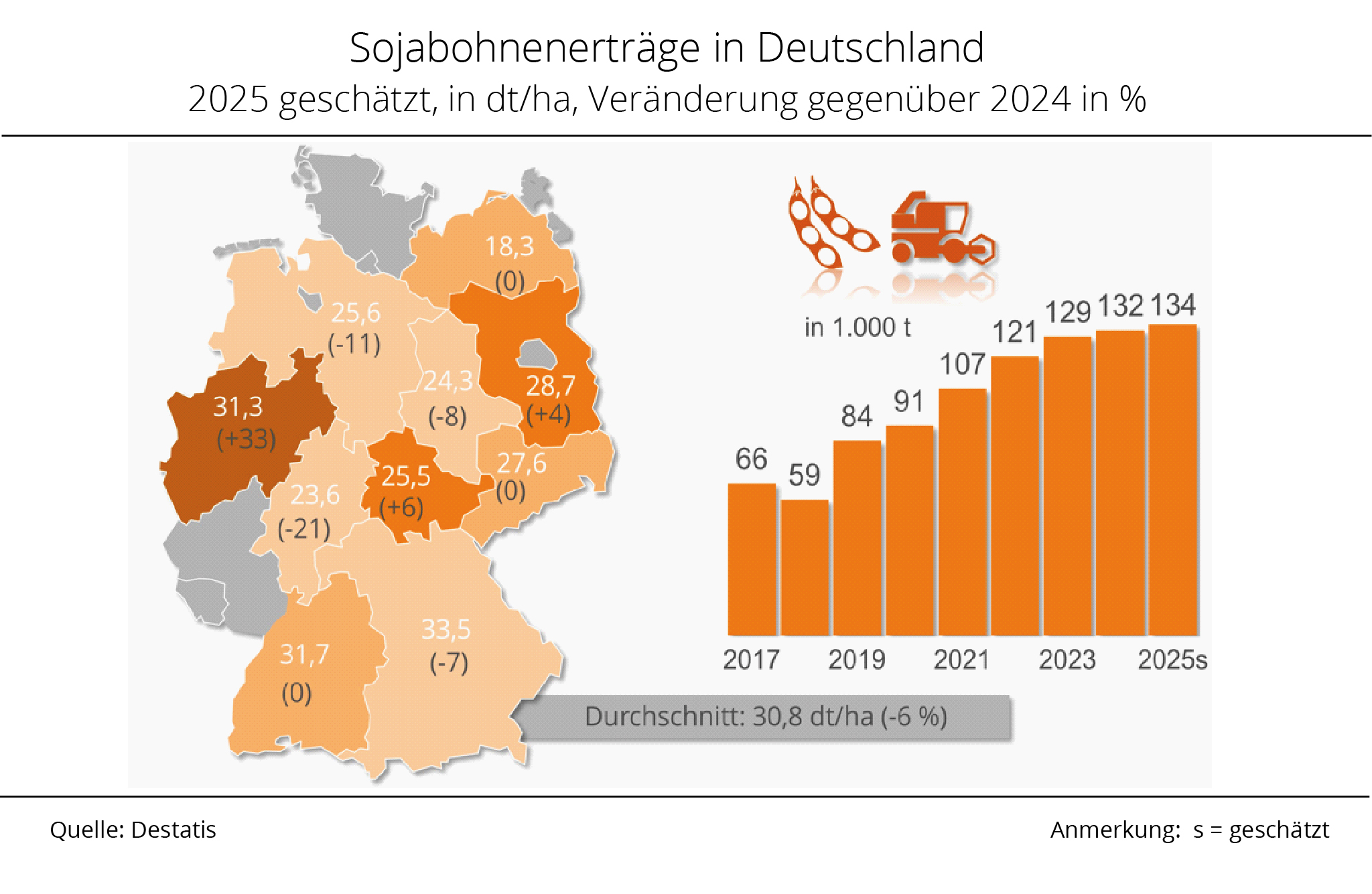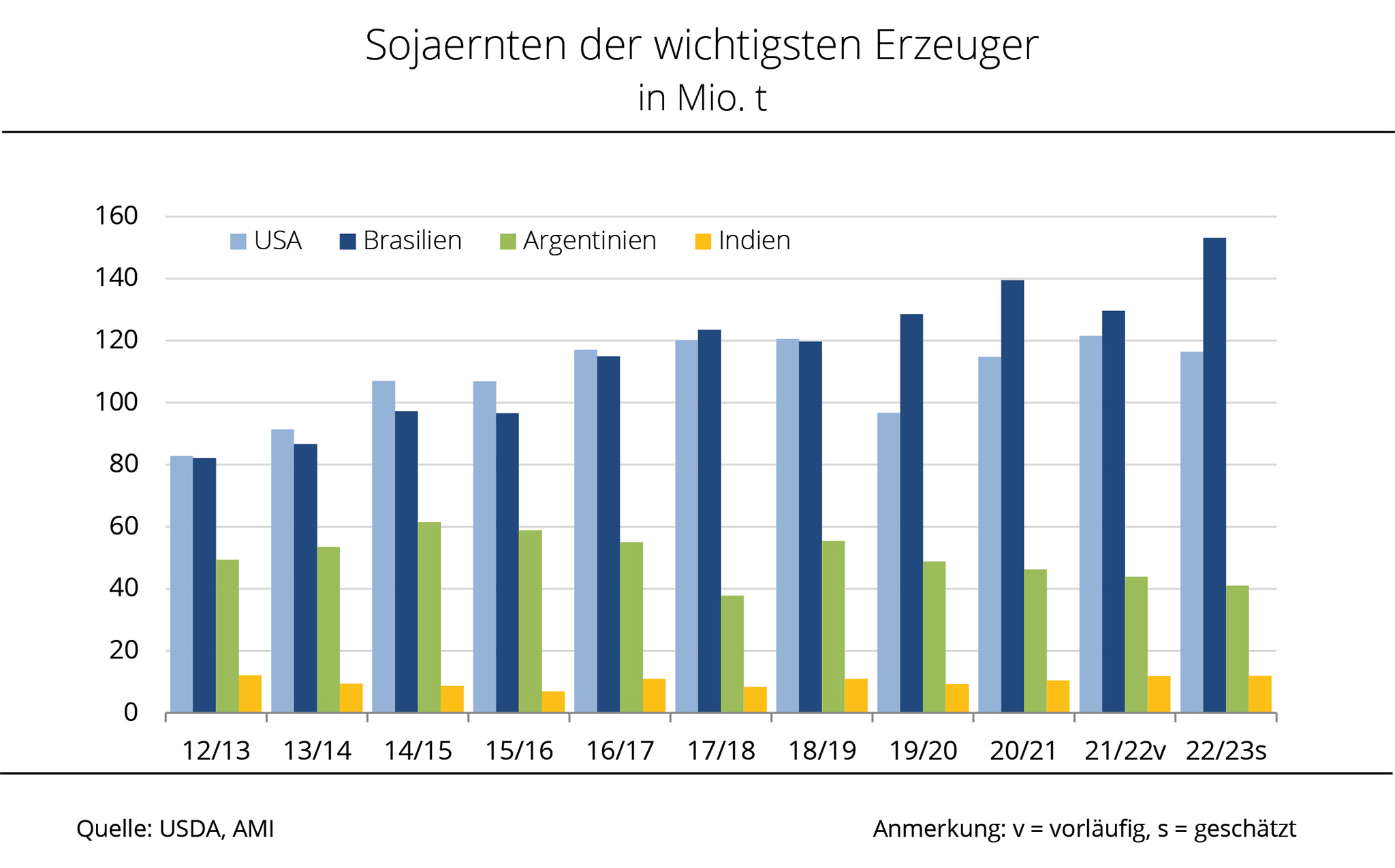 Brasilien, die USA und Argentinien sind mit einem Anteil von insgesamt 80 % die weltweit wichtigsten Erzeuger von Sojabohnen. Mit großem Abstand folgt China mit einem Anteil von 5 %. In Brasilien soll nach Schätzungen des US-Landwirtschaftsministeriums (USDA) im laufenden Wirtschaftsjahr die Rekordmenge von rund 178 Mio. t Sojabohnen geerntet werden – nach 171,5 Mio. t im Vorjahr. Mit einer Flächenausweitung um 1,7 auf 49,1 Mio. ha baut Brasilien seine Spitzenposition vor den USA weiter aus. In den Vereinigten Staaten ist die Sojabohnenernte bereits Ende des Jahres 2025 abgeschlossen worden. Dort wurden rund 116,0 Mio. t geerntet. Das entspricht einem Minus von rund 3,1 Mio. t im Vergleich zum Vorjahr.