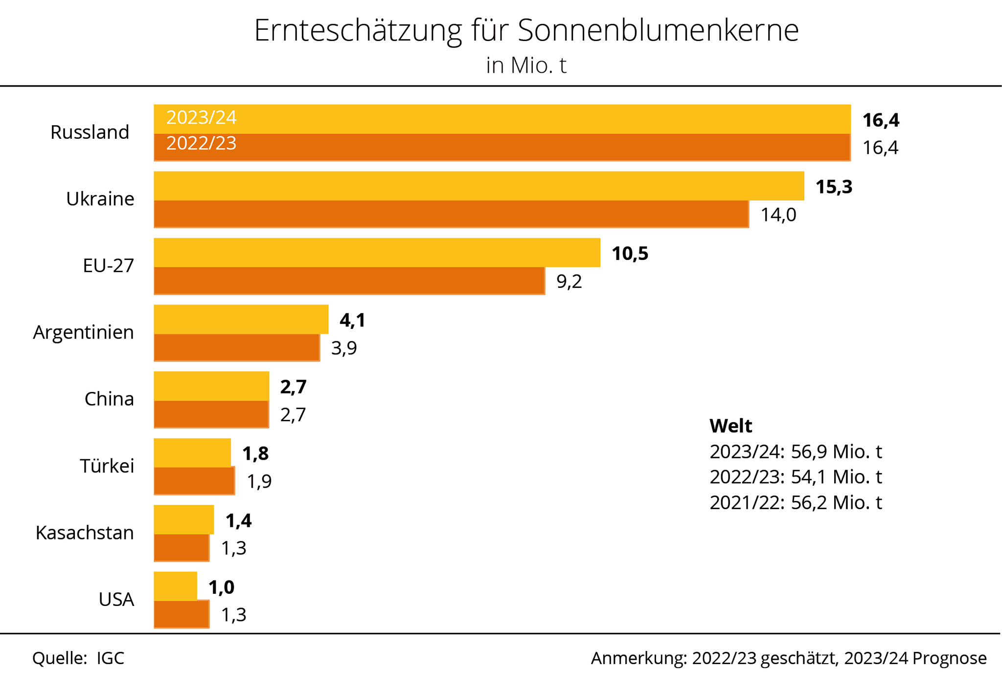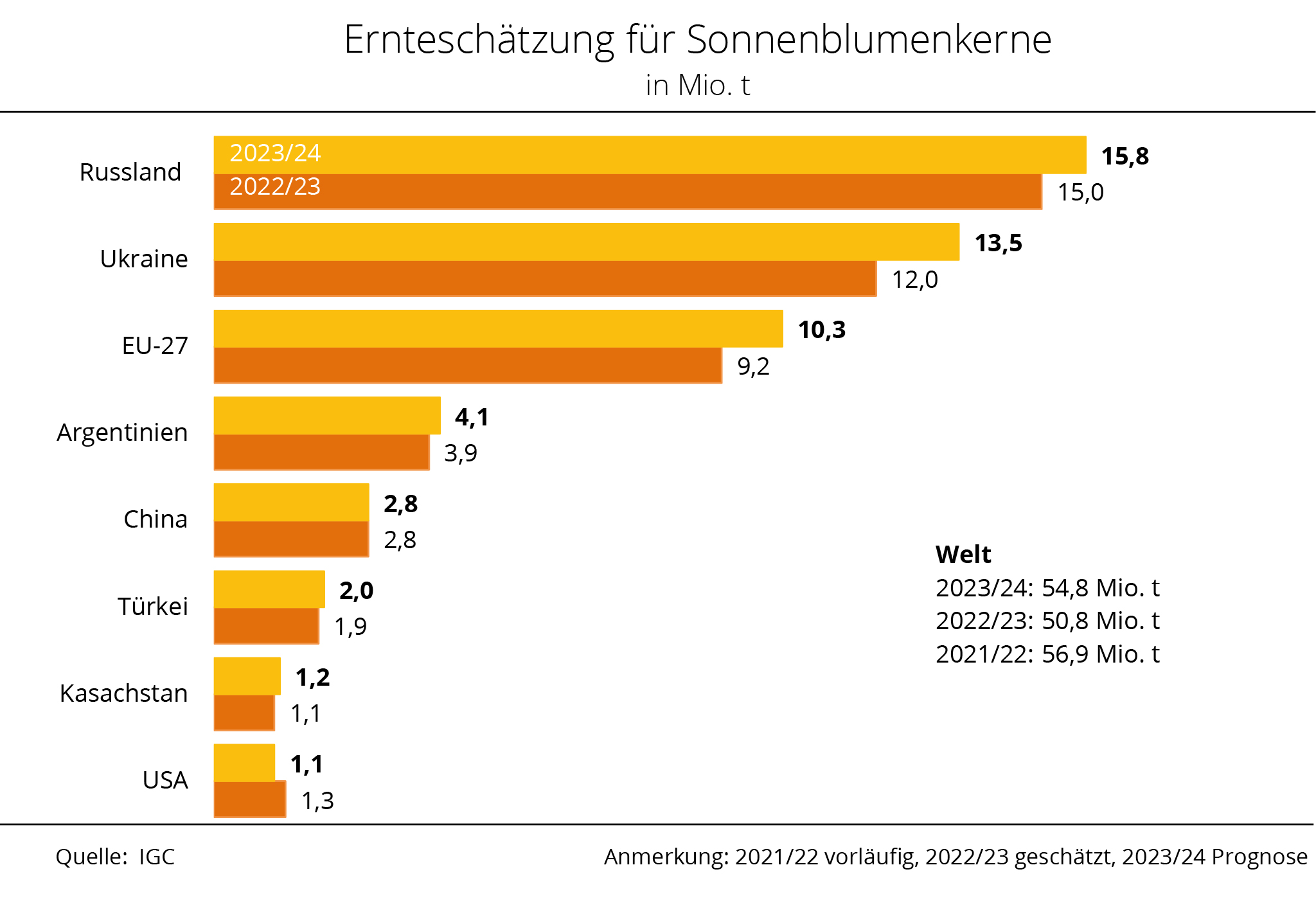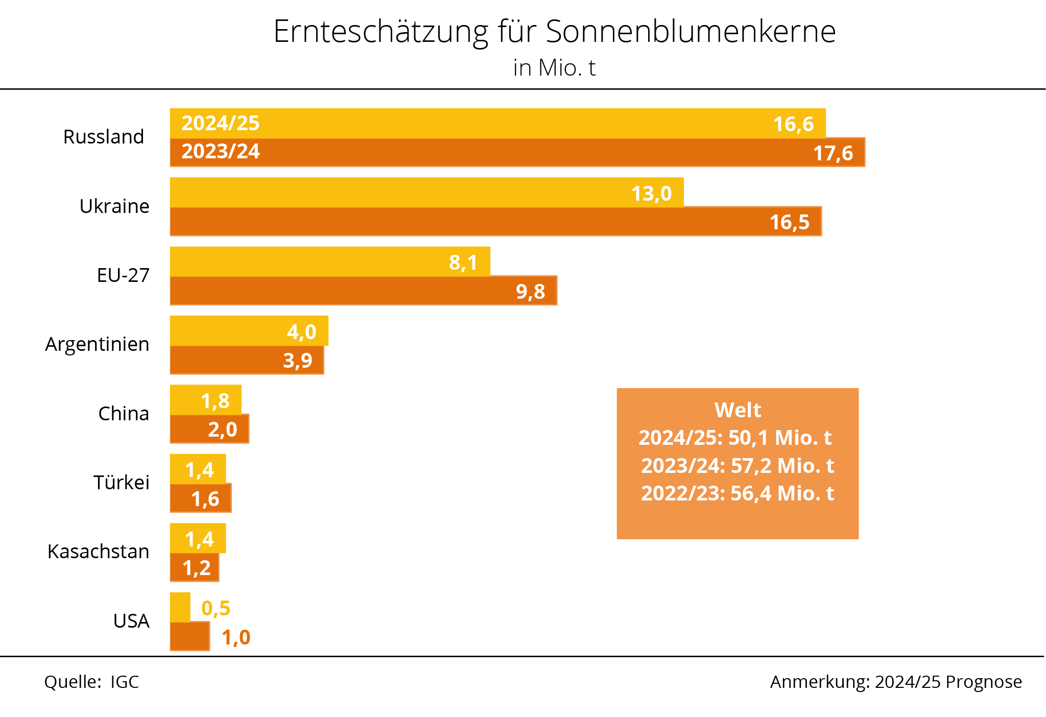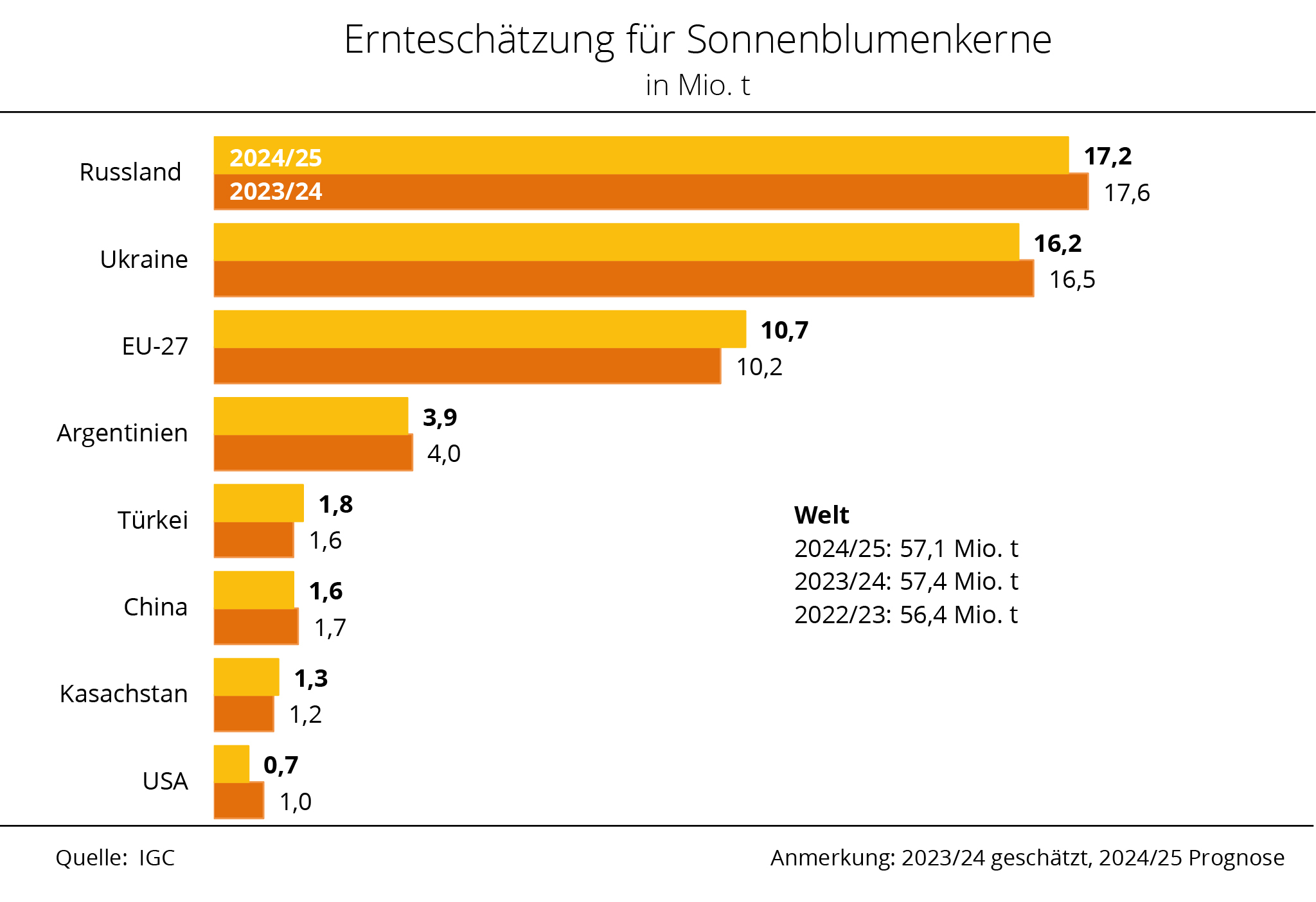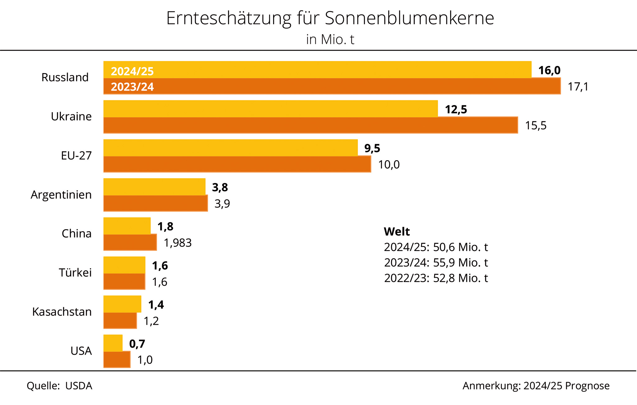 Nach jüngsten Angaben des US-Landwirtschaftsministeriums (USDA) dürfte sich die weltweite Erzeugung von Sonnenblumenkernen in der laufenden Vermarktungssaison auf 54,1 Mio. t belaufen. Das wären nicht nur 2,1 Mio. t mehr als bislang erwartet, auch das Vorjahresniveau von knapp 52,1 Mio. t wird damit deutlich übertroffen.