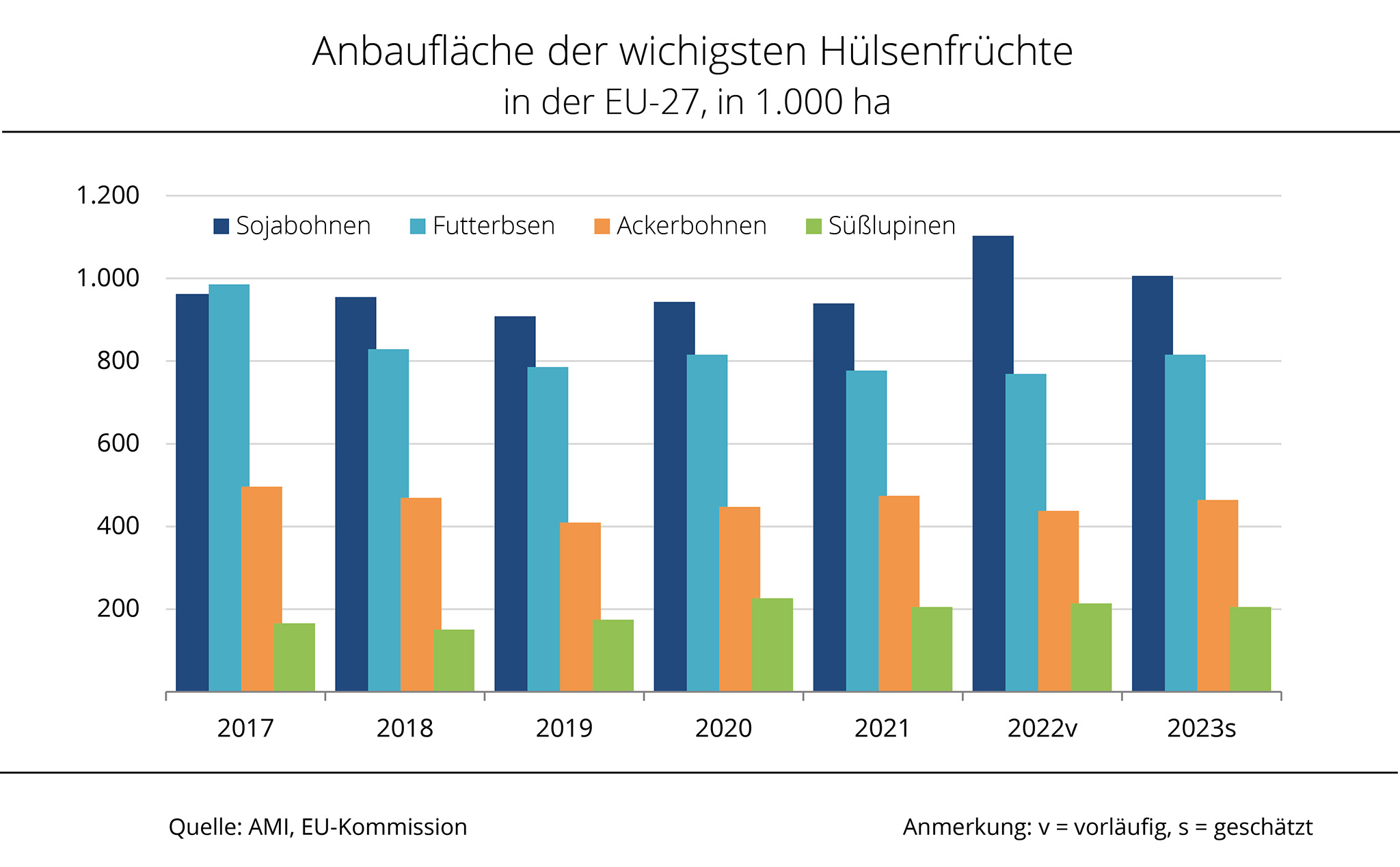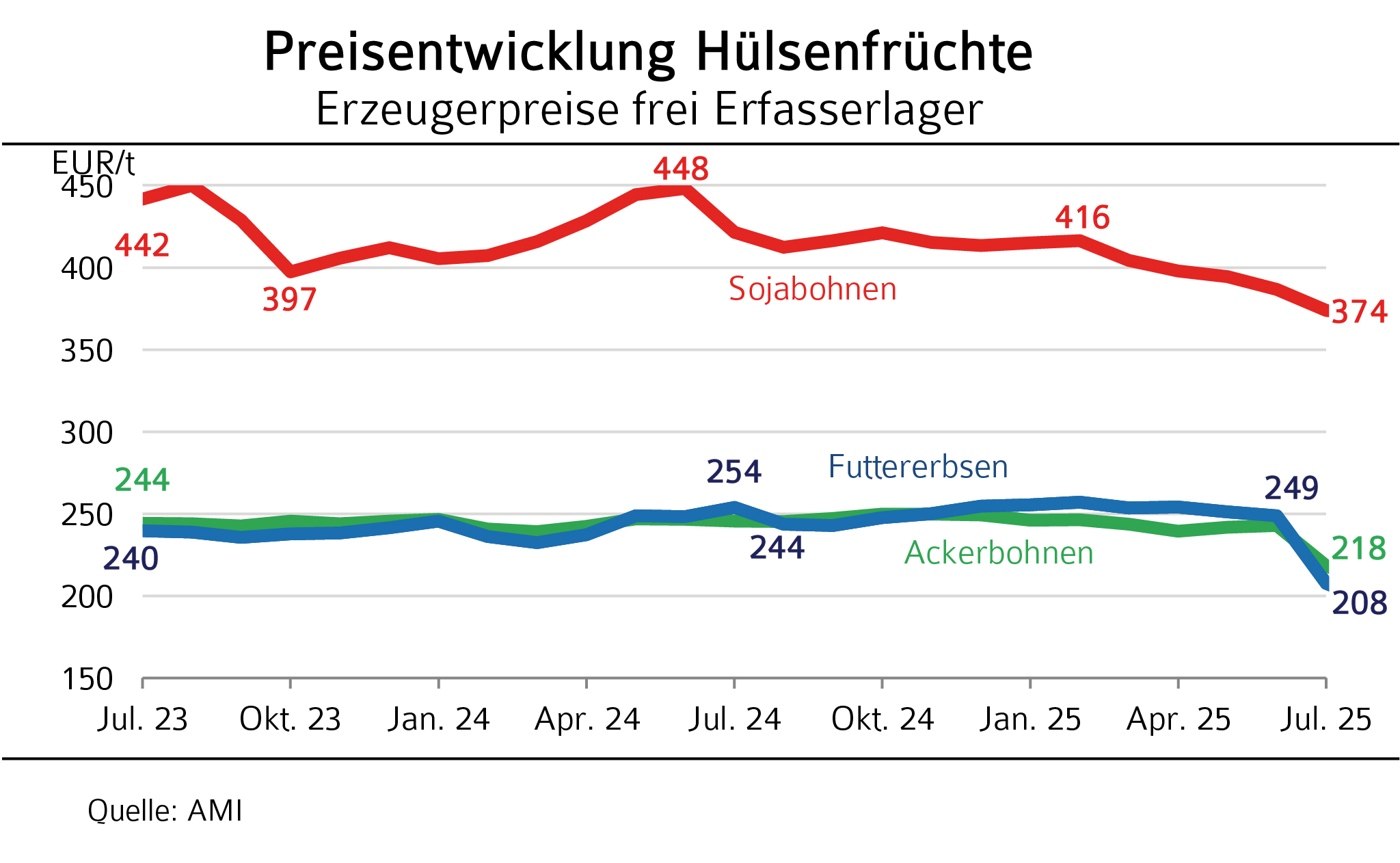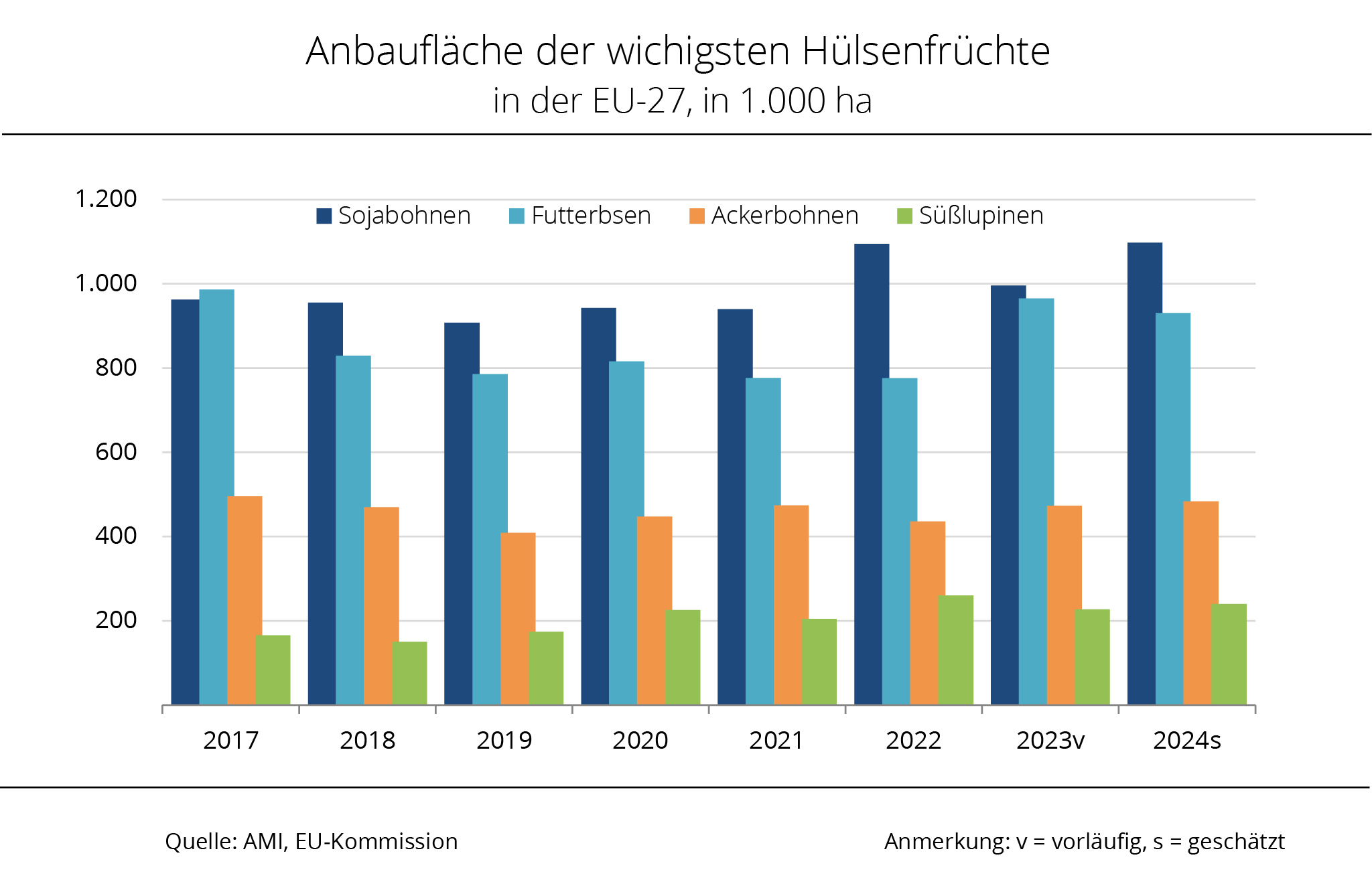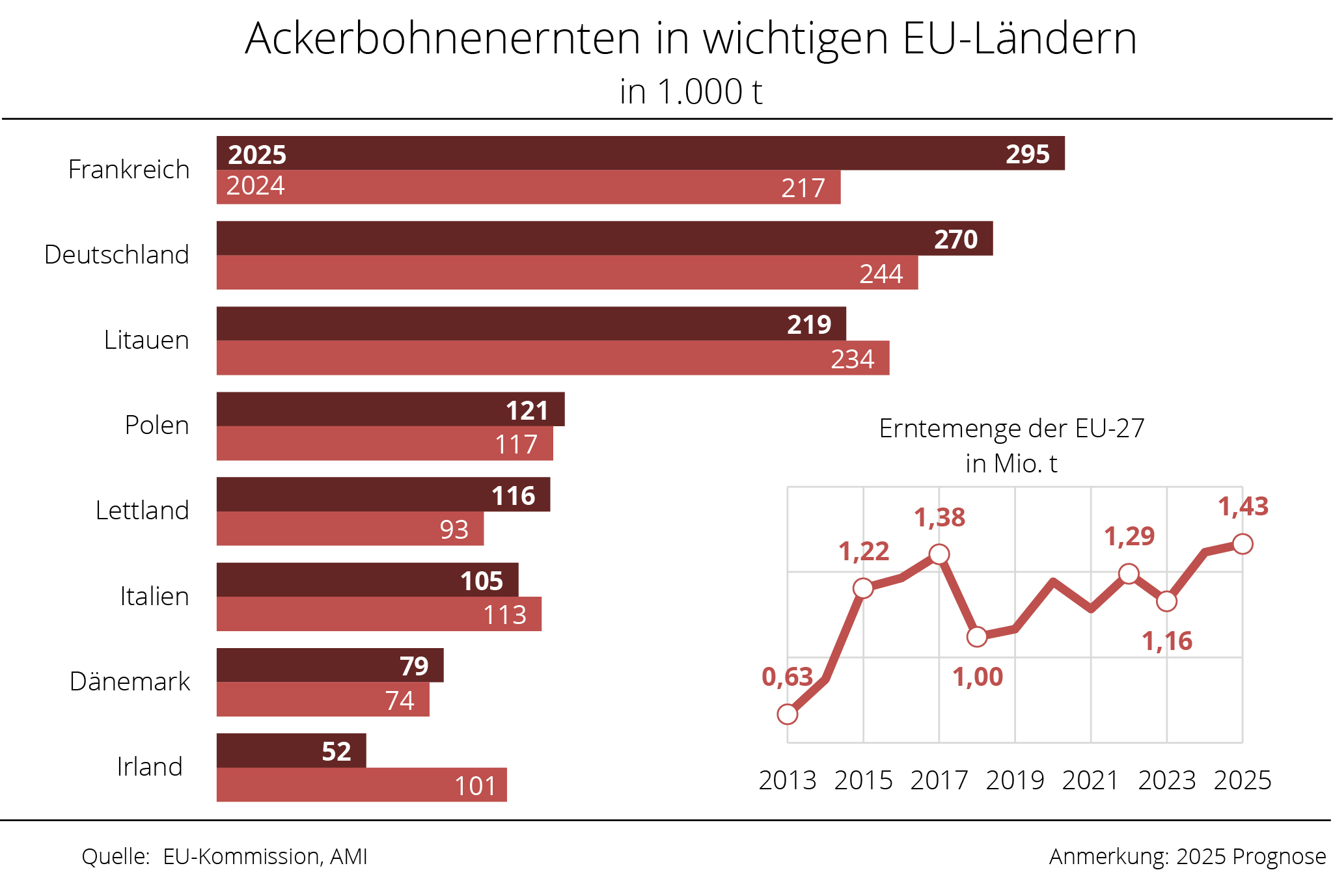 Die Europäische Kommission erwartet nach einer Schätzung von Ende März in der EU im Jahr 2026 eine Ernte von gut 7,0 Mio. t Hülsenfrüchte; dies wären 1 % weniger als im Vorjahr. Der Rückgang ist nach Einschätzung der Agrarmarkt Informations-Gesellschaft (mbH) vorrangig auf eine leichte Reduzierung der Anbaufläche zurückzuführen, denn die Erträge werden im Mittel bislang knapp über Vorjahresniveau taxiert.