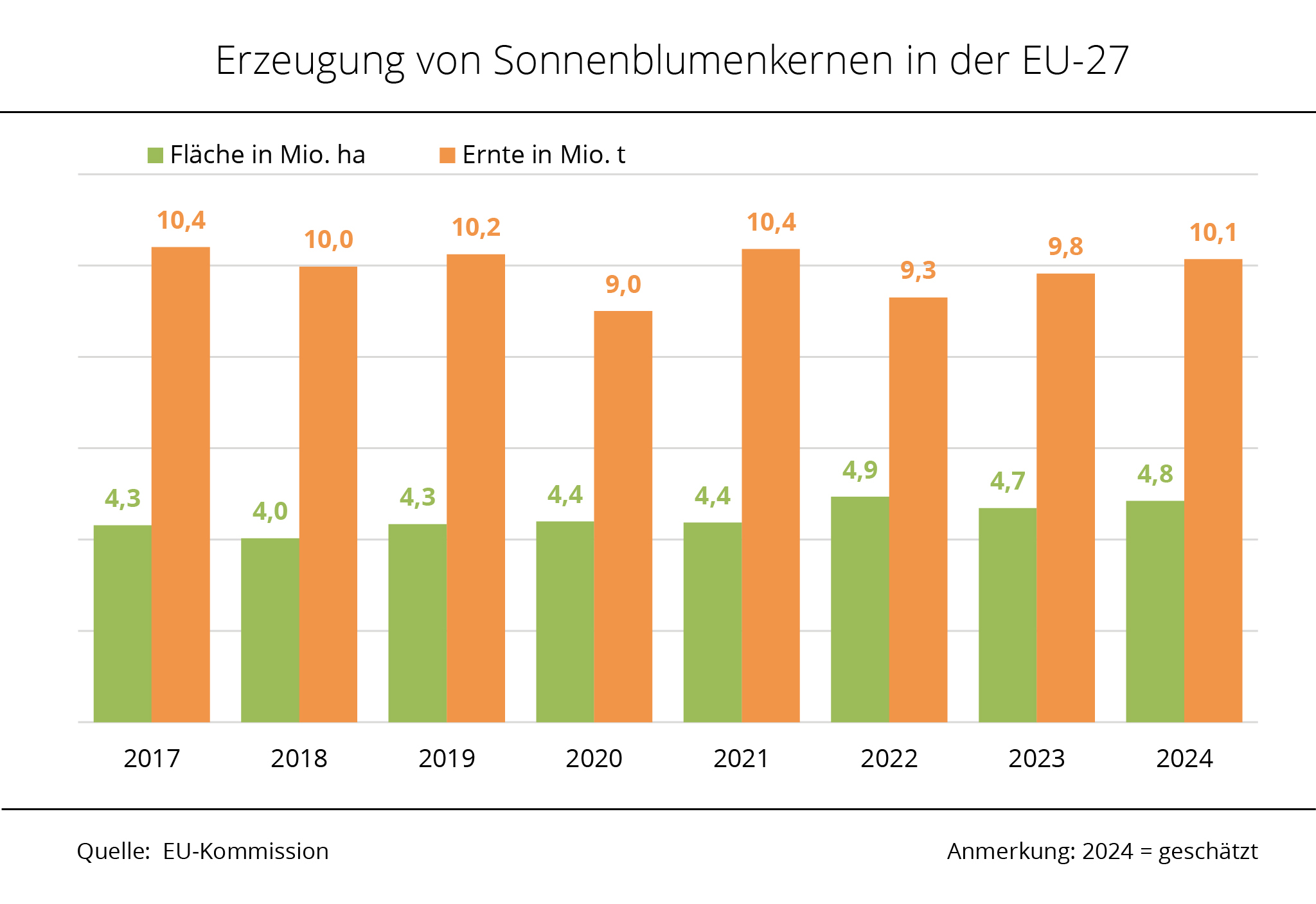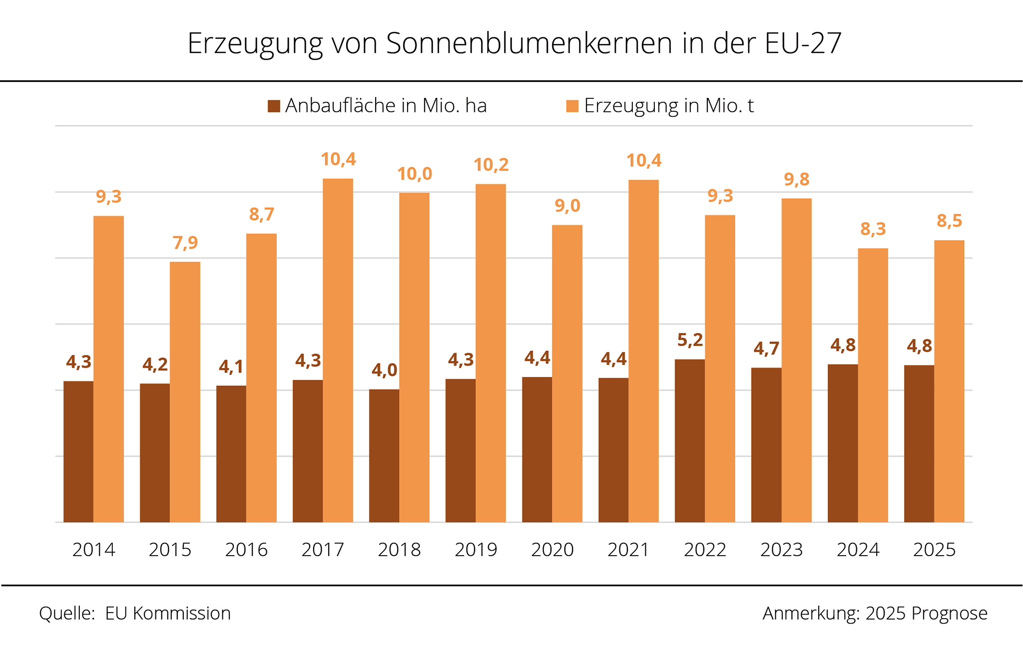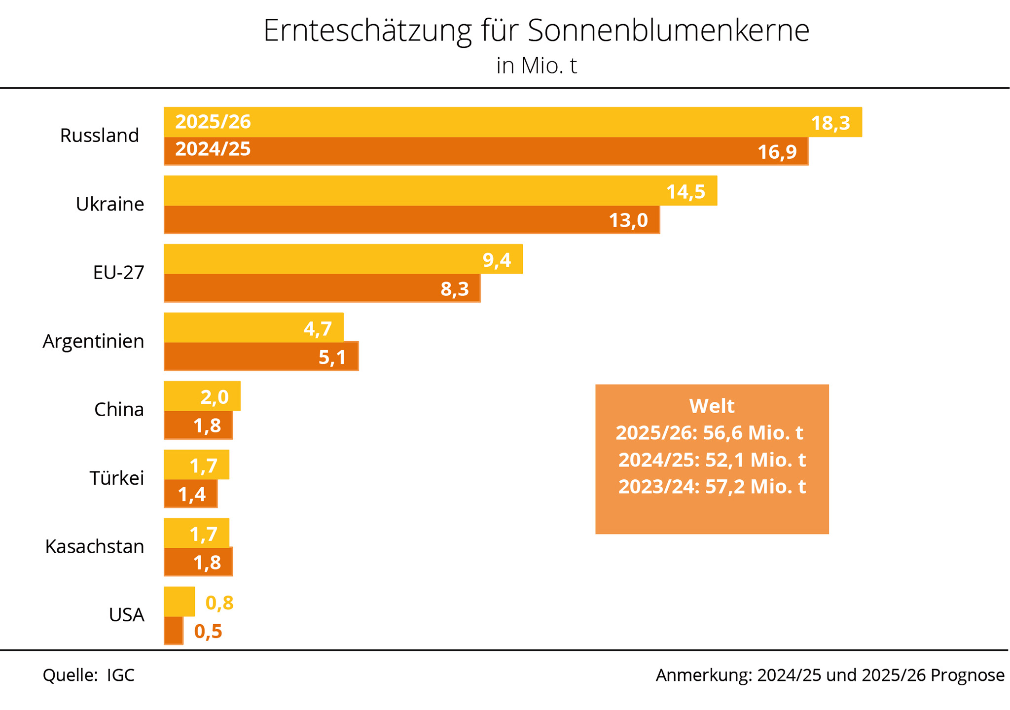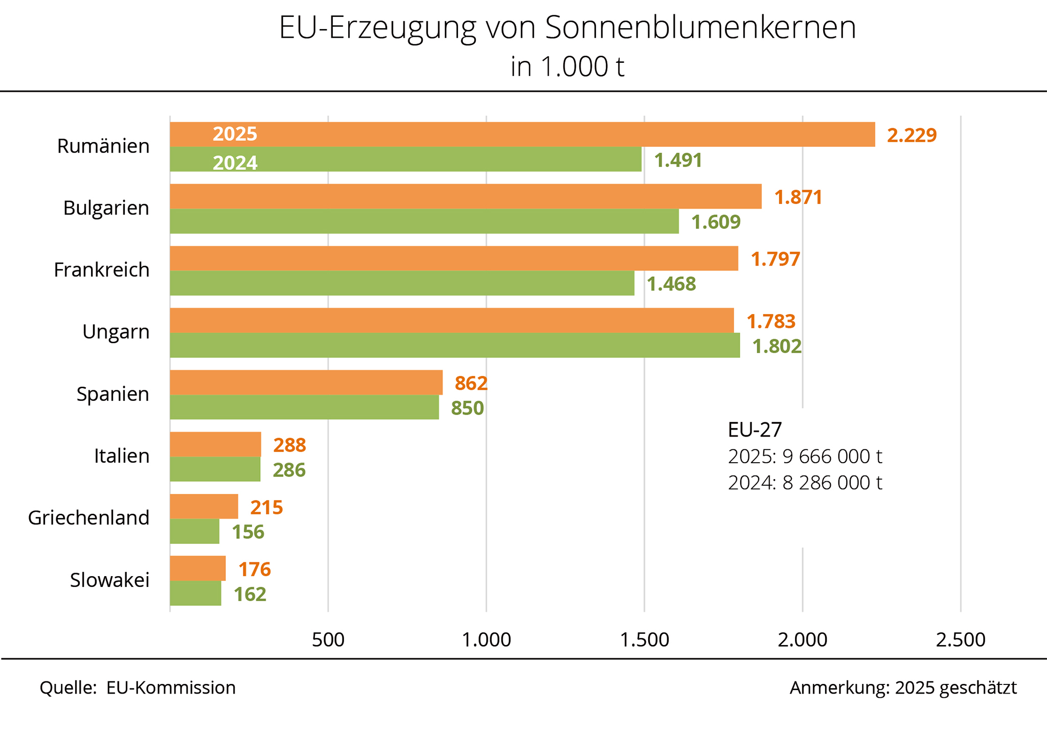Nach der jüngsten Prognose der EU-Kommission wird in der EU-27 im Jahr 2026 eine Sonnenblumenernte von 9,6 Mio. t erwartet, rund 1,2 Mio. t mehr als im Vorjahr. Das wäre die größte Ernte seit 3 Jahren. Diese Erwartung fußt insbesondere auf einer rund 5 % größeren EU-Anbaufläche. Insbesondere in Rumänien, Frankreich und Bulgarien wird mit einer deutlichen Steigerung der Erzeugung gerechnet.