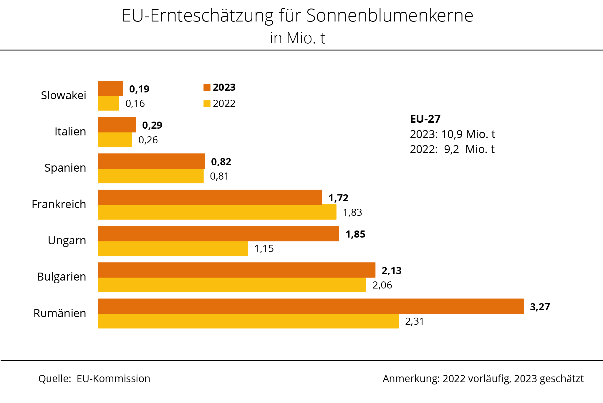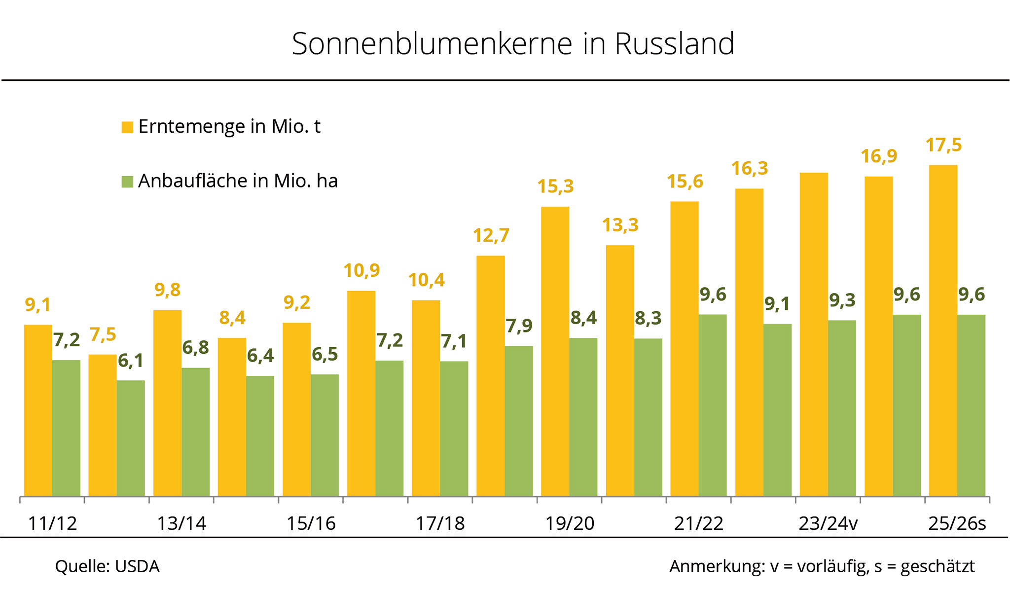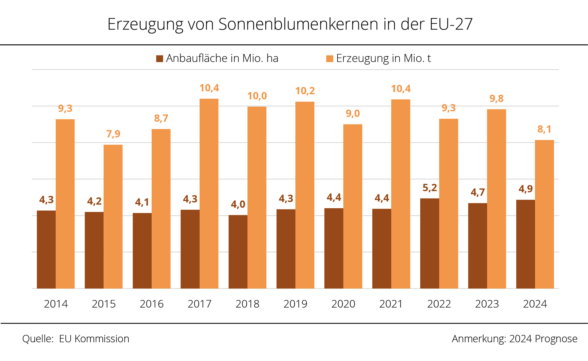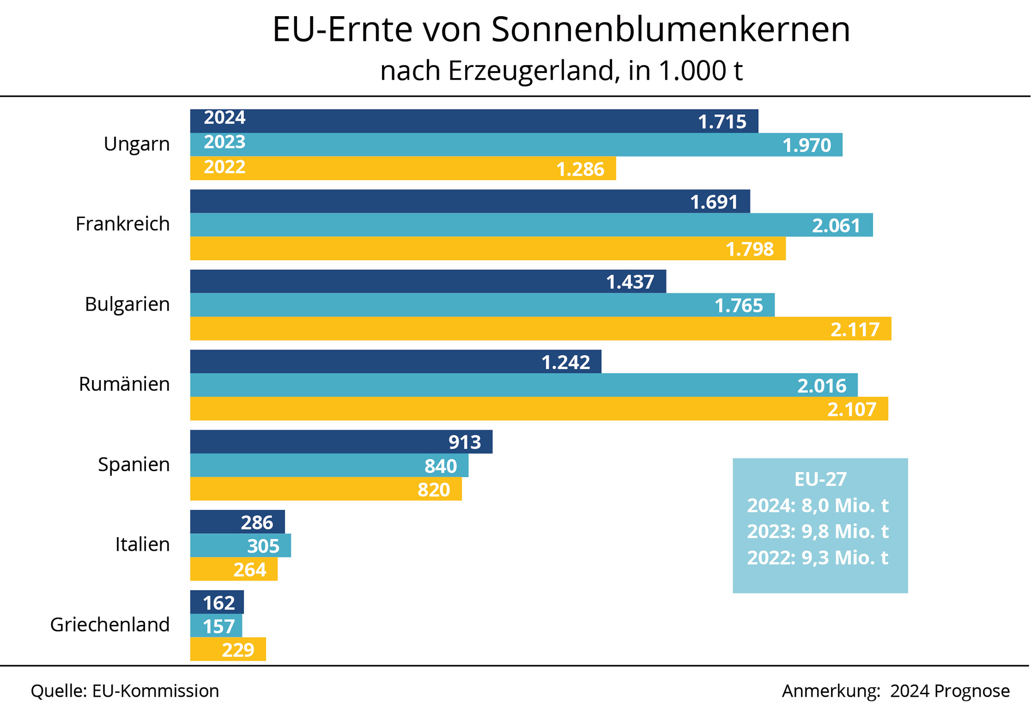 Nach der jüngsten Prognose der EU-Kommission wird in der EU-27 im Jahr 2026 eine Sonnenblumenernte von 9,6 Mio. t erwartet, rund 1,2 Mio. t mehr als im Vorjahr. Das wäre die größte Ernte seit 3 Jahren. Diese Erwartung fußt insbesondere auf einer rund 5 % größeren EU-Anbaufläche. Insbesondere in Rumänien, Frankreich und Bulgarien wird mit einer deutlichen Steigerung der Erzeugung gerechnet.