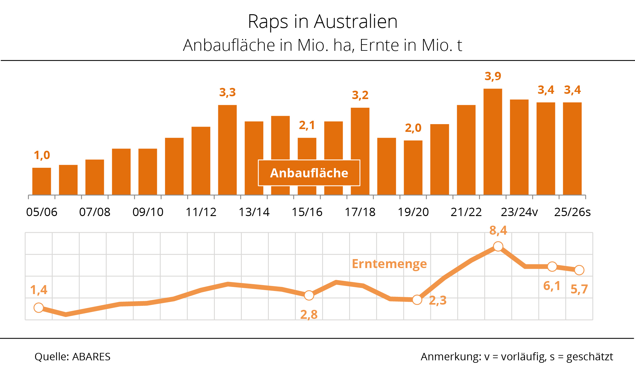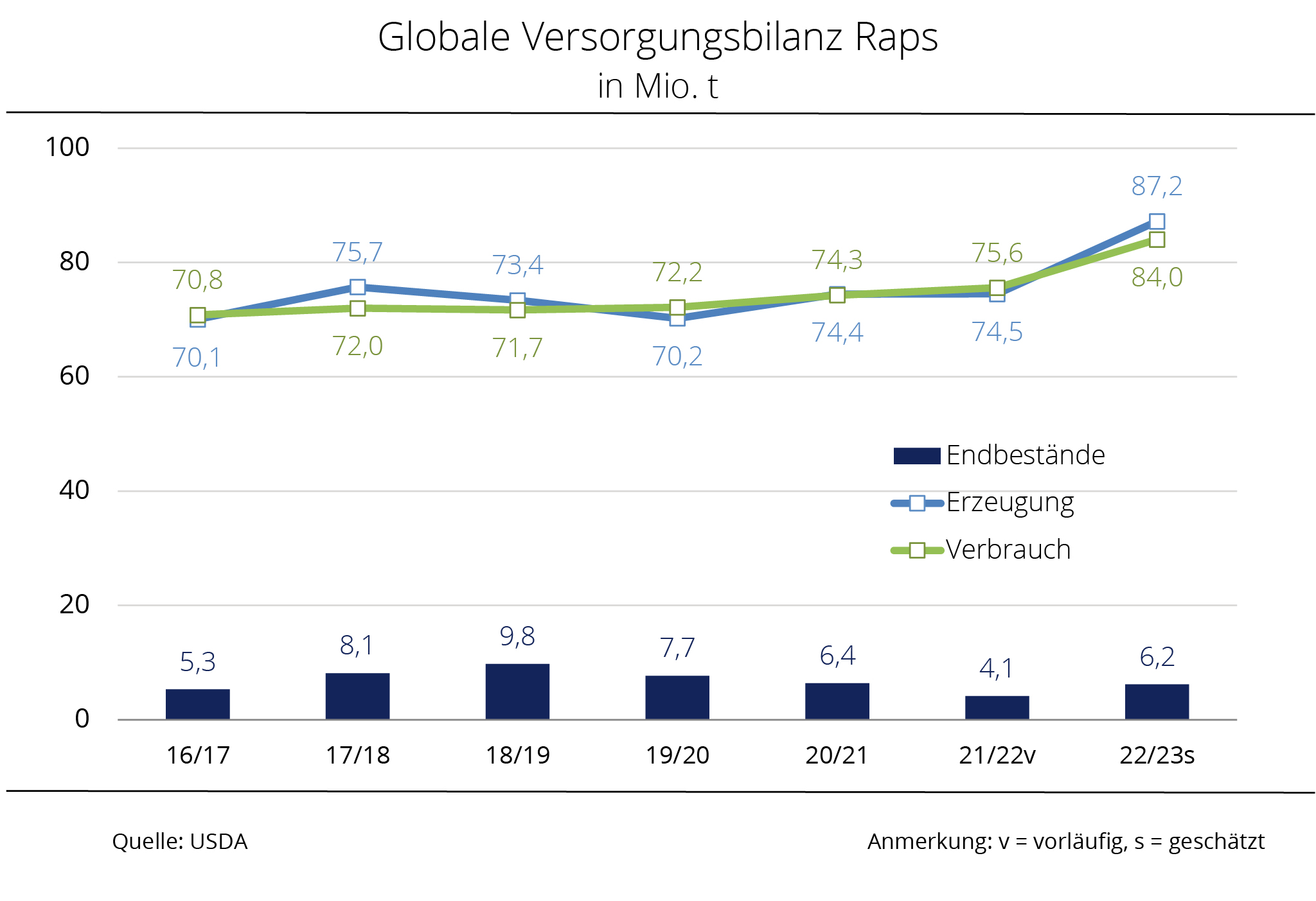 Angesichts einer voraussichtlich größeren Ernte in Russland und Australien dürfte die globale Rapserzeugung 2022/23 einen neuen Höchstwert erreichen. Das US-Landwirtschaftsministeriums erwartet mit 82,5 Mio. t Raps einen neuen Höchstwert.