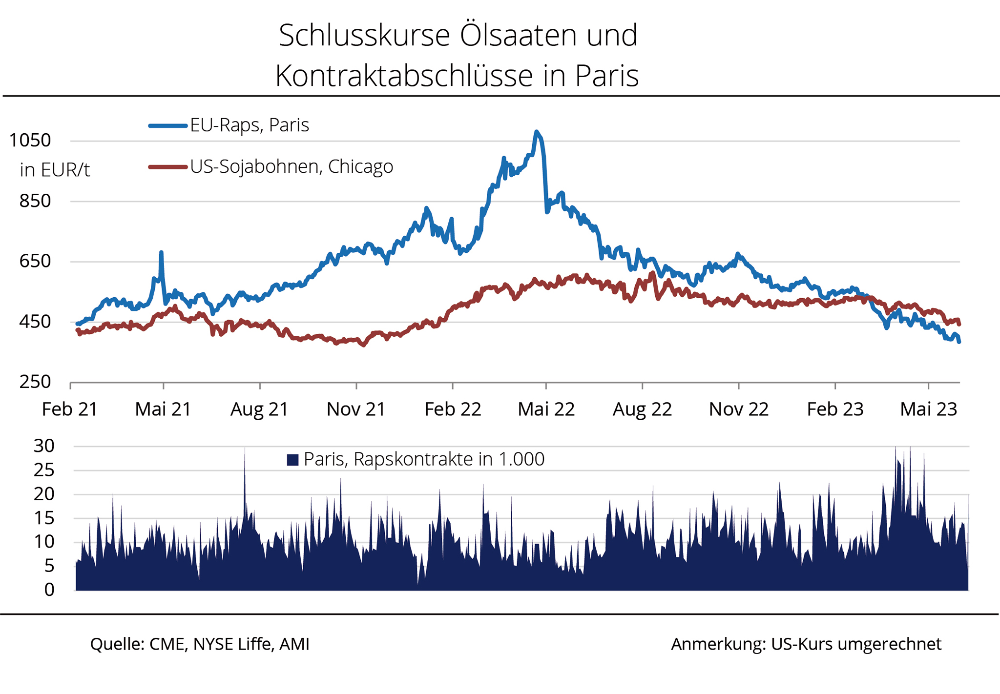 Durch das zunehmende Aufkommen aus der laufenden Ernte geraten die Kassapreise saisonüblich zunehmend unter Druck. Regional überraschten die guten Erträge bei Weizen und Raps, so dass sich in der Folge der Abwärtstrend bei den Erzeugerpreisen verstetigte. Gleichzeitig verteuern Niedrigwasserzuschläge und der Schienentransport die Anlieferung bei den Ölmühlen.