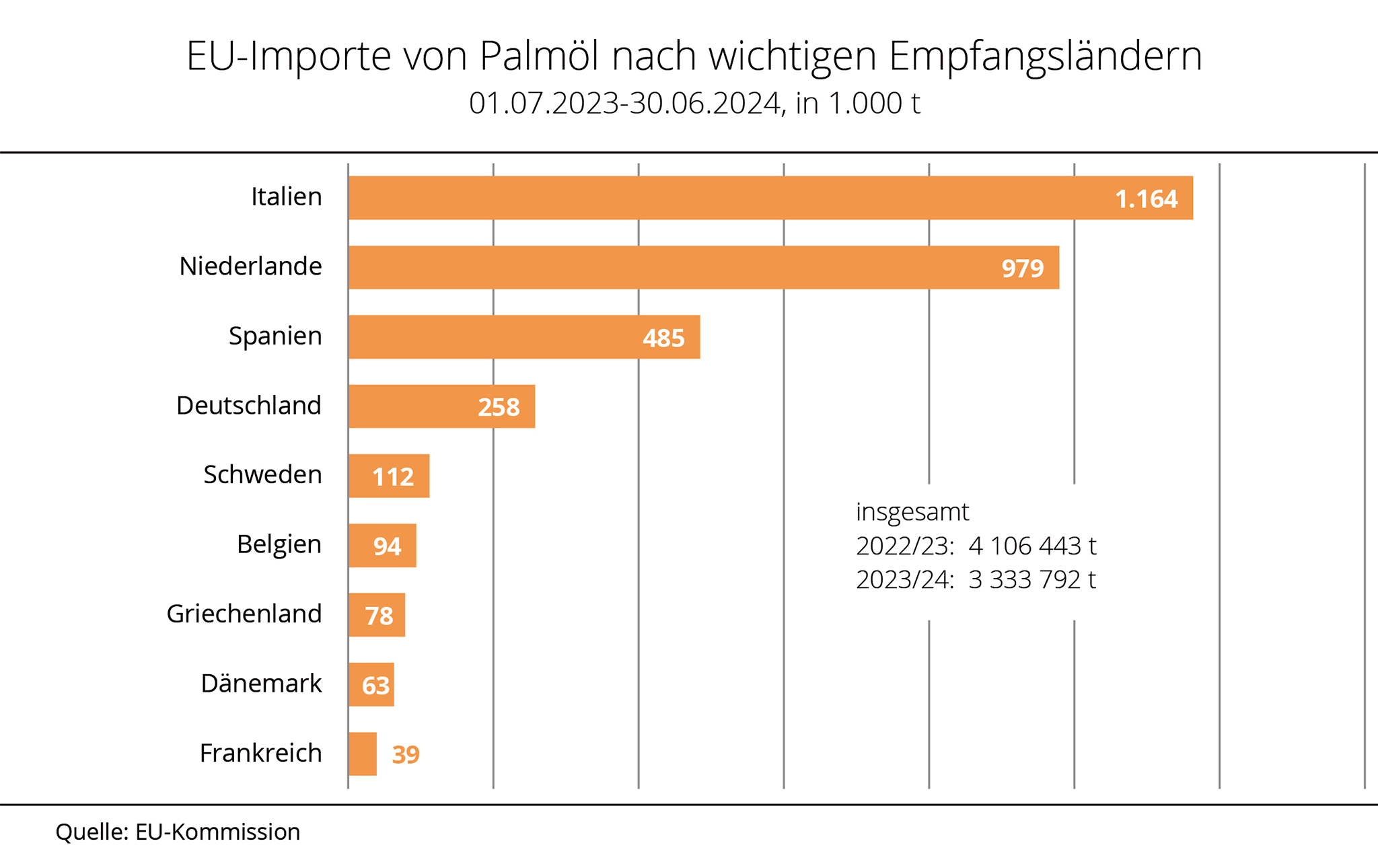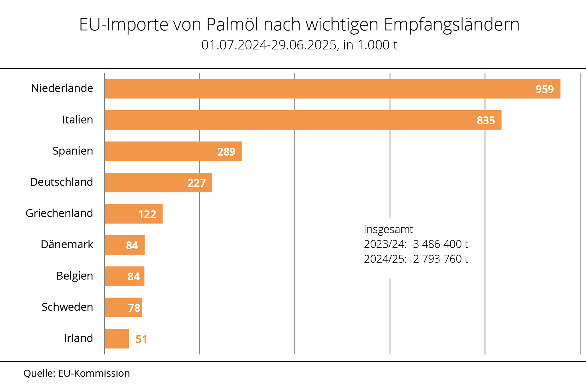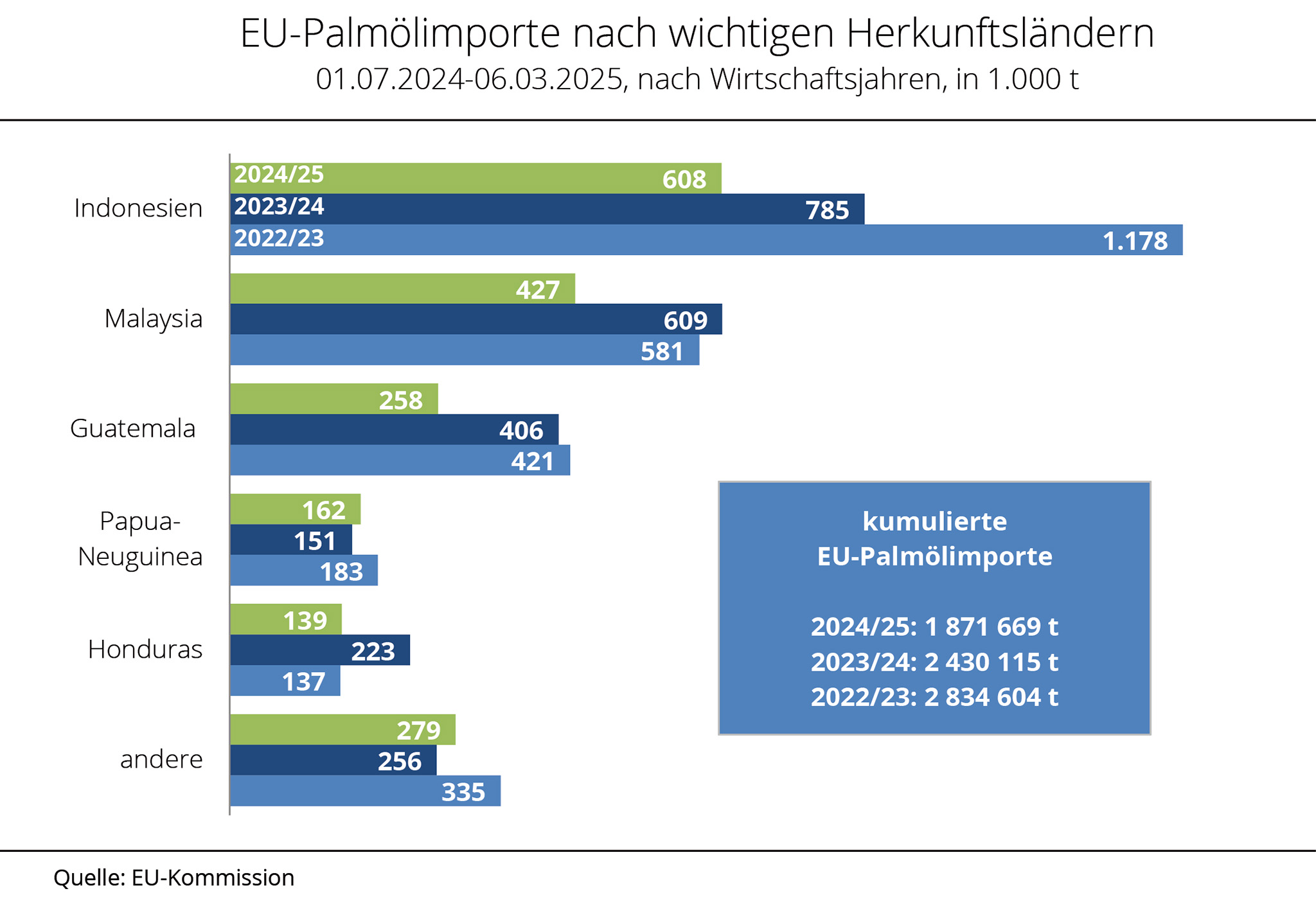 1. Juli 2025 bis zum 3. März 2026 insgesamt 1,9 Mio. t Palmöl aus dem Ausland und damit etwas weniger als die knapp 2,0 Mio. t im Vorjahreszeitraum. Zwischen Juli 2023 und März 2024 bezog die EU noch rund 2,4 Mio. t des tropischen Öls.