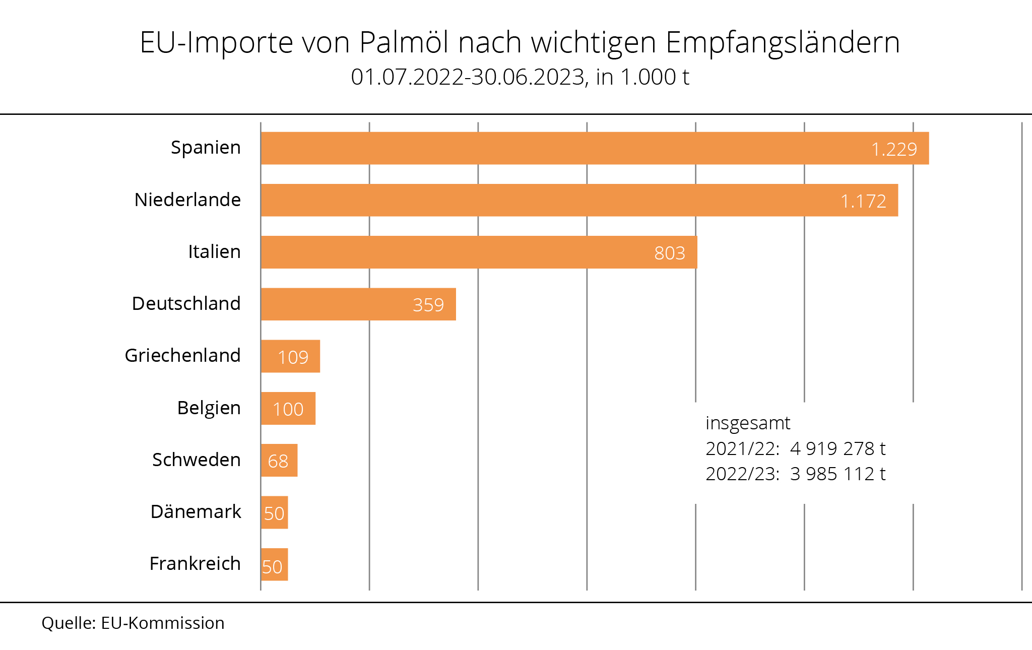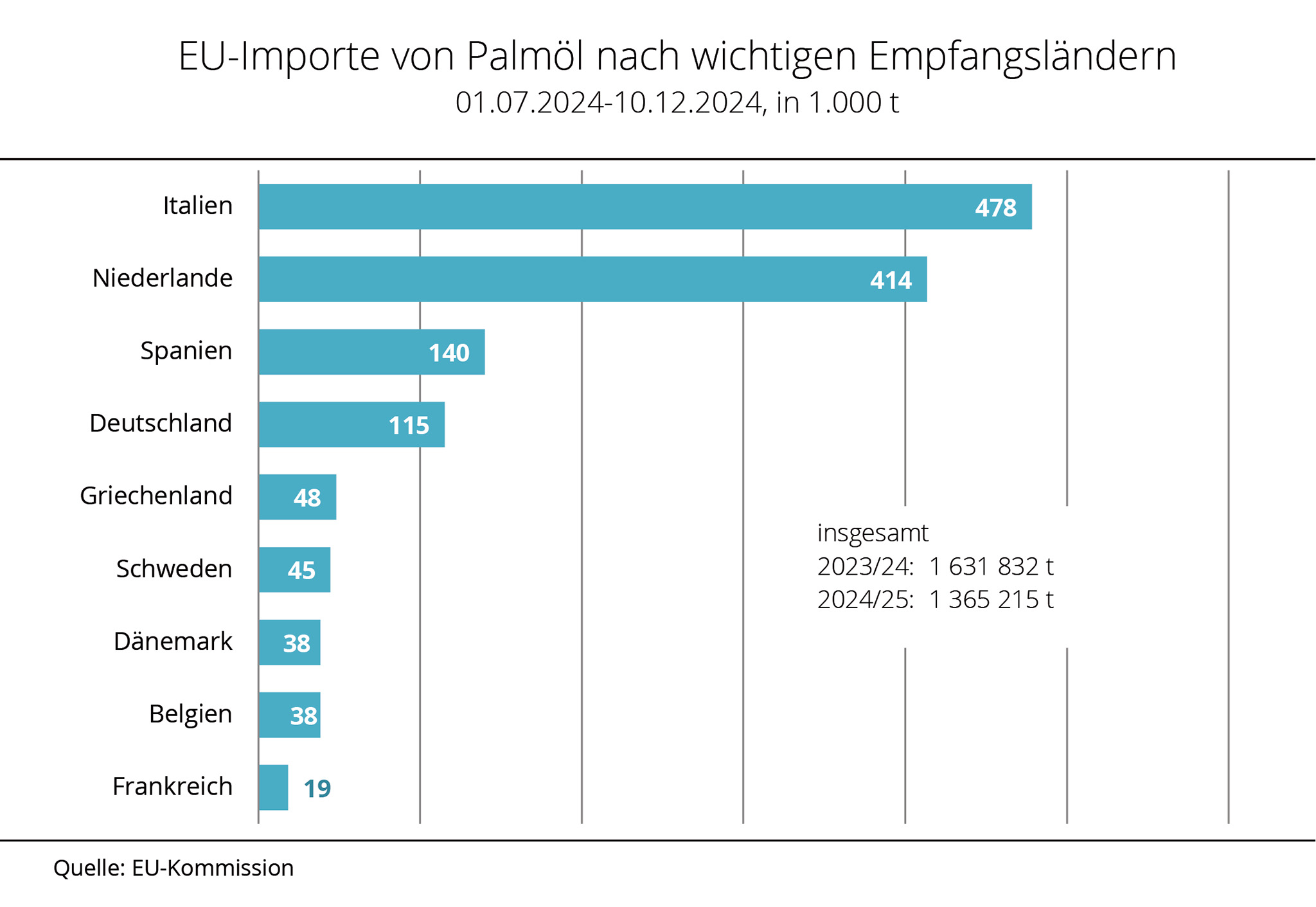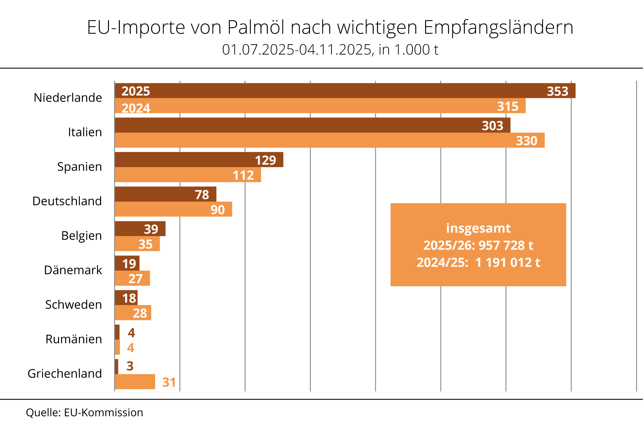 1. Juli 2025 bis zum 3. März 2026 insgesamt 1,9 Mio. t Palmöl aus dem Ausland und damit etwas weniger als die knapp 2,0 Mio. t im Vorjahreszeitraum. Zwischen Juli 2023 und März 2024 bezog die EU noch rund 2,4 Mio. t des tropischen Öls.