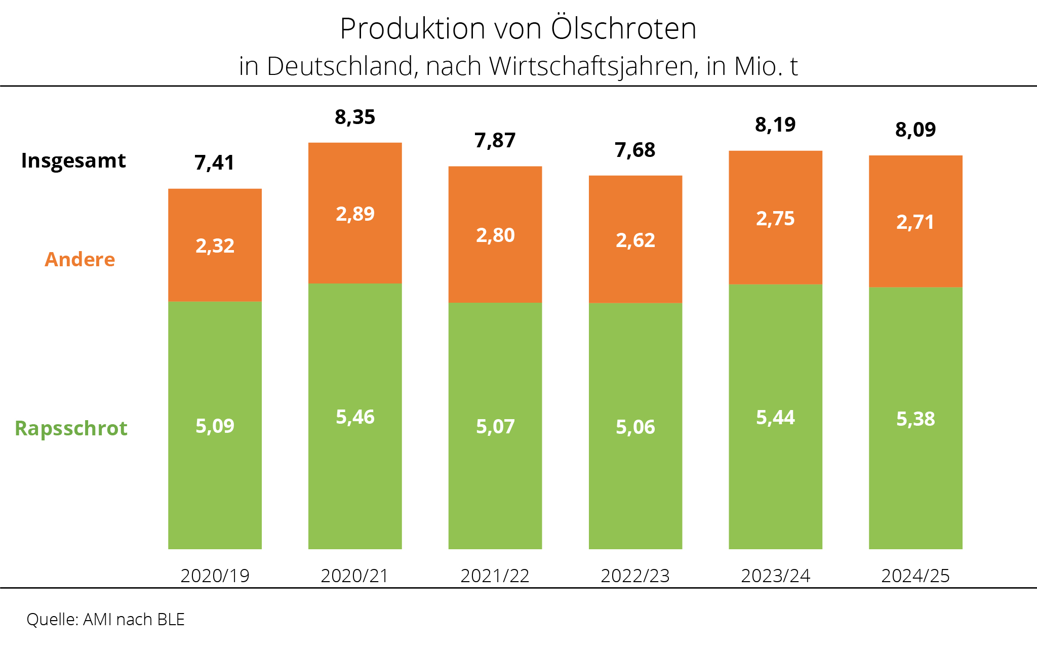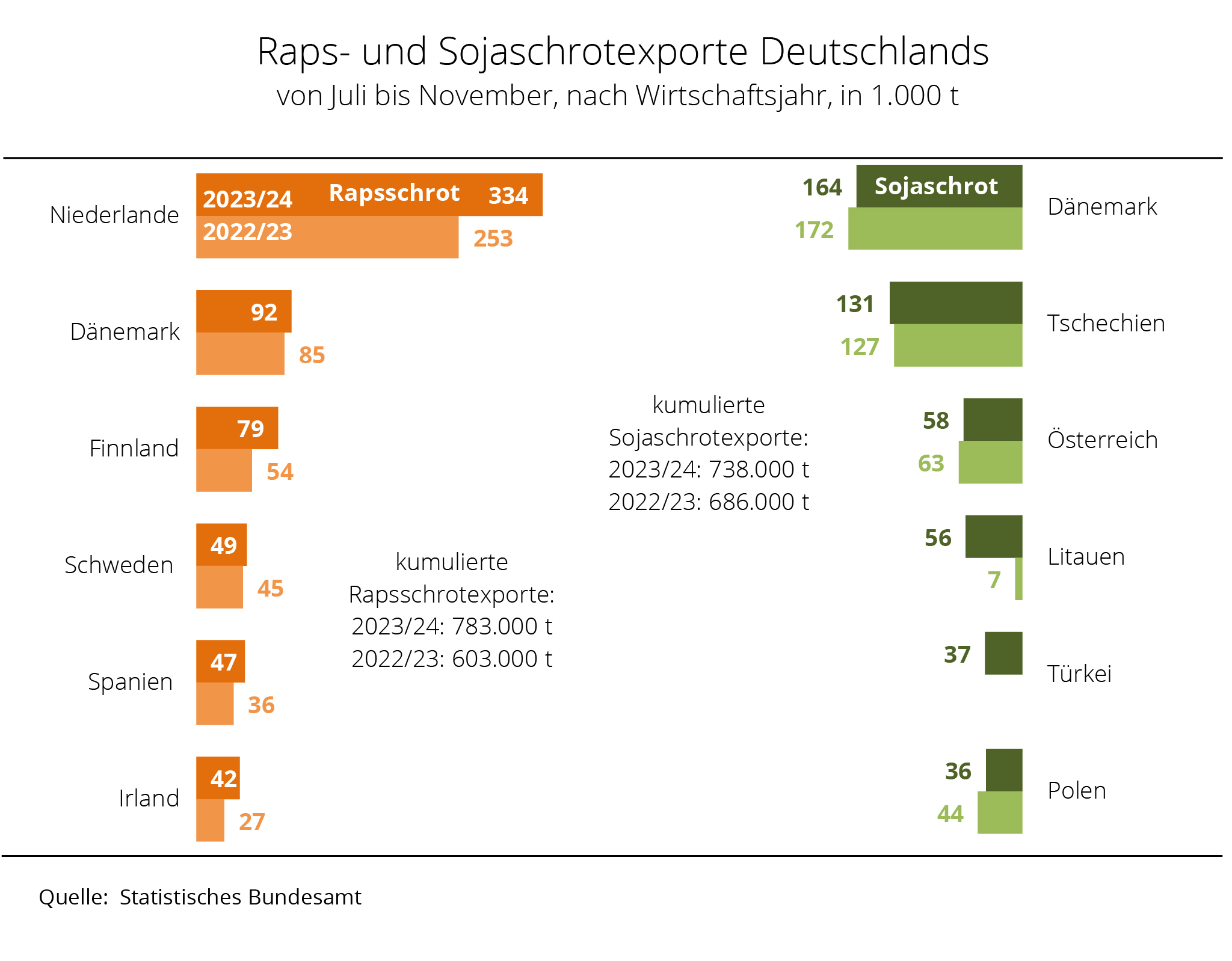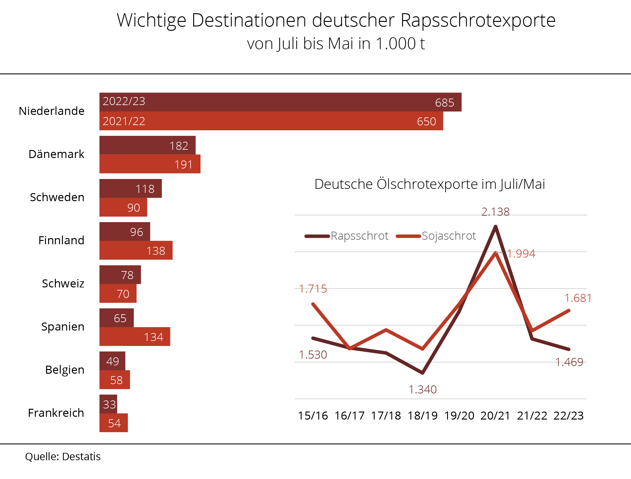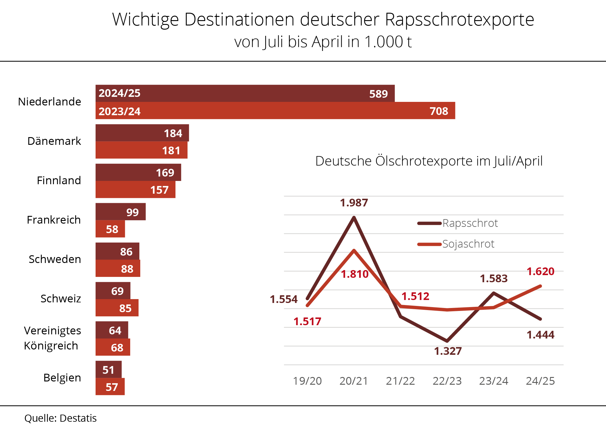 Deutsches Rapsschrot wird hauptsächlich in die EU-Mitgliedstaaten geliefert (rund 1,45 der 1,55 Mio. t). Mit 660.000 t floss das meiste davon in die Niederlande. Damit hat sich das Volumen gegenüber dem Vorjahreszeitraum um fast ein Drittel reduziert. Um fast zwei Drittel schrumpften die Rapsschrotlieferungen nach Frankreich, nach Spanien wurden 56 % weniger ausgeführt. Beide Länder hatten aufgrund der eigenen größeren Rapsernte weniger Bedarf an Rapsschrotlieferungen aus dem Ausland.
