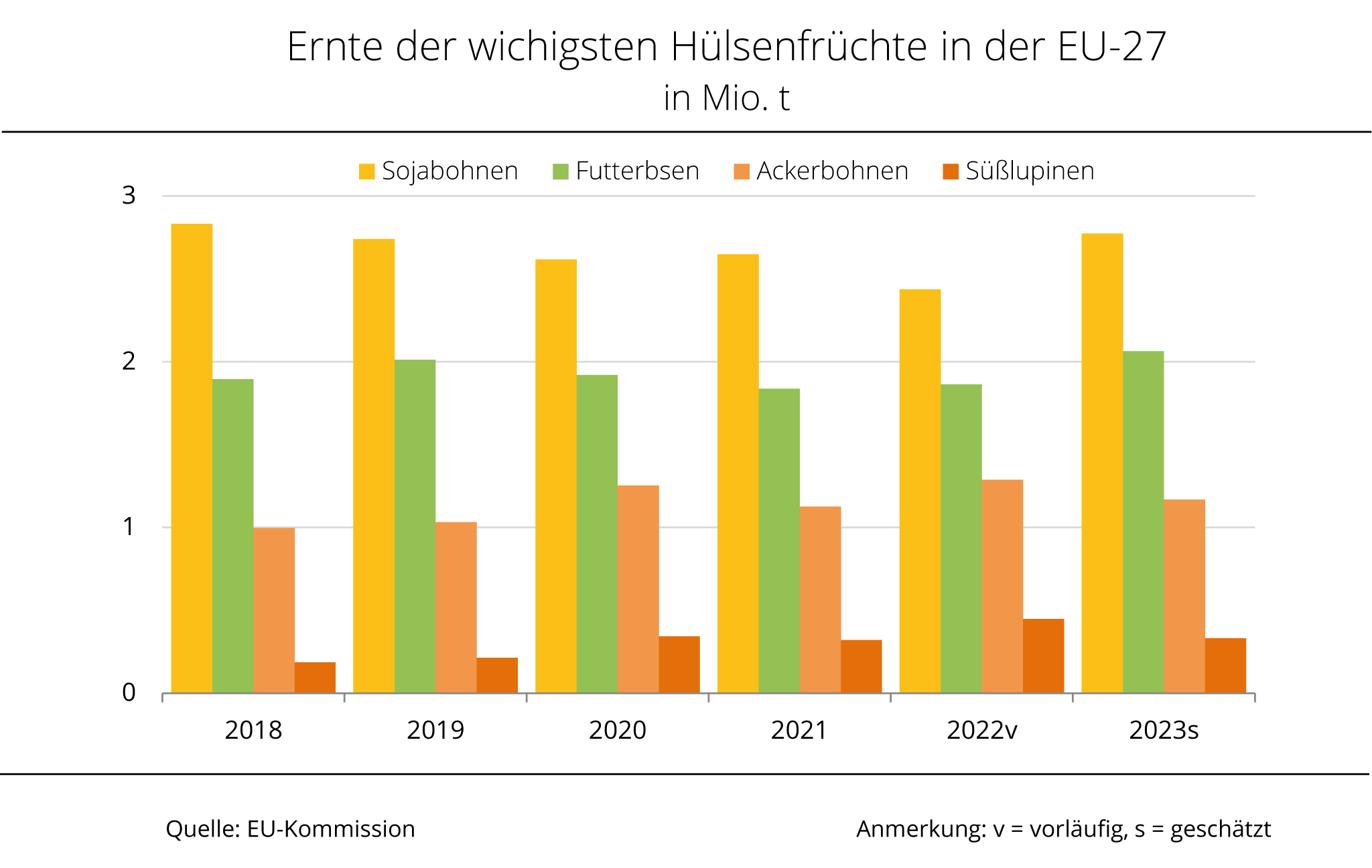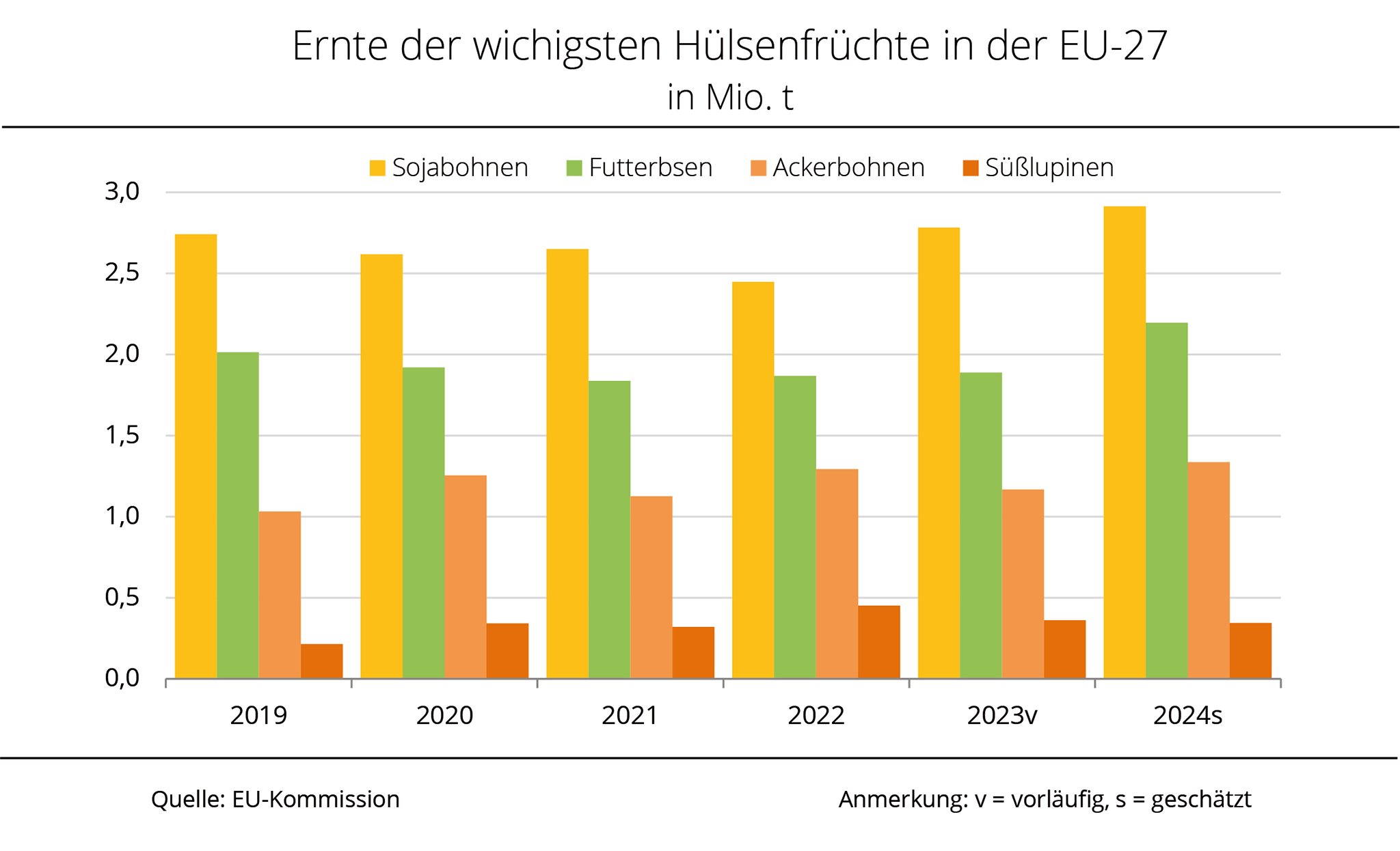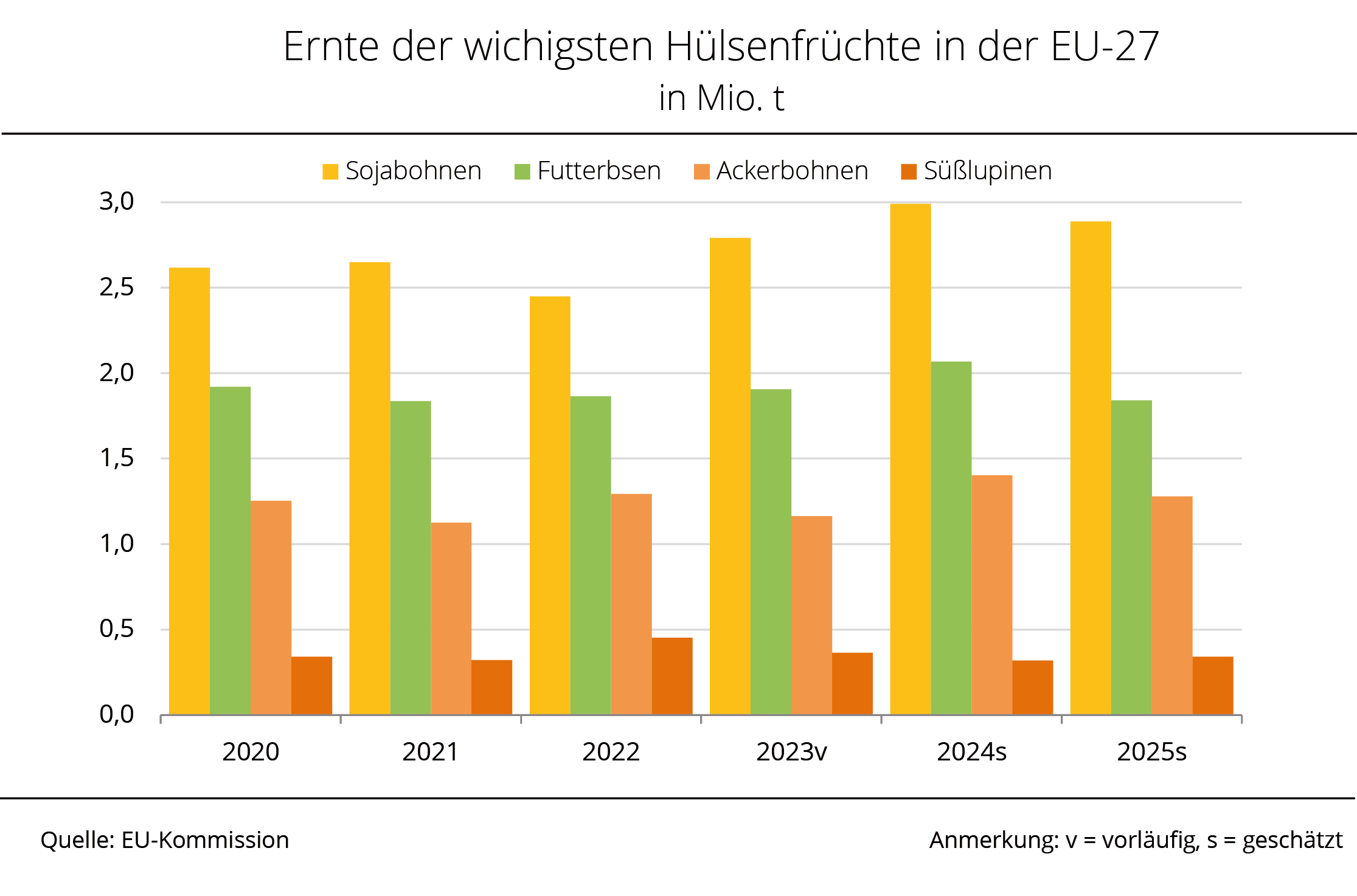 Vor allem Futtererbsen werden mit 2,3 Mio. t und einem Minus von voraussichtlich 6 % im Vergleich zum Vorjahr weniger gedroschen. Auch die Ernte von Ackerbohnen dürfte mit 1,4 Mio. t rund 3 % kleiner ausfallen. Mit 2,8 Mio. t und einem Anteil von 40 % an der gesamten Leguminosenernte bleibt die Sojabohne die wichtigste Hülsenfrucht in der Union. Aufgrund einer größeren Anbaufläche dürfte die Sojaernte