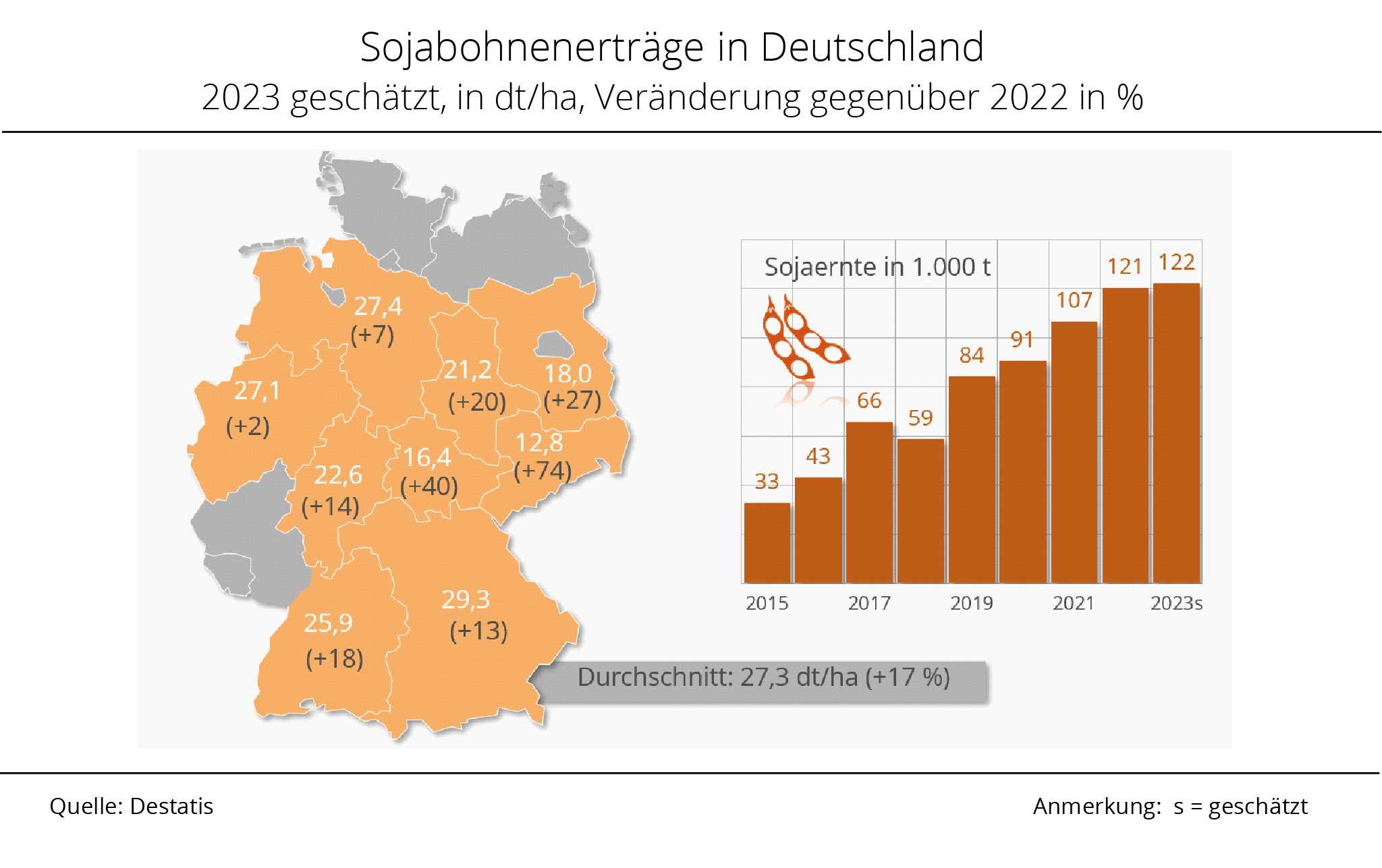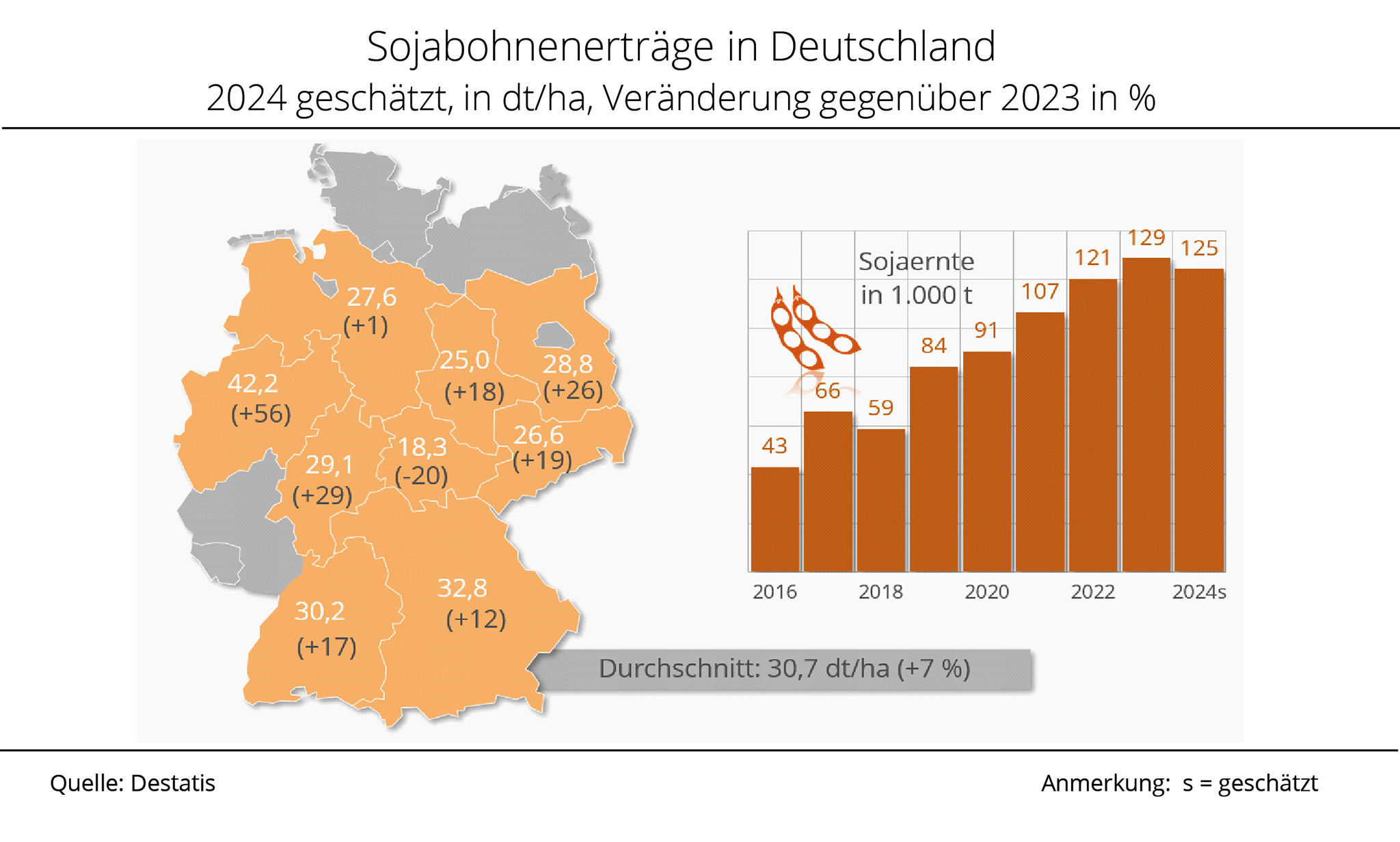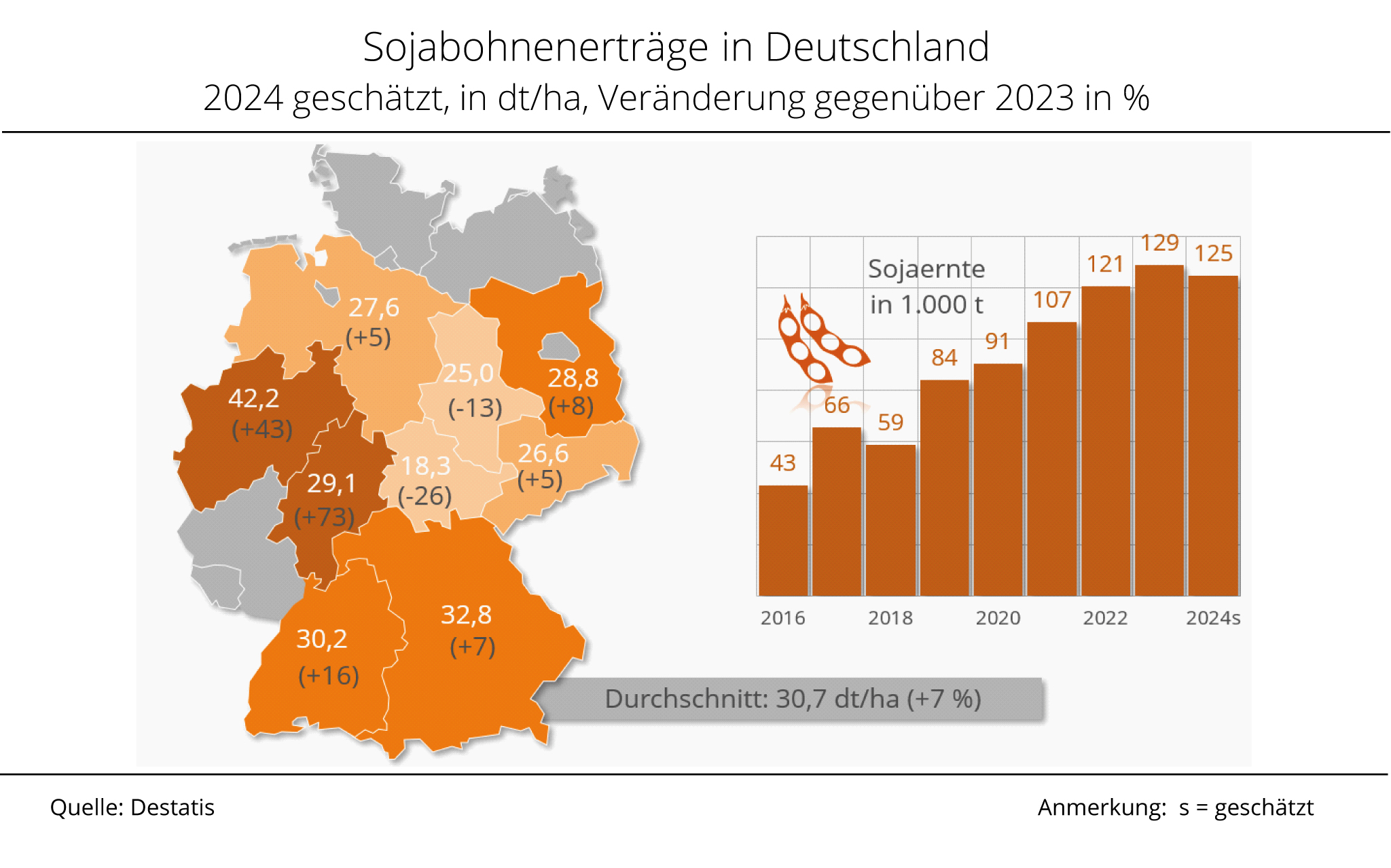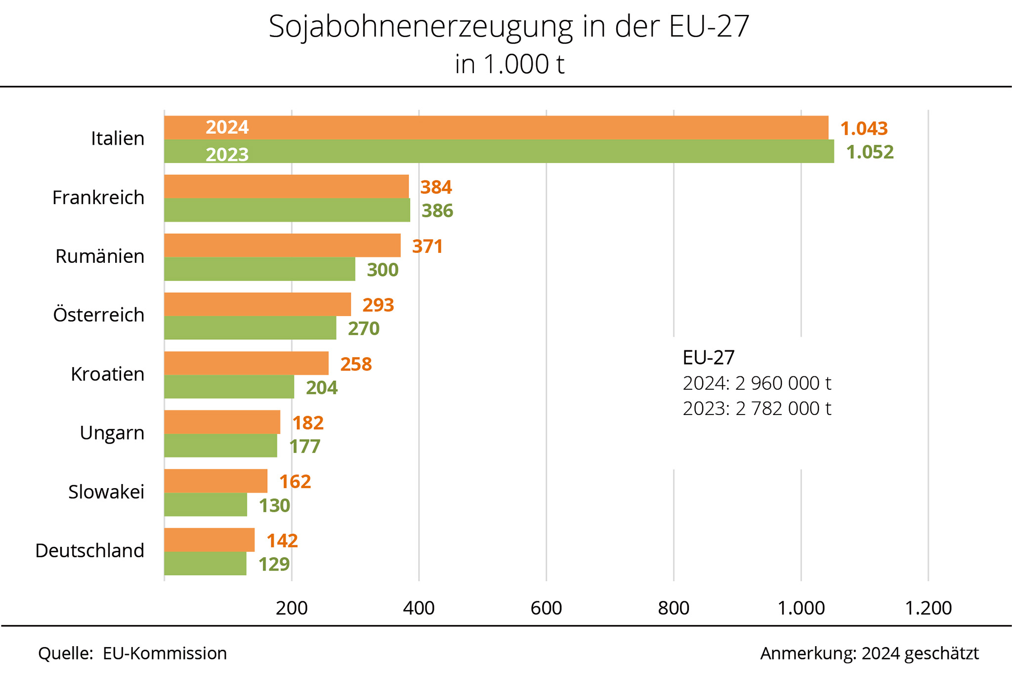 Vor allem Futtererbsen werden mit 2,3 Mio. t und einem Minus von voraussichtlich 6 % im Vergleich zum Vorjahr weniger gedroschen. Auch die Ernte von Ackerbohnen dürfte mit 1,4 Mio. t rund 3 % kleiner ausfallen. Mit 2,8 Mio. t und einem Anteil von 40 % an der gesamten Leguminosenernte bleibt die Sojabohne die wichtigste Hülsenfrucht in der Union. Aufgrund einer größeren Anbaufläche dürfte die Sojaernte
