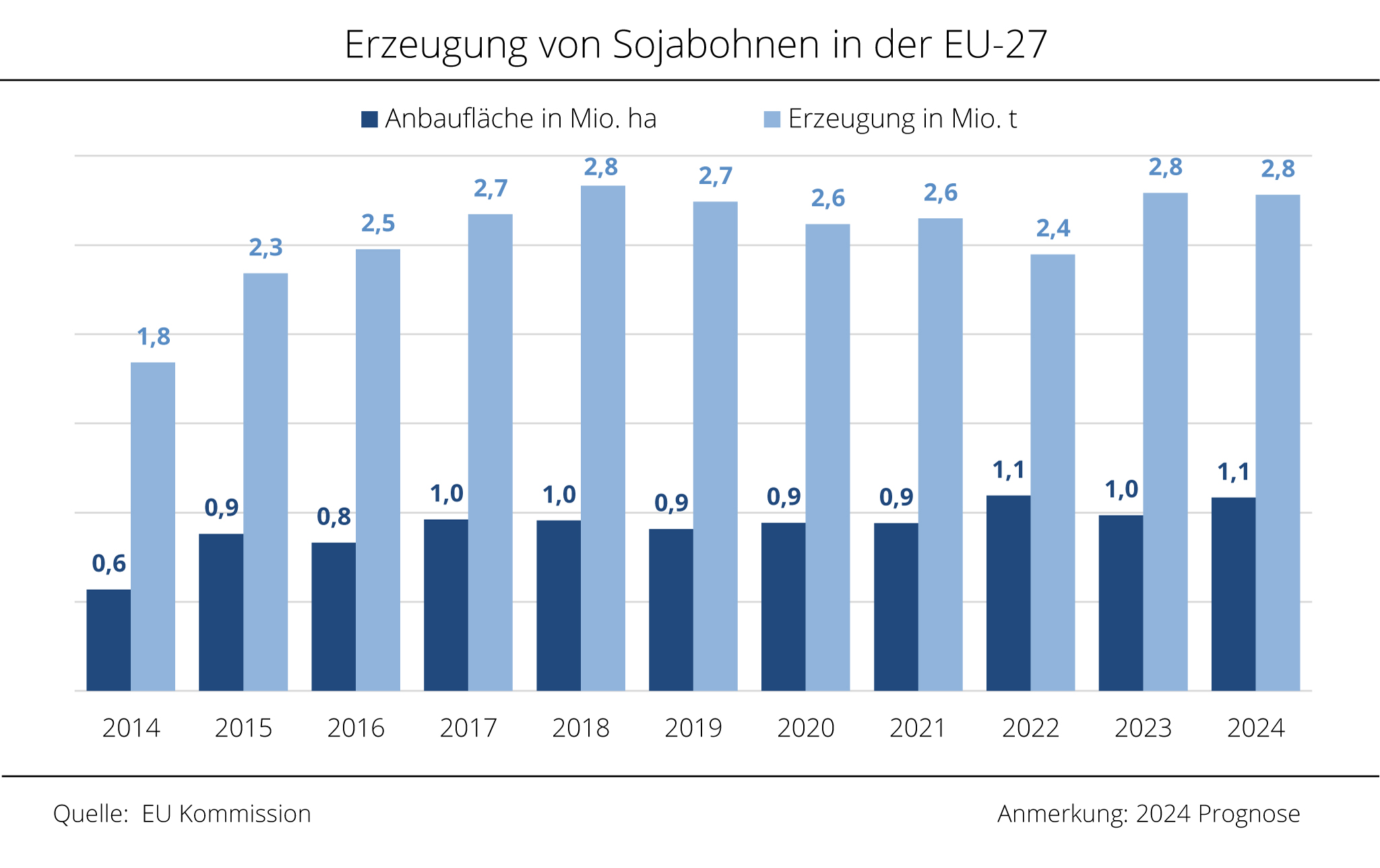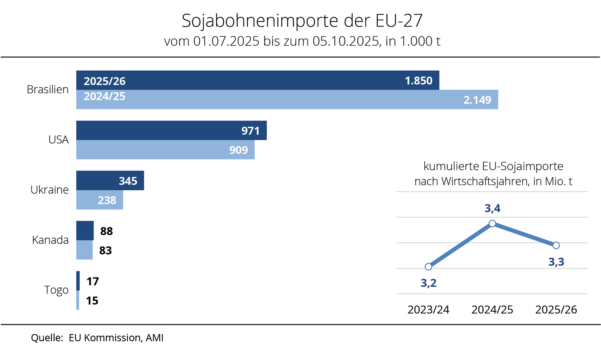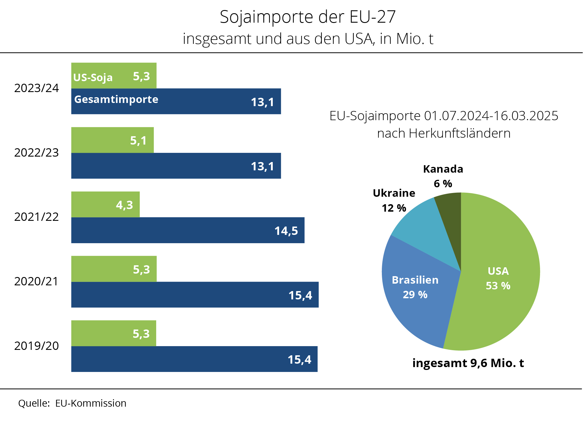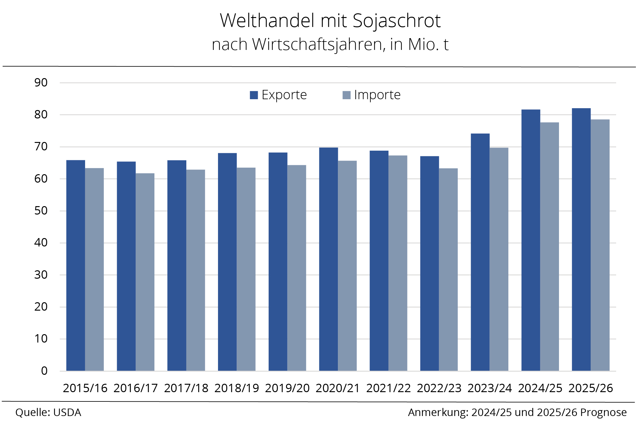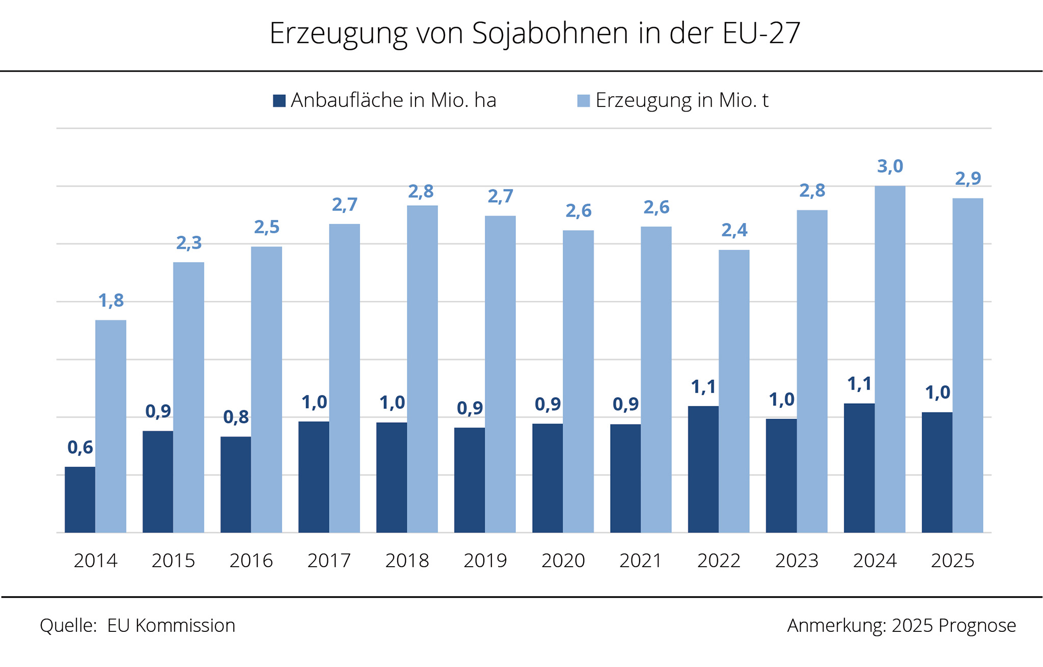 Ursache für den Rückgang der Sojaimporte ist nach Einschätzung der Union zur Förderung von Oel- und Proteinpflanzen e. V. (UFOP) der in der EU von 2021 bis 2023 zu verzeichnende Rückgang bei den Schweineschlachtungen von 250 Mio. auf 220 Mio. und die anschließende Aufwärtsentwicklung auf 227 Mio. Schlachtungen in 2025.