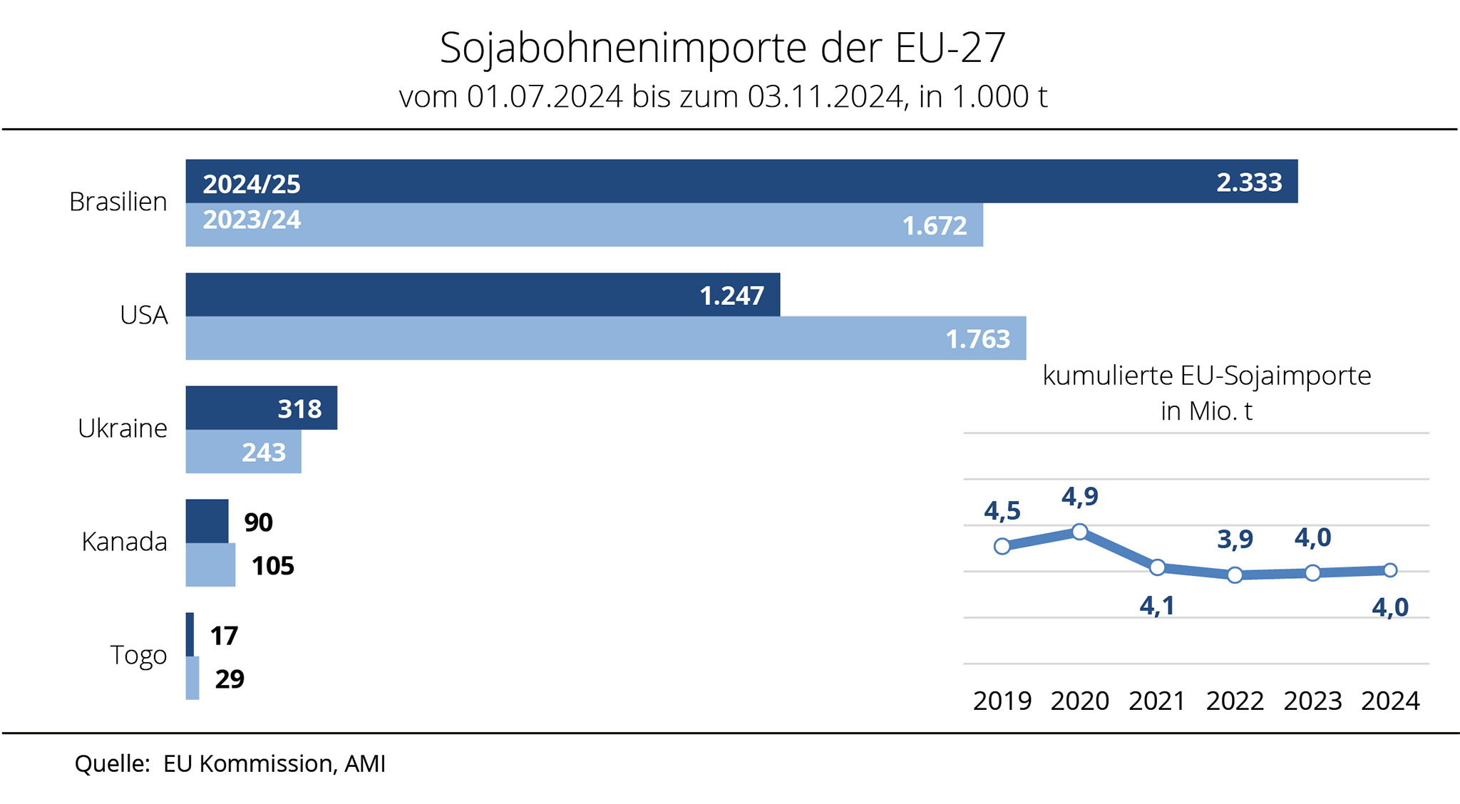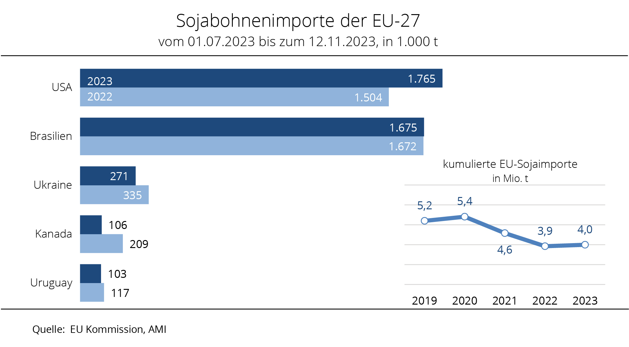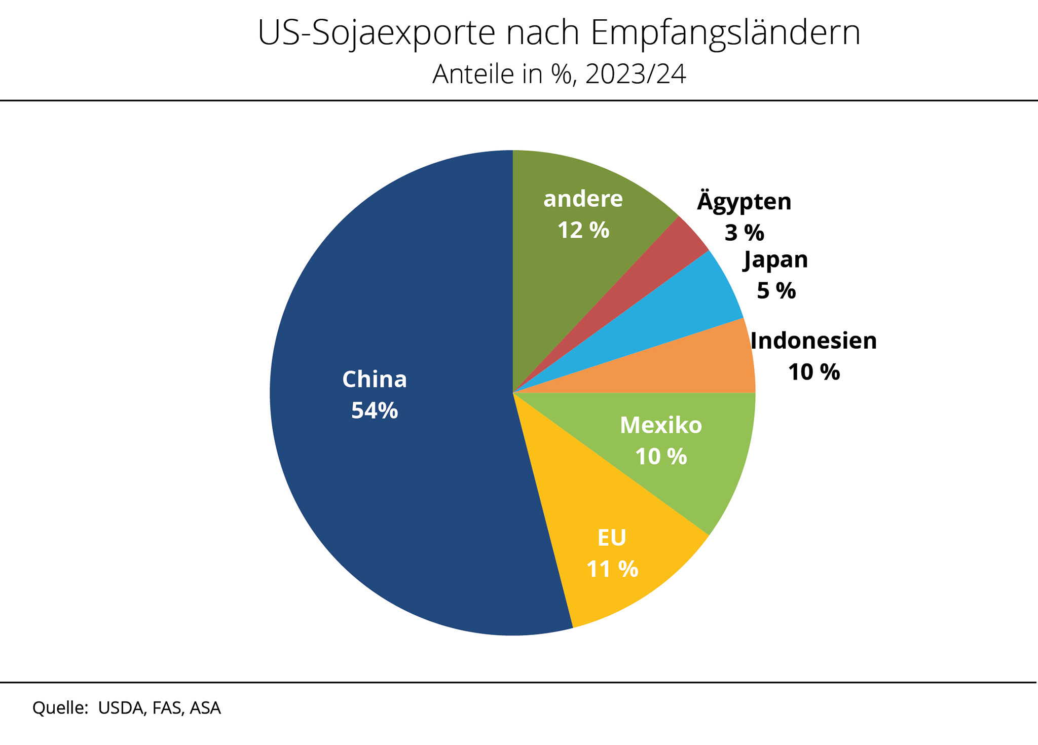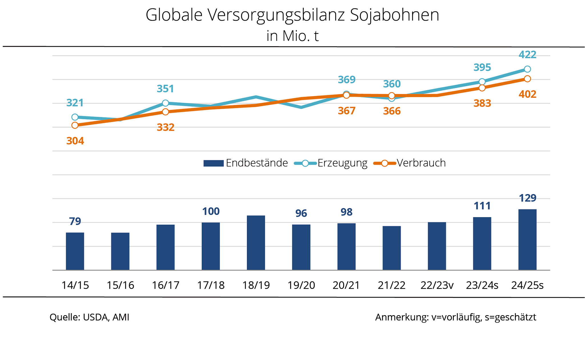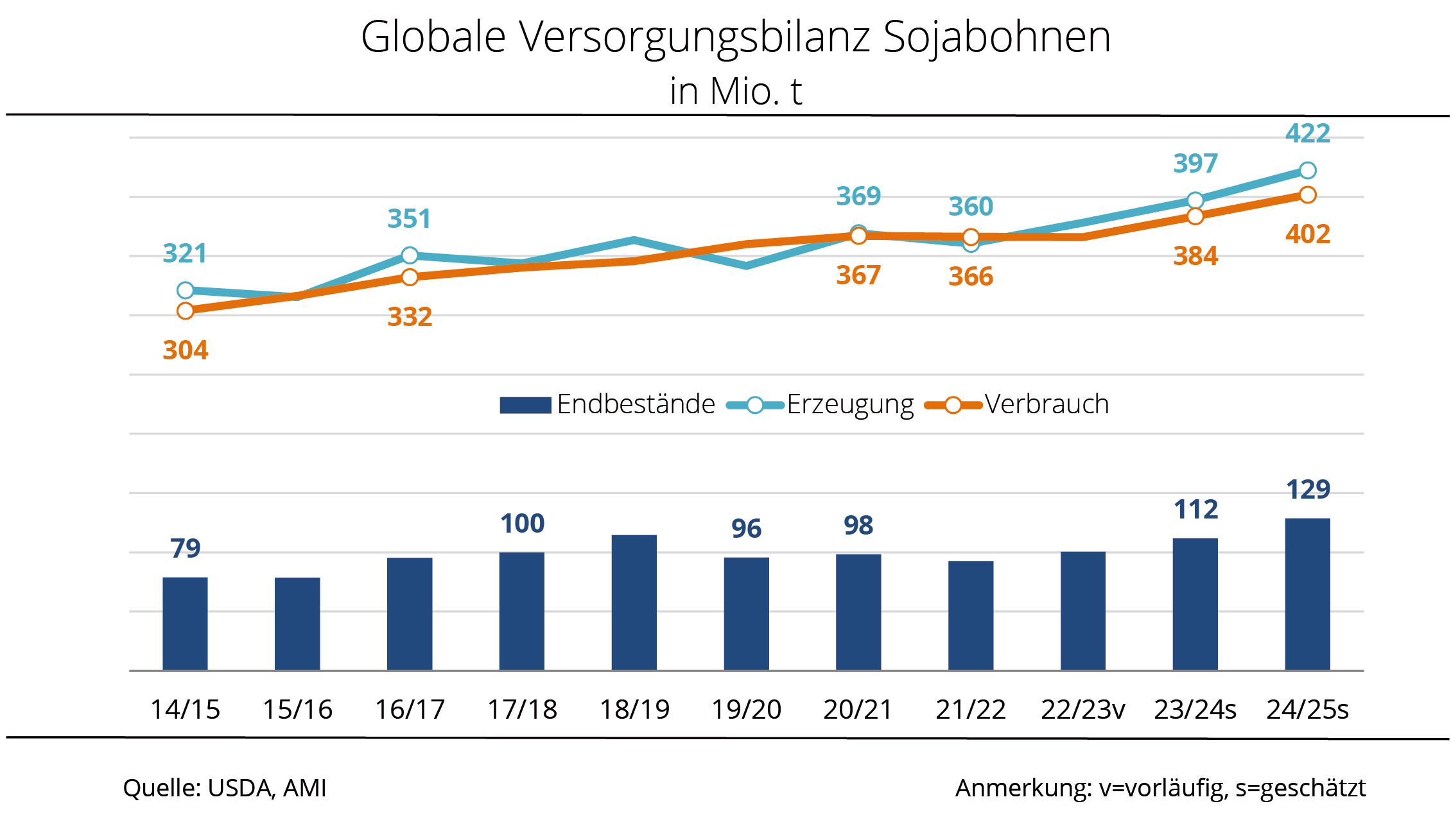 Ursache für den Rückgang der Sojaimporte ist nach Einschätzung der Union zur Förderung von Oel- und Proteinpflanzen e. V. (UFOP) der in der EU von 2021 bis 2023 zu verzeichnende Rückgang bei den Schweineschlachtungen von 250 Mio. auf 220 Mio. und die anschließende Aufwärtsentwicklung auf 227 Mio. Schlachtungen in 2025.