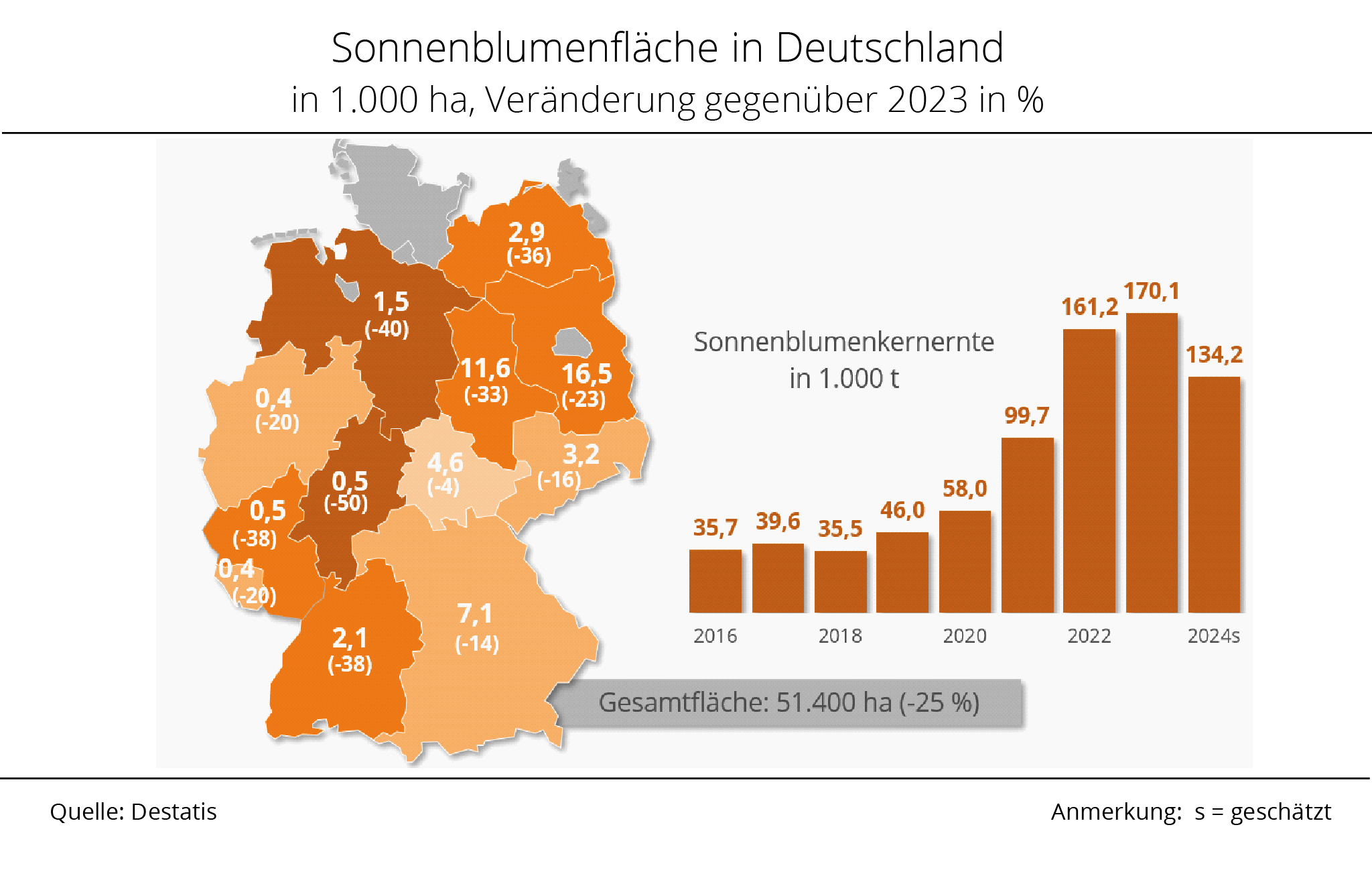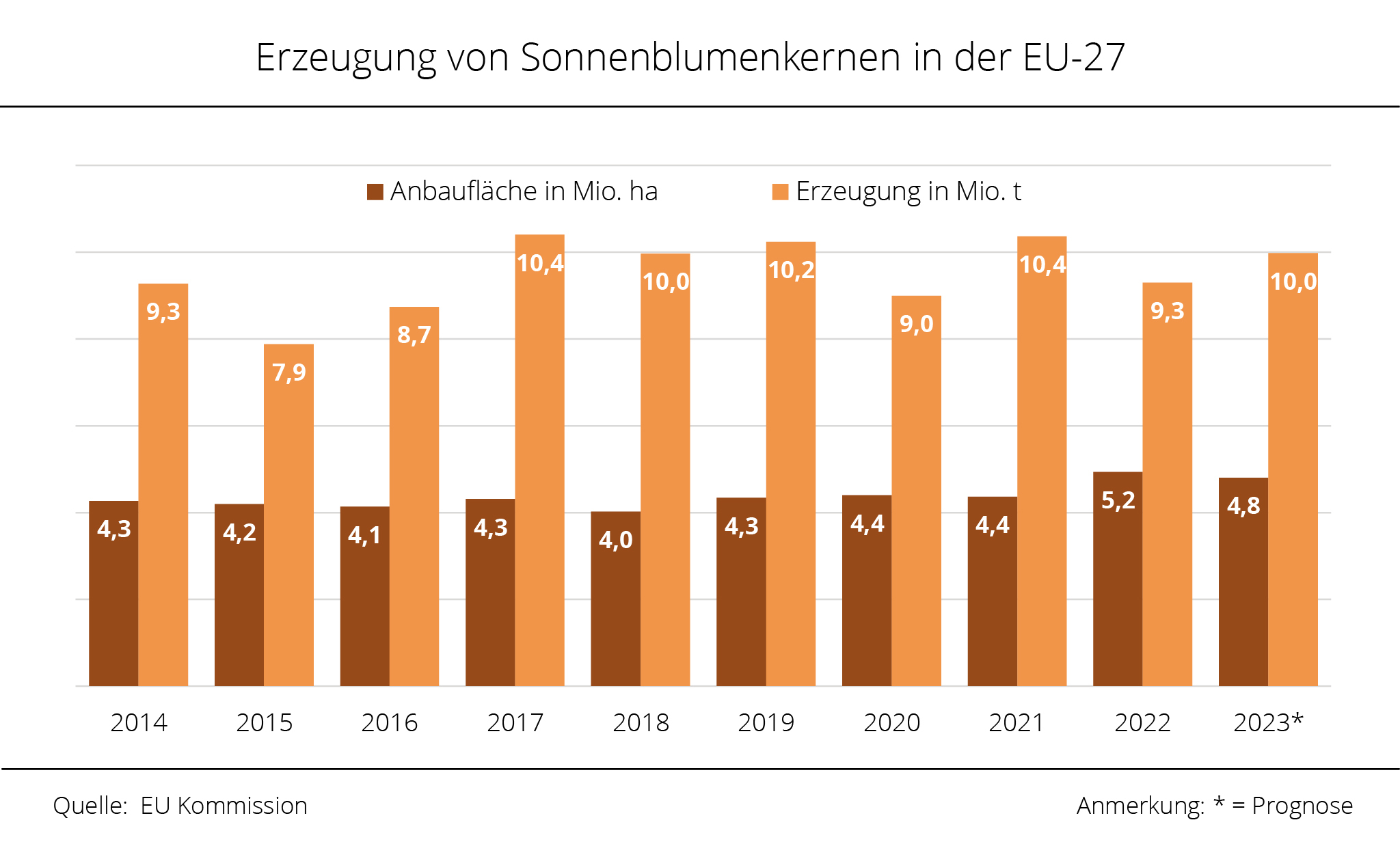 Im Vergleich zu den großen Erzeugern von Sonnenblumenkernen spielt Deutschland in der EU damit weiterhin eine eher untergeordnete Rolle. Die erneute Anhebung der Anbauprognose spiegelt aber das steigende Interesse der Landwirte nach einer Erweiterung der Fruchtfolge wider, insbesondere an der Einbeziehung einer weiteren Sommerung.