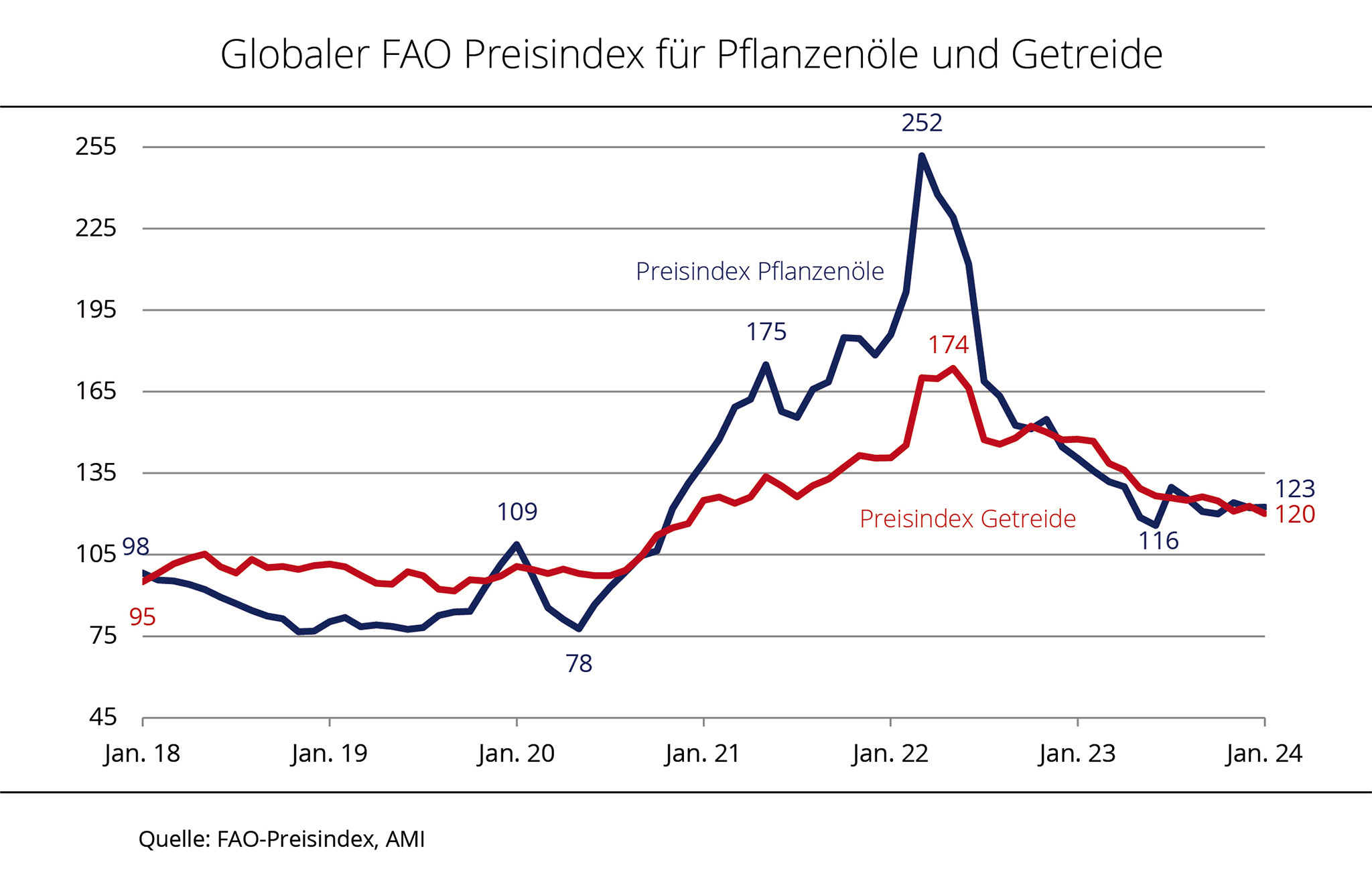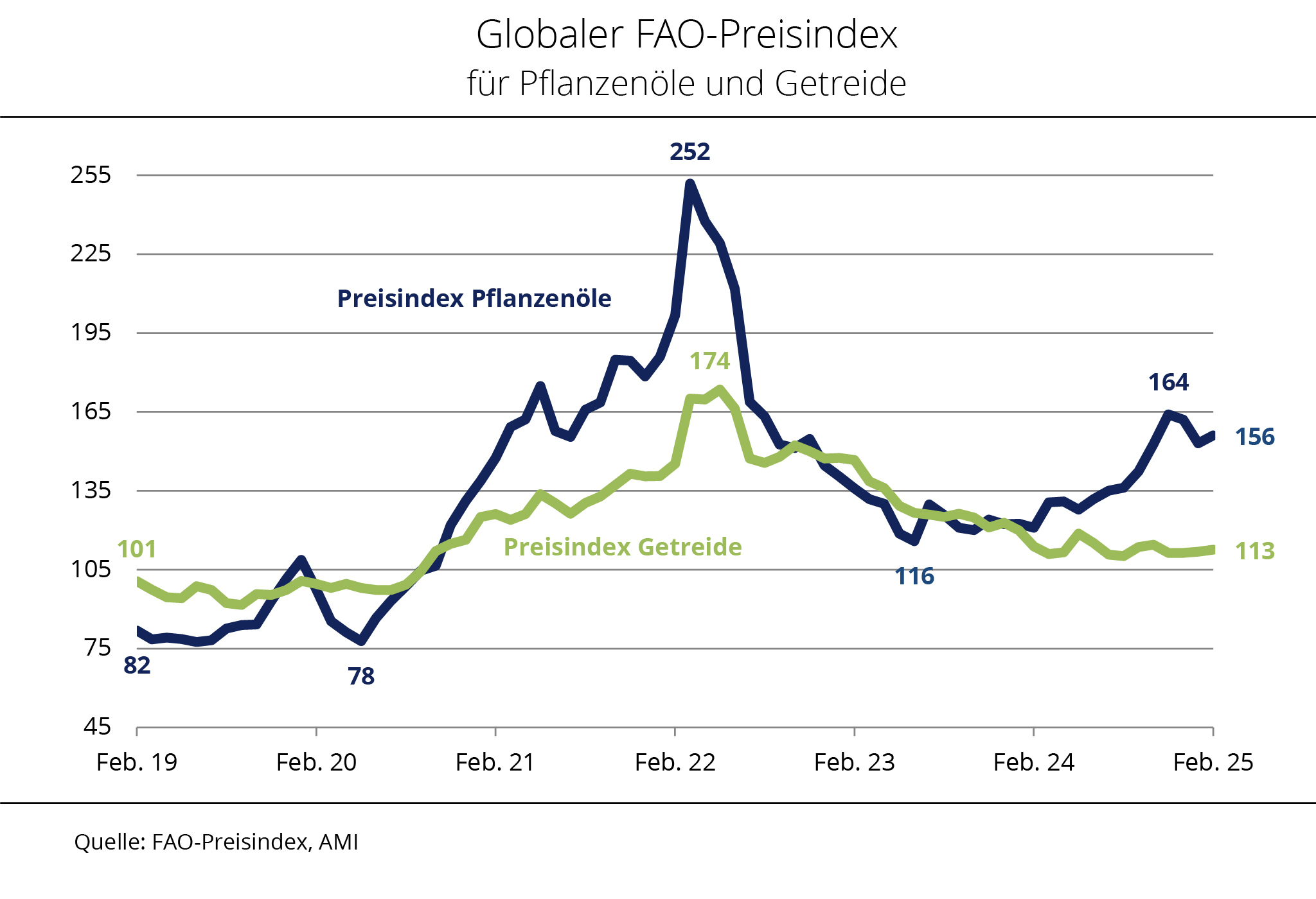 Die Pflanzenölpreise drehten Anfang März ins Plus. Nach der Eskalation im Nahen Osten legte Rohöl mit einem deutlichen Risikoaufschlag zu. Der Ölpreisschock wirkt seither vor allem über den Energie- und Biokraftstoffmarkt in die Agrarmärkte und stützt insbesondere die Notierungen für Pflanzenöle. Höhere Rohölpreise verbessern tendenziell die Wettbewerbsfähigkeit von Biodiesel und damit auch die Nachfrageperspektiven für Soja- und Rapsöl. So wurden für Sojaöl Ende März für 1.155 EUR/t fob deutscher Mühle verlangt und damit rund 6 % mehr als noch Ende Februar. Stützend wirkt hier auch die US-Biokraftstoffpolitik.