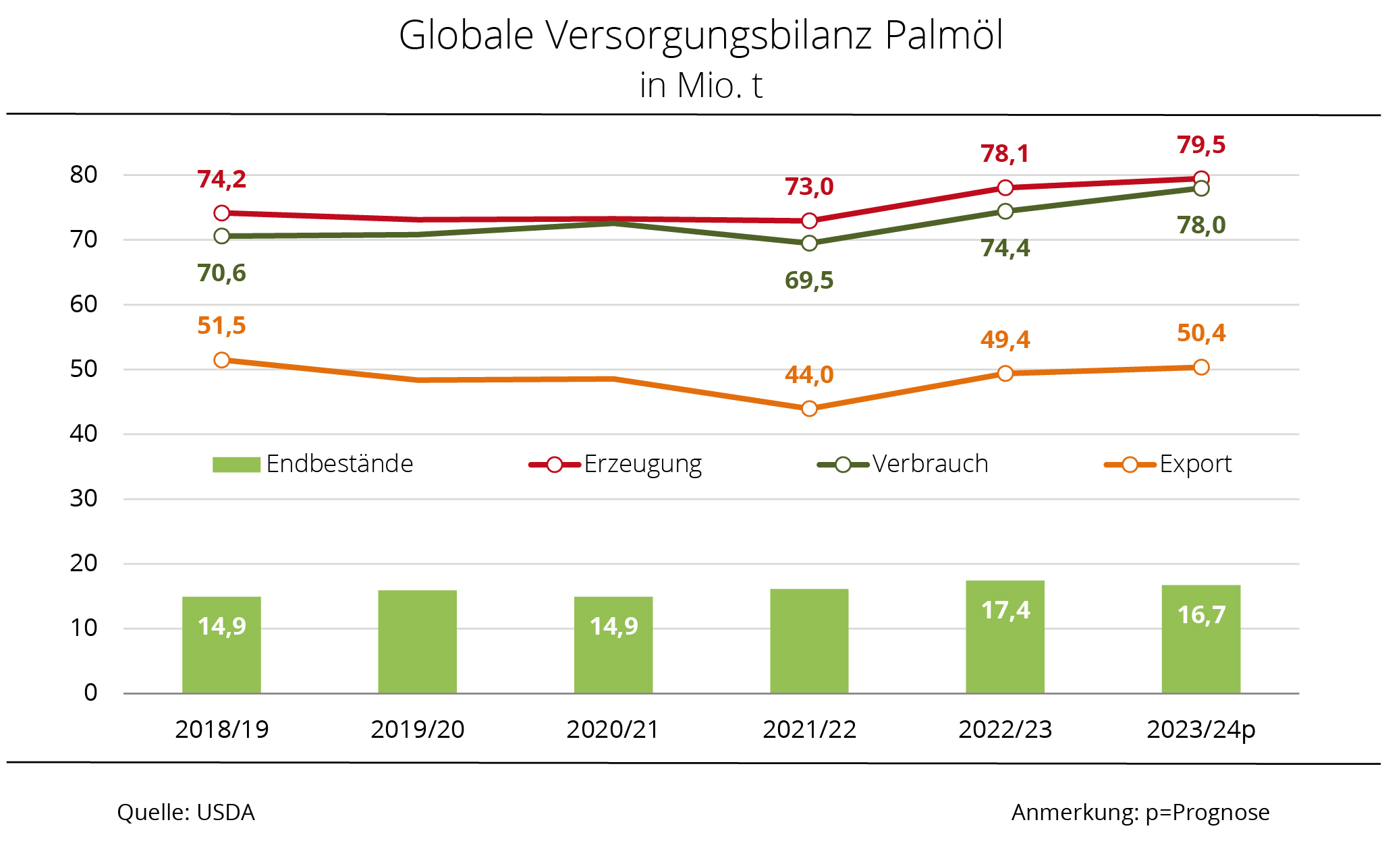 Maßgeblich für diese Schätzung ist insbesondere eine erwartete höhere Produktion in Malaysia und Indonesien. Auch wenn die malaysische Produktion saisonbedingt deutlich gedrosselt ist, stellt das USDA hier aktuell 20,2 Mio. t in Aussicht und damit 820.000 t mehr als im Vorjahr. Indonesien dürfte seine Produktion gegenüber dem Vorjahr um 1,2 Mio. t auf 46,7 Mio. t steigern.