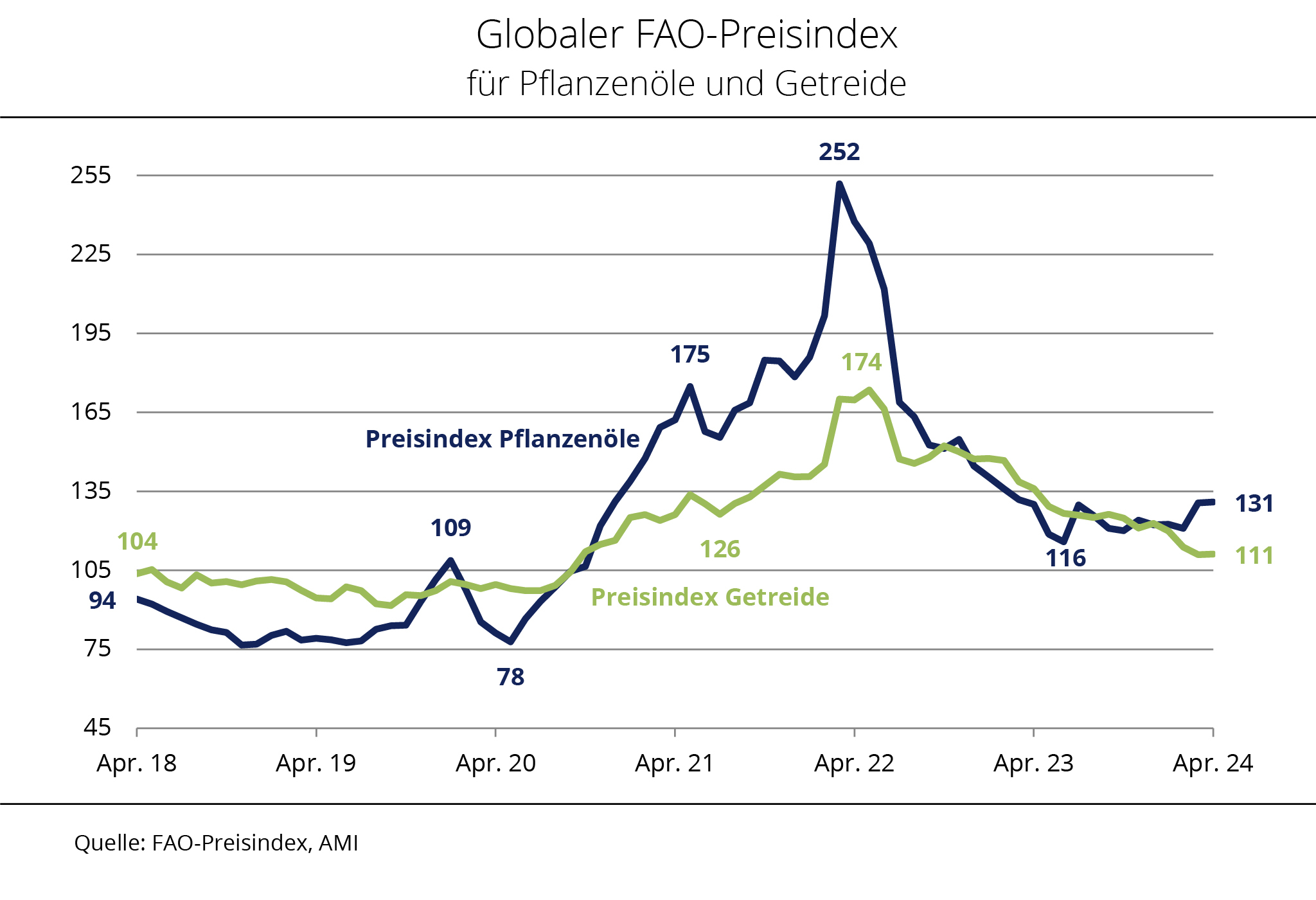 Auch der Palmölpreis stieg seit Anfang März und kletterte mit umgerechnet 1.345 EUR/t zuletzt sogar an die Spitze der Pflanzenölpreise. Unterstützung erhält das tropische Öl insbesondere durch die Erwartung einer steigenden Biodieselnachfrage in den beiden größten Produktionsländern Indonesien und Malaysia. Diese könnte das Exportpotenzial der führenden Palmölanbieter begrenzen und das globale Angebot verknappen. Dem gegenüber steht jedoch die Aussicht auf eine weltweite Rekordproduktion bei einem gleichzeitig rückläufigen Palmölbedarf in der EU.
